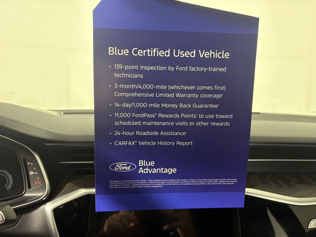 Ford Blue Certified includes:139 point vehicle inspection performed by an ASE Certified technician 3-month/4,000-mile Comprehensive Limited Warranty coverage that is fully competitive with other online retailers Blue Certification includes 11,000 FordPass Rewards Points For other manufacturers not listed above, Comprehensive Coverage is provided for 3 months or 4,000 miles, whichever comes first, from the signature date of the Ford Blue Advantage â" Blue Certified purchase. Compr
