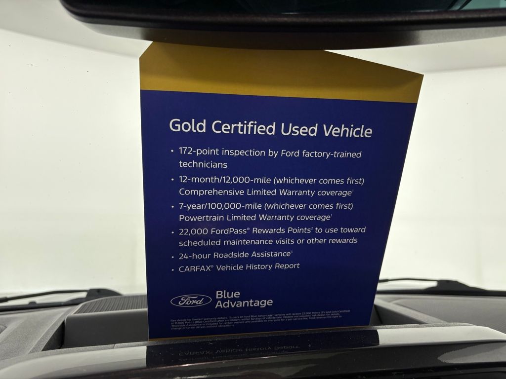 172 point vehicle inspection performed by a Ford Certified technician. 12-month/12,000-mile Comprehensive Limited Warranty coverage 7-year/100,000-mile Powertrain Limited Warranty coverage Gold Certification includes 22,000 FordPass Rewards Points Comprehensive Coverage: 12 months or 12,000 miles, whichever comes first, from the expiration of the new-vehicle bumperto-bumper limited warranty coverage or the date of sale as a certified vehicle, whichever is later. Comprehensive Limited Warranty covering 1,000+ components. Powertrain Coverage: 7 years from original new-vehicle warranty start date or 100,000 miles, whichever occurs first. Powertrain Limited Warranty covering select major components. 24/7 Roadside Assistance Travel expense reimbursement Rental car reimbursement SiriusXM 3 month trial Local home delivery Test-Drive at home. Recent Arrival!