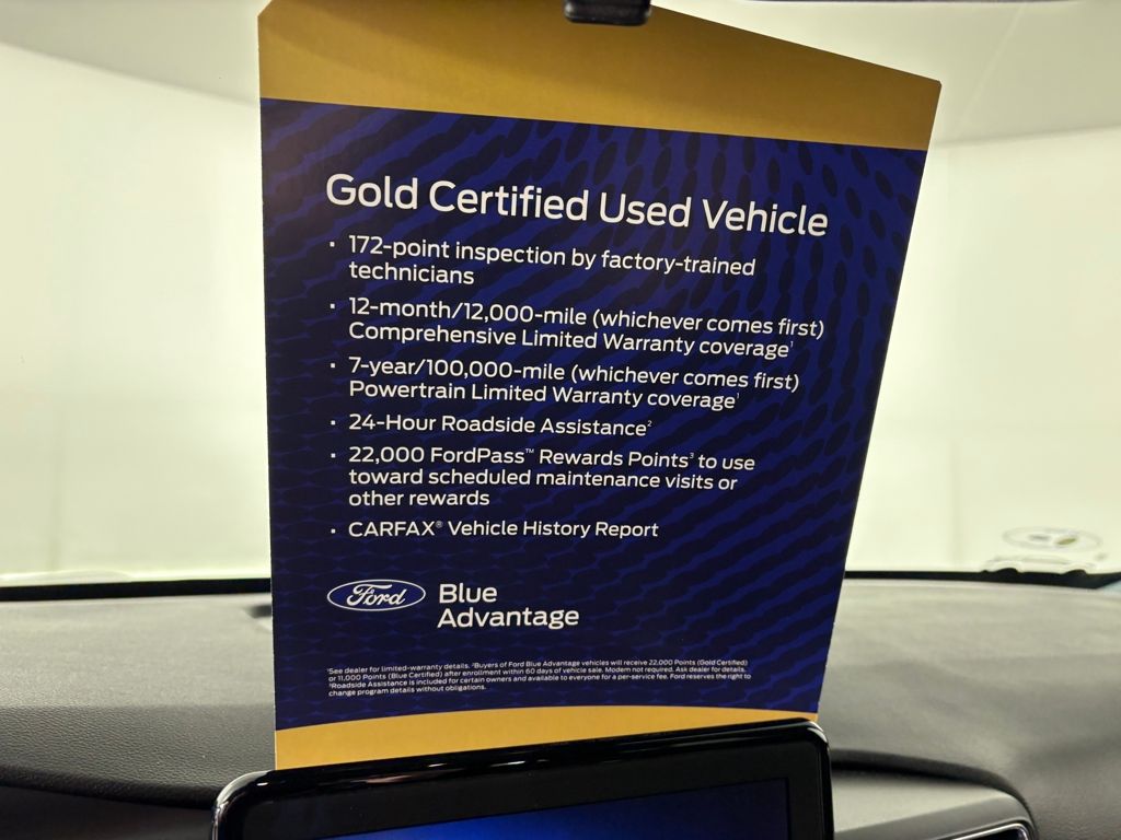 172 point vehicle inspection performed by a Ford Certified technician. 12-month/12,000-mile Comprehensive Limited Warranty coverage 7-year/100,000-mile Powertrain Limited Warranty coverage Gold Certification includes 22,000 FordPass Rewards Points Comprehensive Coverage: 12 months or 12,000 miles, whichever comes first, from the expiration of the new-vehicle bumperto-bumper limited warranty coverage or the date of sale as a certified vehicle, whichever is later. Comprehensive Limited Warranty covering 1,000+ components. Powertrain Coverage: 7 years from original new-vehicle warranty start date or 100,000 miles, whichever occurs first. Powertrain Limited Warranty covering select major components. 24/7 Roadside Assistance Travel expense reimbursement Rental car reimbursement SiriusXM 3 month trial Local home delivery Test-Drive at home. Recent Arrival! Odometer is 38315 miles below market average! 20/27 City/Highway MPG