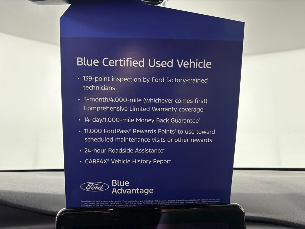 Ford Blue Certified includes:139 point vehicle inspection performed by an ASE Certified technician 3-month/4,000-mile Comprehensive Limited Warranty coverage that is fully competitive with other online retailers Blue Certification includes 11,000 FordPass Rewards Points For other manufacturers not listed above, Comprehensive Cover