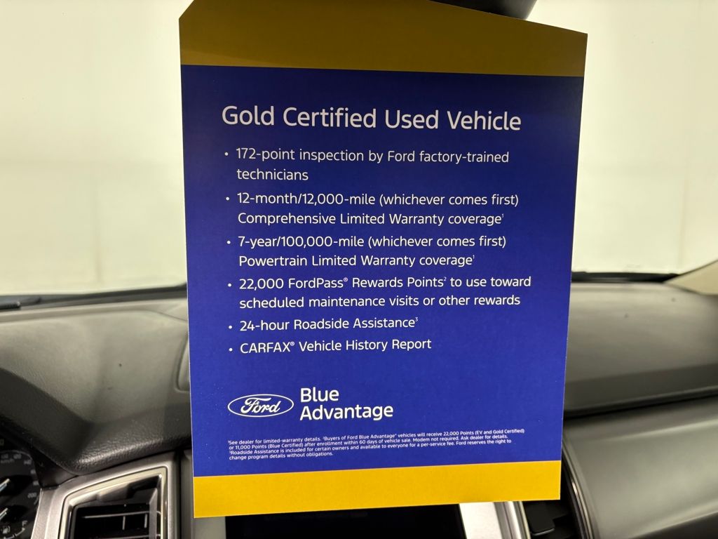 Ford Gold Certified includes:172 point vehicle inspection performed by a Ford Certified technician. 12-month/12,000-mile Comprehensive Limited Warranty coverage 7-year/100,000-mile Powertrain Limited Warranty coverage Gold Certification includes 22,000 FordPass Rewards Points Comprehensive Coverage: 12