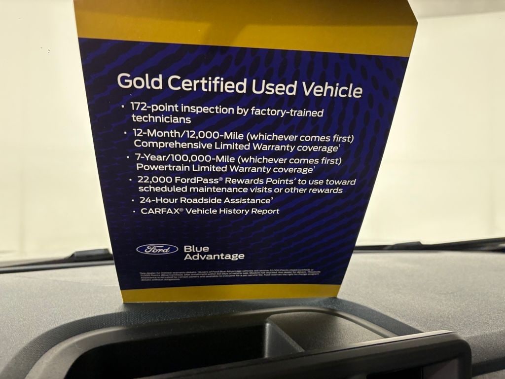 Ford Gold Certified includes:172 point vehicle inspection performed by a Ford Certified technician. 12-month/12,000-mile Comprehensive Limited Warranty coverage 7-year/100,000-mile Powertrain Limited Warranty coverage Gold Certification includes 22,000 FordPass Rewards Points Comprehensive Coverage: 12 months