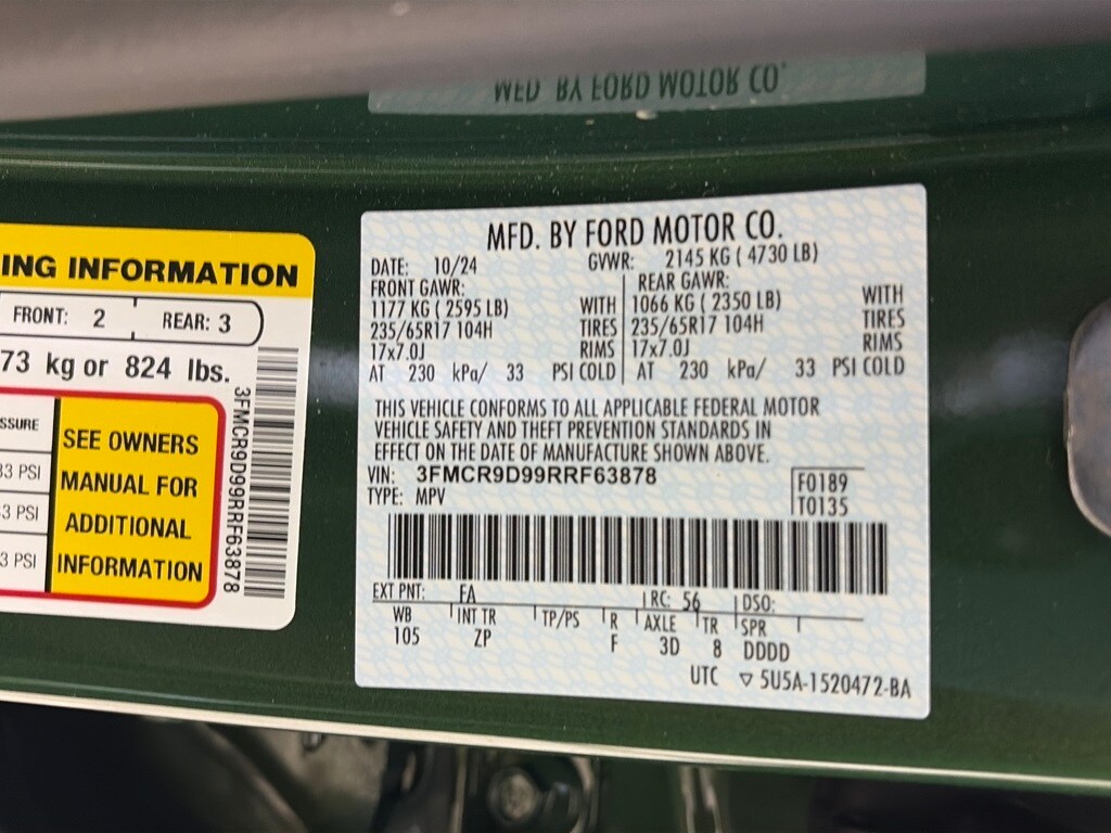 PREMIUM PACKAGE Dual-Zone Electronic Automatic Temperature Control, Bang & Olufsen Sound System, 10 speakers and subwoofer, Memory Drivers Seat & Sideview Mirror, Wireless Charging Pad, HD Radio, Universal Garage Door Opener (UGDO), Remote Start System, Heated Steering Wheel, Body-Colored Door Handles, Auto-Dimming Rearview Mirror, Rear Parking Sensors, POWER MOONROOF, CLASS II TRAILER TOW PACKAGE W/TRAILER SWAY CONTROL, TIRES: 235/65R17 ALL-TERRAIN OFF-ROAD Falken Wildpeak, CARGO MANAGEMENT SYSTEM shelf, divider and table, ENGINE: 2.0L ECOBOOST auto start-stop technology (STD). Ford Badlands with Eruption Green exterior and Ebony/Roast interior features a 4 Cylinder Engine with 250 HP at 5500 RPM*.