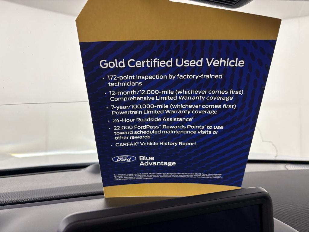 Ford Gold Certified includes:172 point vehicle inspection performed by a Ford Certified technician. 12-month/12,000-mile Comprehensive Limited Warranty coverage 7-year/100,000-mile Powertrain Limited Warranty coverage Gold Certification includes 22,000 FordPass Rewards Points Comprehensive Coverage: 12 months or 12,000 miles, whichever comes first, from the expiration of the new-vehicle bumperto