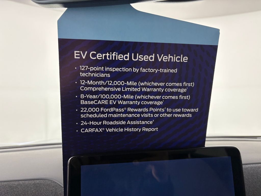 * Every EV Certified Vehicle Must be a Fully Electric Ford Model up to 6 years Old With No More Than 80,000 Miles on the Odometer. It Also Has to Pass an Extensive 127-Point Inspection. Plus, Each Comes With Manufacturer-Backed Comprehensive Limited Warranty Coverage, 8-Year/100,000-Mile (whichever comes first) Base CARE EV Limited Warranty coverage, a 14-Day/1,000-Mile (whichever comes first) Money Back Guarantee, complimentary 24/7, Ford Roadside Assistance and 22,000 FordPass Rewards Points to use toward your first two maintenance visits