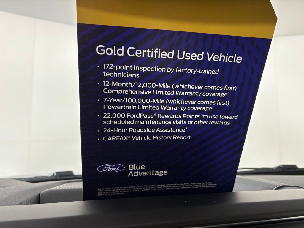 Ford Gold Certified includes:172 point vehicle inspection performed by a Ford Certified technician. 12-month/12,000-mile Comprehensive Limited Warranty coverage 7-year/100,000-mile Powertrain Limited Warranty coverage Gold Certification includes 22,000 FordPass Rewards Points Comprehensive Coverage: 12 months or 12,000 miles, whichever comes first, from the expiration of the new-vehicle bumperto-bumper limited warranty coverage or the date of sale as a certified vehicle, whichever is later. Comprehensive Limited Warranty covering 1,000+ components. Powertrain Coverage: 7 years