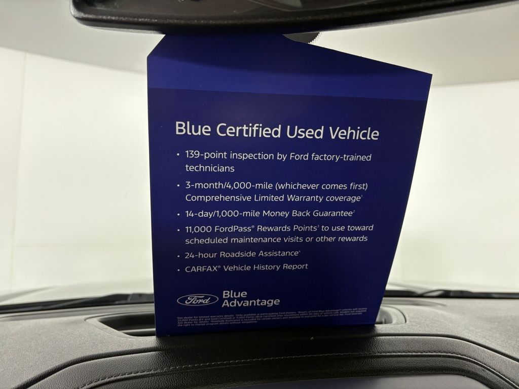 Ford Blue Certified includes:139 point vehicle inspection performed by an ASE Certified technician 3-month/4,000-mile Comprehensive Limited Warranty coverage that is fully competitive with other online retailers Blue Certification includes 11,000 FordPass Rewards Points For other manufacturers not listed above, Comprehensive Coverage is provided for 3 months or 4,000 miles, whichever comes first, from the signature date of the Ford Blue Advantage â" Blue Certified purchase. Comprehensive Limited Warranty covering 1,000+ components Travel expense reimbursement Renta