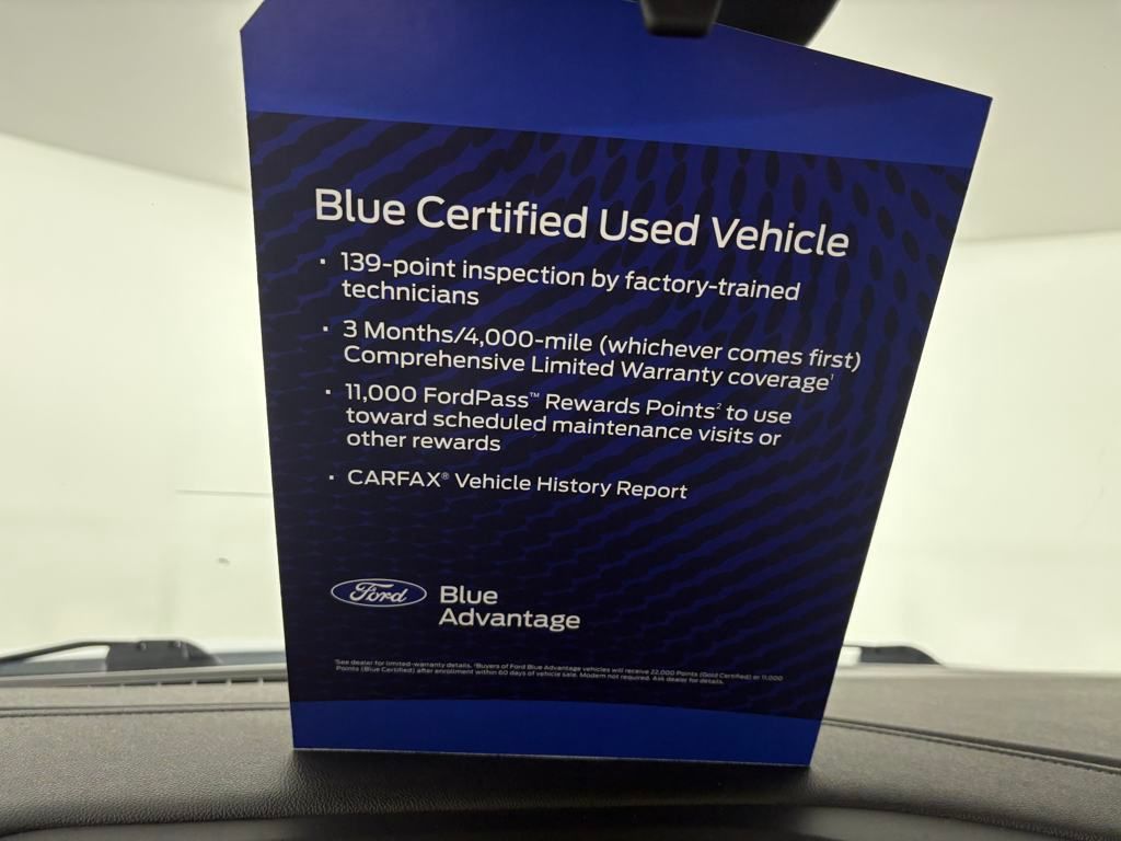 Ford Blue Certified includes:139 point vehicle inspection performed by an ASE Certified technician 3-month/4,000-mile Comprehensive Limited Warranty coverage that is fully competitive with other online retailers Blue Certification includes 11,000 FordPass Rewards Points For other manufacturers not listed above, Comprehensive Coverage is provided for 3 months or 4,000 miles, whichever comes first, from the signature date of the Ford Blue Advantage â" Blue Certified purchase. Comprehensive Limited Warran