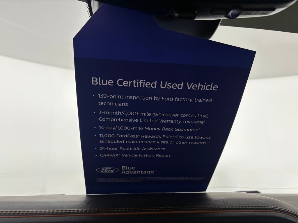 Ford Blue Certified includes:139 point vehicle inspection performed by an ASE Certified technician 3-month/4,000-mile Comprehensive Limited Warranty coverage that is fully competitive with other online retailers Blue Certification includes 11,000 FordPass Rewards Points For other manufacturers not listed above, Comprehensive Coverage is provided for 3 months or 4,000 miles, whichever comes first, from the signature date of the Ford Blue Advantage â" Blue Certified purchase. Comprehensive Limited Warranty covering 1,000+ components Travel expense reimbursement Rental car reimbursement SiriusXM 3 month trial.