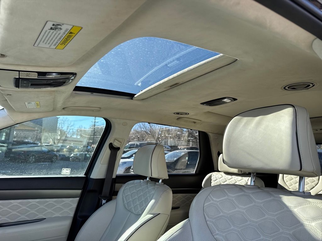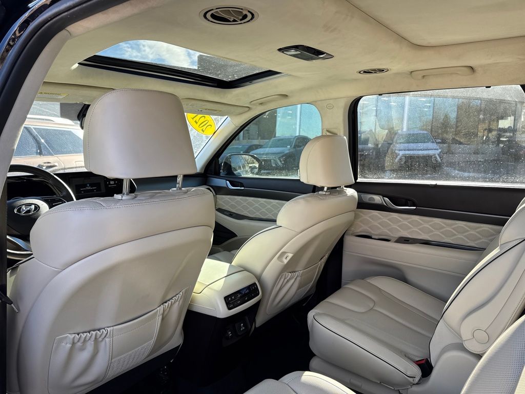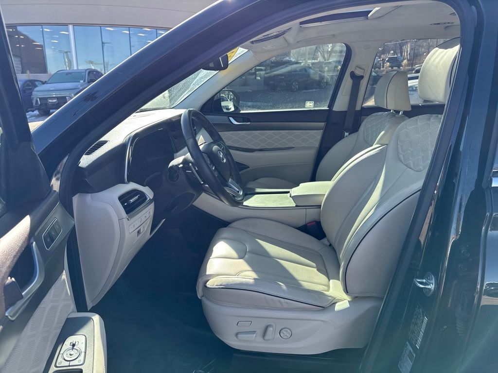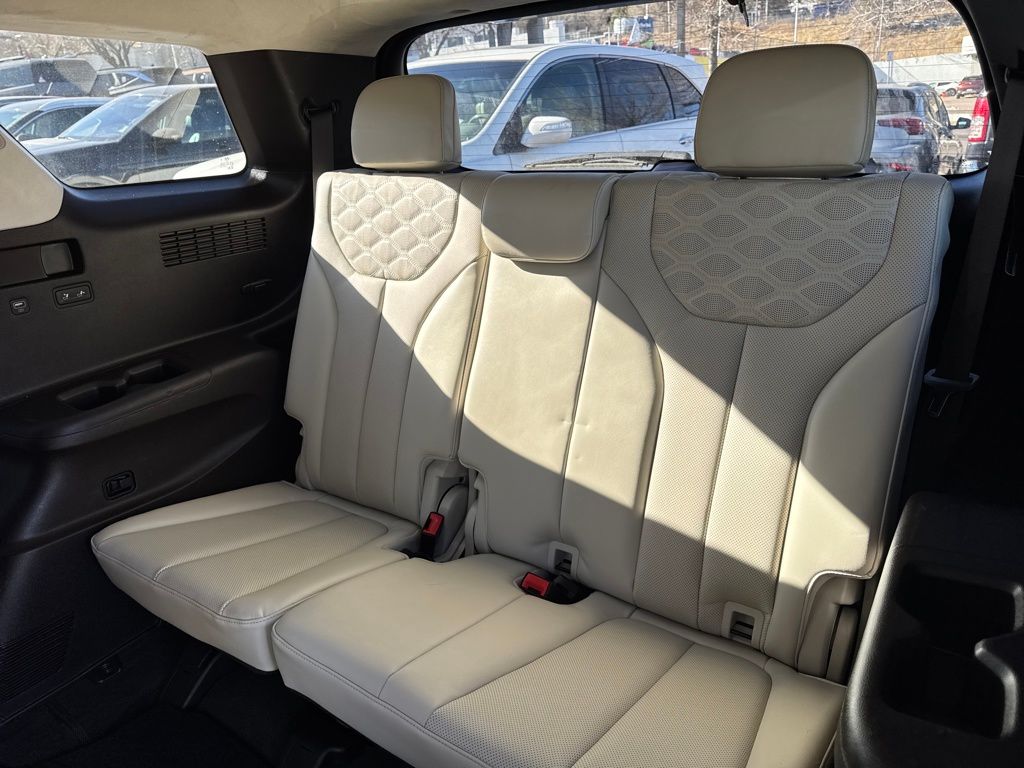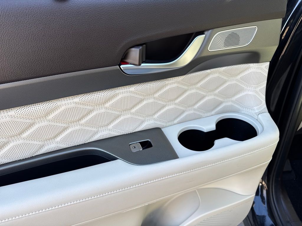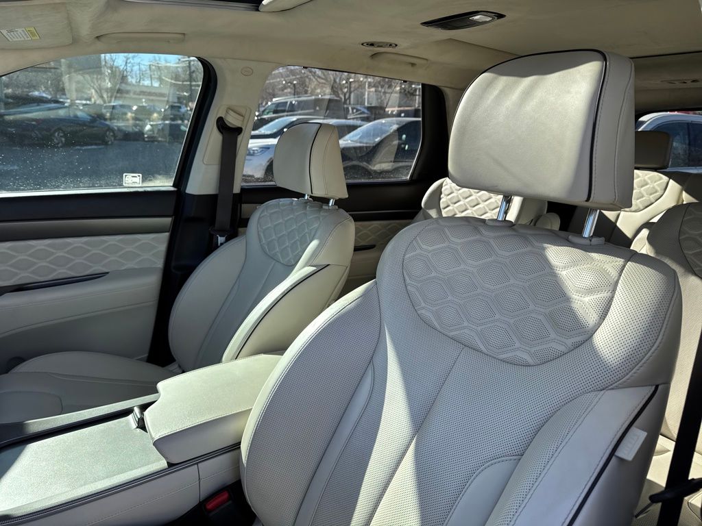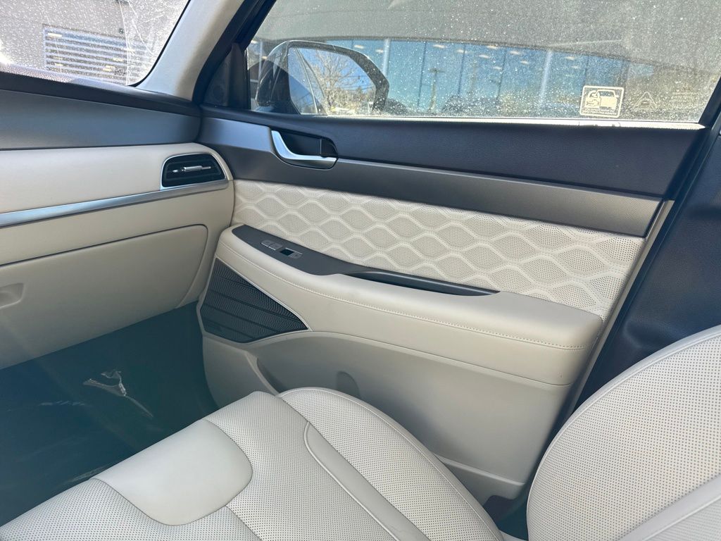 Option Group 01, Hyundai Select Used Certified, 12 Speakers, 3.648 Axle Ratio, 3rd row seats: split-bench, 4-Wheel Disc Brakes, ABS brakes, Air Conditioning, Alloy wheels, AM/FM radio: SiriusXM, Apple CarPlay & Android Auto, Auto High-beam Headlights, Auto-dimming Rear-View mirror, Auto-leveling suspension, Automatic temperature control, Brake assist, Bumper Applique, Bumpers: body-color, Cargo Net, Cargo Tray, Carpeted Floor Mats, Compass, Delay-off headlights, Driver door bin, Driver vanity mirror, Dual front impact airbags, Dual front side impact airbags, Electronic Stability Control, Emergency communication system: Blue Link Connected Car Service (3-year complimentary subscription), Four wheel independent suspension, Front anti-roll bar, Front Bucket Seats, Front Center Armrest, Front dual zone A/C, Front reading lights, Fully automatic headlights, Garage door transmitter: HomeLink, harman/kardon® Speakers, Heads-Up Display, Heated & Ventilated Front Bucket Seats, Heated door mirrors, Heated front seats, Heated rear seats, Heated steering wheel, Illuminated entry, Knee airbag, Low tire pressure warning, Memory seat, Mudguards, Navigation System, Occupant sensing airbag, Outside temperature display, Overhead airbag, Overhead console, Panic alarm, Passenger door bin, Passenger vanity mirror, Power door mirrors, Power driver seat, Power Liftgate, Power moonroof, Power passenger seat, Power steering, Power windows, Premium Nappa Leather Seat Trim, Radio data system, Radio: AM/FM/MP3 Premium Audio System, Rain sensing wipers, Rear air conditioning, Rear anti-roll bar, Rear reading lights, Rear window defroster, Rear window wiper, Reclining 3rd row seat, Remote keyless entry, Security system, Speed control, Speed-sensing steering, Split folding rear seat, Spoiler, Steering wheel mounted audio controls, Tachometer, Telescoping steering wheel, Tilt steering wheel, Tow Hitch, Traction control, Trip computer, Turn signal indicator mirrors, Variably intermittent wipers, Ventilated front seats, Ventilated rear seats, and Wheels: 20" x 7.5J Calligraphy Exclusive Alloy.