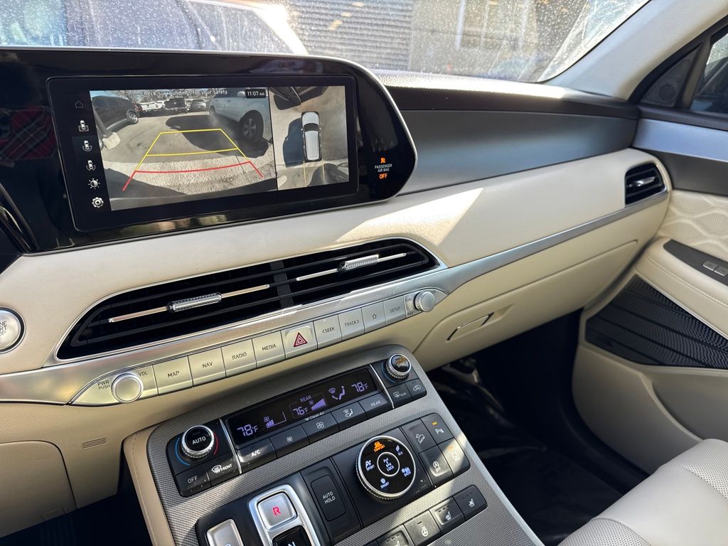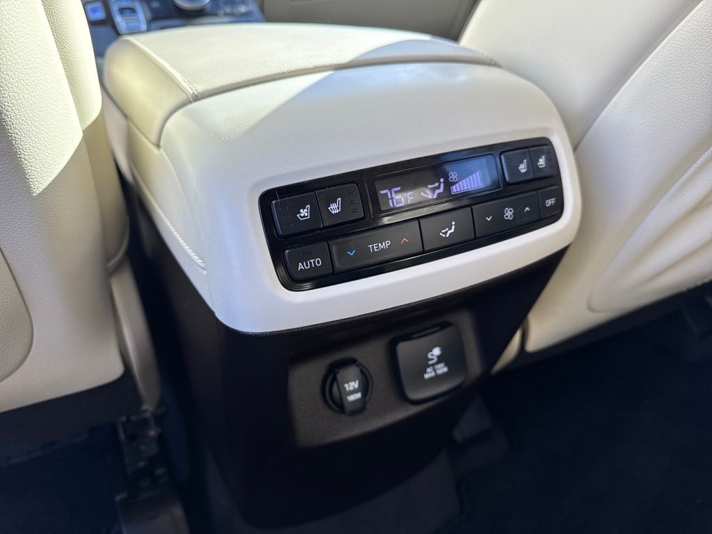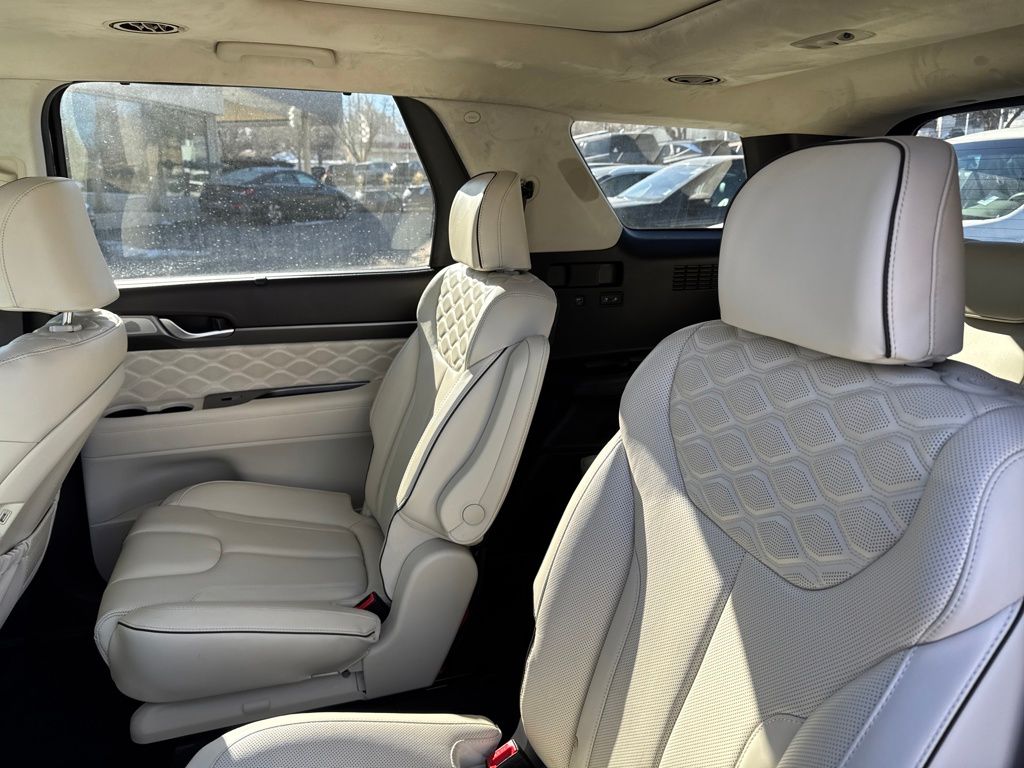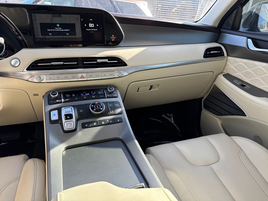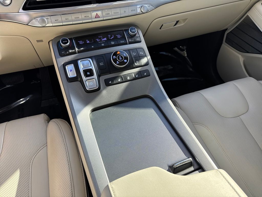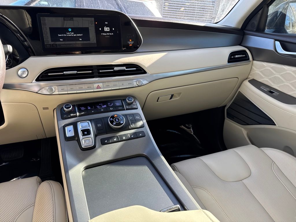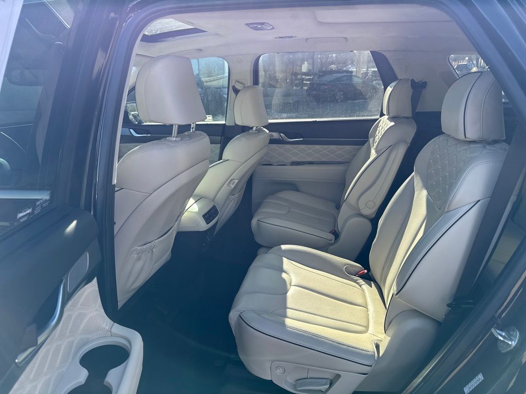 Option Group 01, Hyundai Select Used Certified, 12 Speakers, 3.648 Axle Ratio, 3rd row seats: split-bench, 4-Wheel Disc Brakes, ABS brakes, Air Conditioning, Alloy wheels, AM/FM radio: SiriusXM, Apple CarPlay & Android Auto, Auto High-beam Headlights, Auto-dimming Rear-View mirror, Auto-leveling suspension, Automatic temperature control, Brake assist, Bumper Applique, Bumpers: body-color, Cargo Net, Cargo Tray, Carpeted Floor Mats, Compass, Delay-off headlights, Driver door bin, Driver vanity mirror, Dual front impact airbags, Dual front side impact airbags, Electronic Stability Control, Emergency communication system: Blue Link Connected Car Service (3-year complimentary subscription), Four wheel independent suspension, Front anti-roll bar, Front Bucket Seats, Front Center Armrest, Front dual zone A/C, Front reading lights, Fully automatic headlights, Garage door transmitter: HomeLink, harman/kardon® Speakers, Heads-Up Display, Heated & Ventilated Front Bucket Seats, Heated door mirrors, Heated front seats, Heated rear seats, Heated steering wheel, Illuminated entry, Knee airbag, Low tire pressure warning, Memory seat, Mudguards, Navigation System, Occupant sensing airbag, Outside temperature display, Overhead airbag, Overhead console, Panic alarm, Passenger door bin, Passenger vanity mirror, Power door mirrors, Power driver seat, Power Liftgate, Power moonroof, Power passenger seat, Power steering, Power windows, Premium Nappa Leather Seat Trim, Radio data system, Radio: AM/FM/MP3 Premium Audio System, Rain sensing wipers, Rear air conditioning, Rear anti-roll bar, Rear reading lights, Rear window defroster, Rear window wiper, Reclining 3rd row seat, Remote keyless entry, Security system, Speed control, Speed-sensing steering, Split folding rear seat, Spoiler, Steering wheel mounted audio controls, Tachometer, Telescoping steering wheel, Tilt steering wheel, Tow Hitch, Traction control, Trip computer, Turn signal indicator mirrors, Variably intermittent wipers, Ventilated front seats, Ventilated rear seats, and Wheels: 20" x 7.5J Calligraphy Exclusive Alloy.