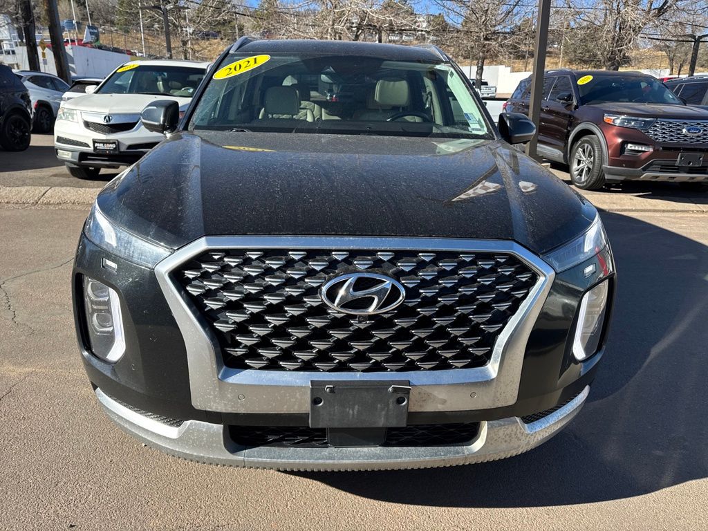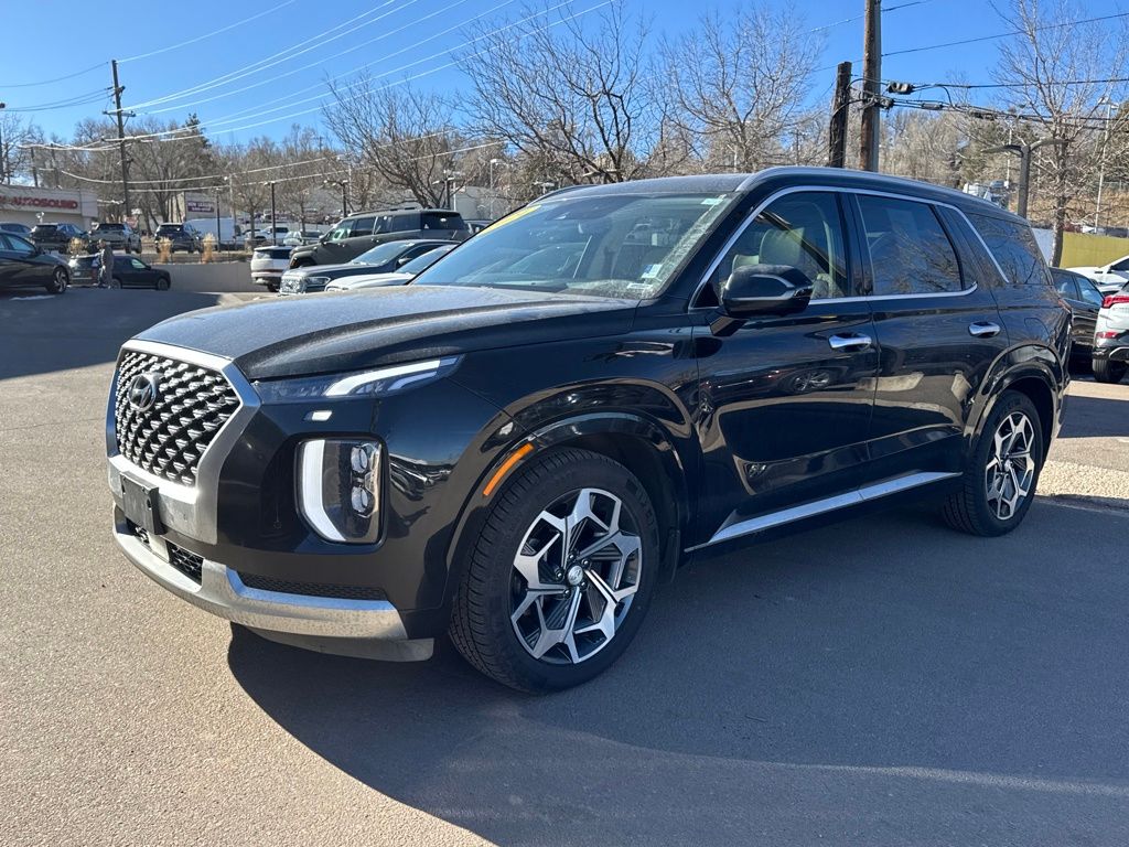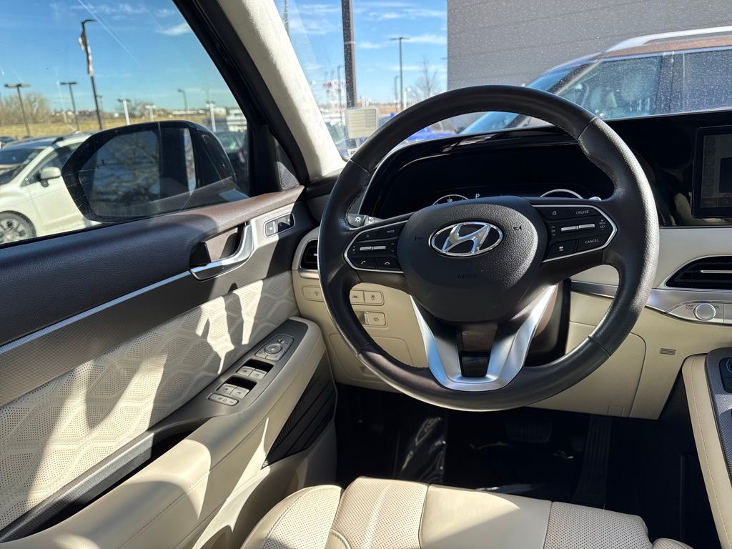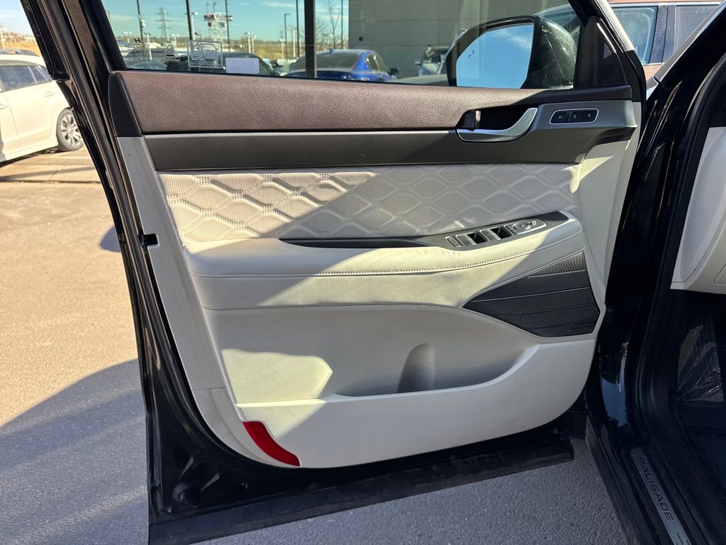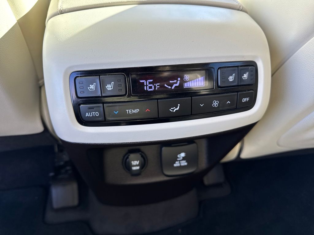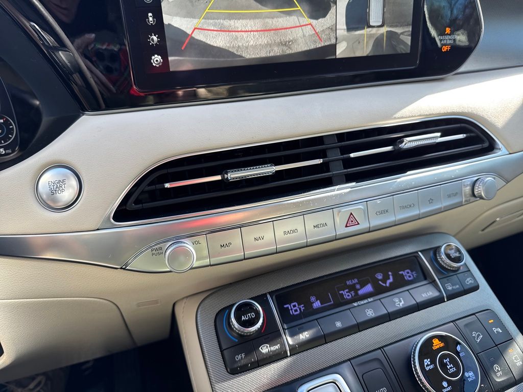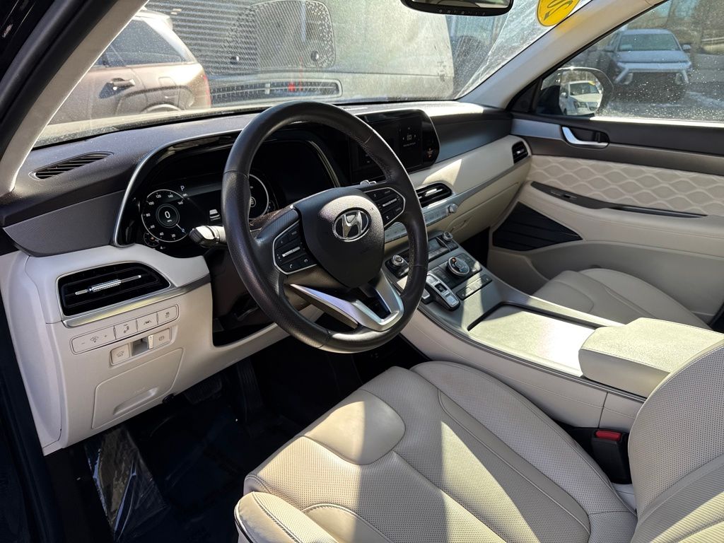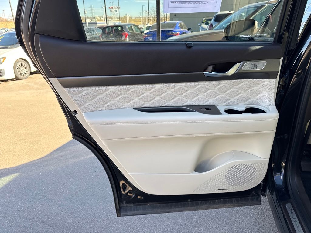 Option Group 01, Hyundai Select Used Certified, 12 Speakers, 3.648 Axle Ratio, 3rd row seats: split-bench, 4-Wheel Disc Brakes, ABS brakes, Air Conditioning, Alloy wheels, AM/FM radio: SiriusXM, Apple CarPlay & Android Auto, Auto High-beam Headlights, Auto-dimming Rear-View mirror, Auto-leveling suspension, Automatic temperature control, Brake assist, Bumper Applique, Bumpers: body-color, Cargo Net, Cargo Tray, Carpeted Floor Mats, Compass, Delay-off headlights, Driver door bin, Driver vanity mirror, Dual front impact airbags, Dual front side impact airbags, Electronic Stability Control, Emergency communication system: Blue Link Connected Car Service (3-year complimentary subscription), Four wheel independent suspension, Front anti-roll bar, Front Bucket Seats, Front Center Armrest, Front dual zone A/C, Front reading lights, Fully automatic headlights, Garage door transmitter: HomeLink, harman/kardon® Speakers, Heads-Up Display, Heated & Ventilated Front Bucket Seats, Heated door mirrors, Heated front seats, Heated rear seats, Heated steering wheel, Illuminated entry, Knee airbag, Low tire pressure warning, Memory seat, Mudguards, Navigation System, Occupant sensing airbag, Outside temperature display, Overhead airbag, Overhead console, Panic alarm, Passenger door bin, Passenger vanity mirror, Power door mirrors, Power driver seat, Power Liftgate, Power moonroof, Power passenger seat, Power steering, Power windows, Premium Nappa Leather Seat Trim, Radio data system, Radio: AM/FM/MP3 Premium Audio System, Rain sensing wipers, Rear air conditioning, Rear anti-roll bar, Rear reading lights, Rear window defroster, Rear window wiper, Reclining 3rd row seat, Remote keyless entry, Security system, Speed control, Speed-sensing steering, Split folding rear seat, Spoiler, Steering wheel mounted audio controls, Tachometer, Telescoping steering wheel, Tilt steering wheel, Tow Hitch, Traction control, Trip computer, Turn signal indicator mirrors, Variably intermittent wipers, Ventilated front seats, Ventilated rear seats, and Wheels: 20" x 7.5J Calligraphy Exclusive Alloy.