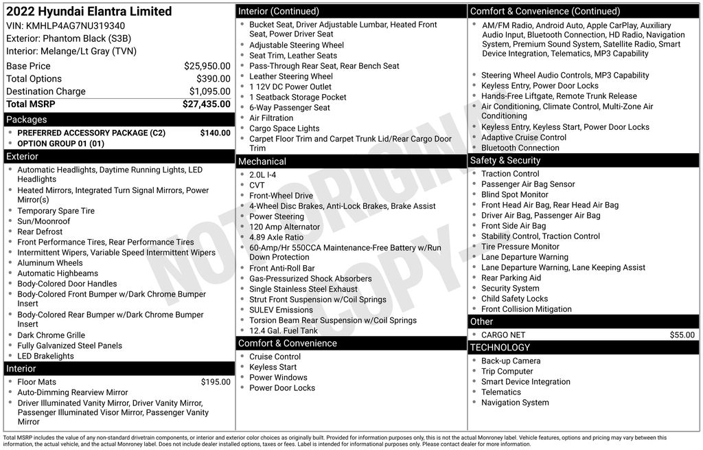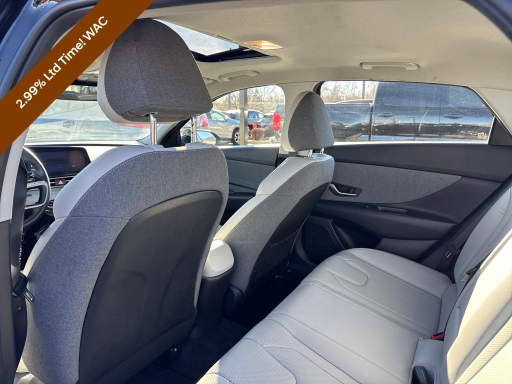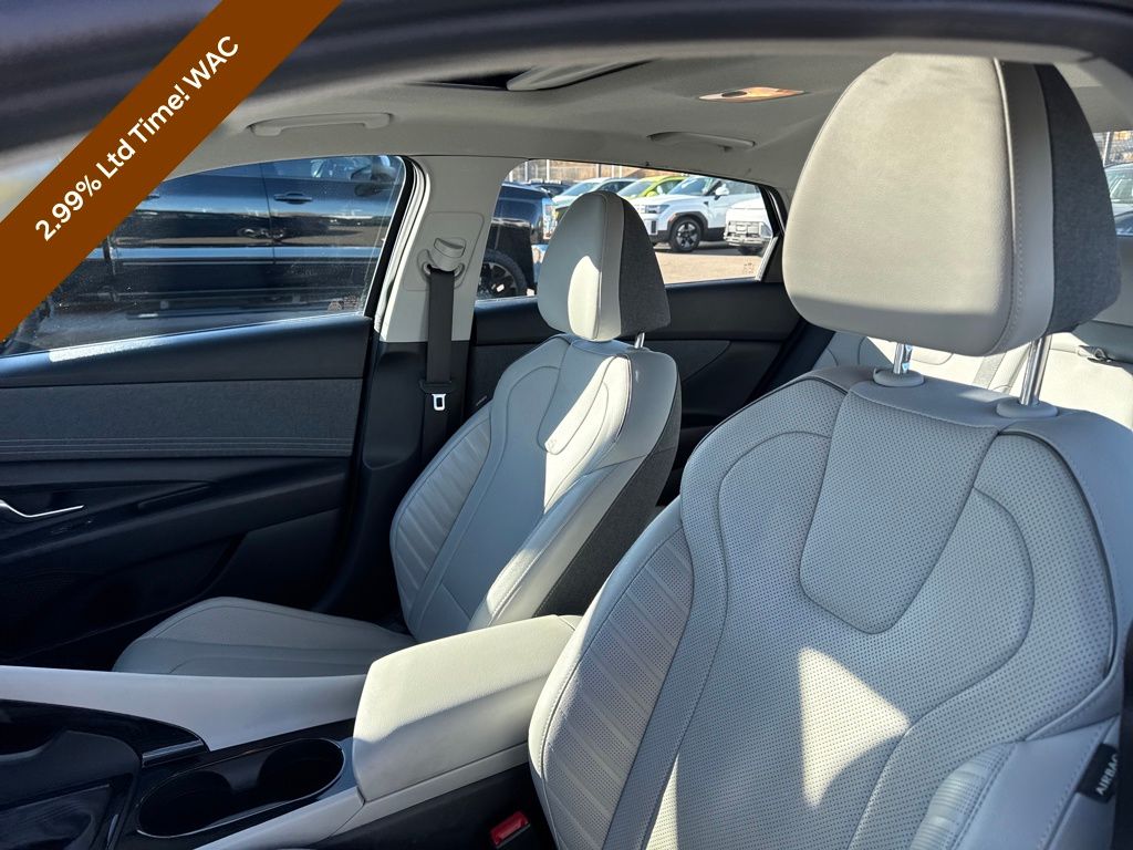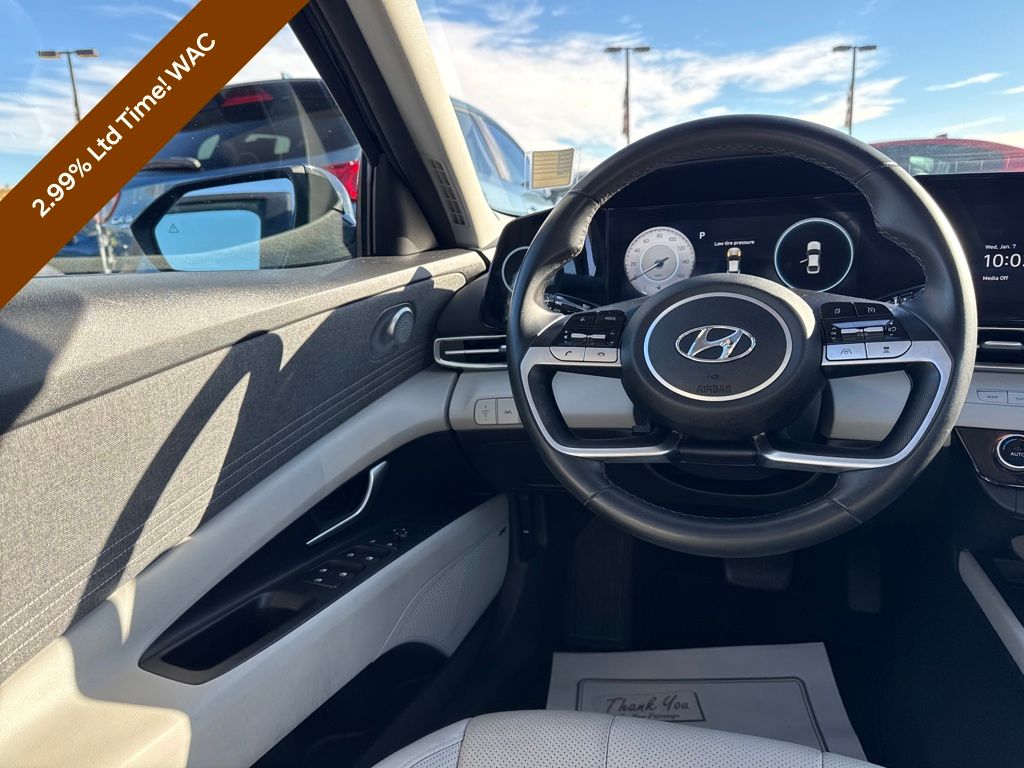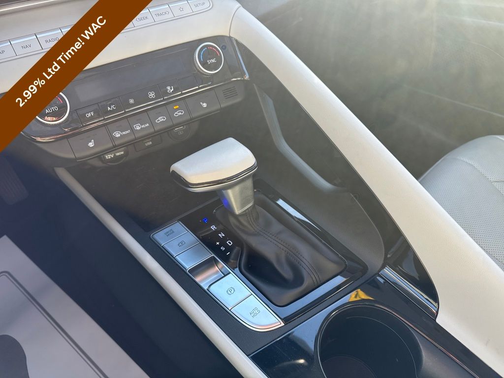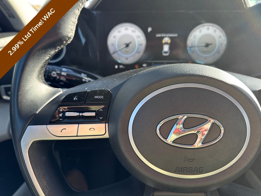 Option Group 01, Preferred Accessory Package (First Aid Kit), Hyundai Certified Used Vehicles Certified, 17" x 7.0J Alloy Wheels, 4-Wheel Disc Brakes, 8 Speakers, ABS brakes, Air Conditioning, Alloy wheels, AM/FM radio: SiriusXM, Apple CarPlay & Android Auto, Auto High-beam Headlights, Auto-dimming Rear-View mirror, Automatic temperature control, Brake assist, Bumpers: body-color, Cargo Net, Carpeted Floor Mats, Delay-off headlights, Driver door bin, Driver vanity mirror, Dual front impact airbags, Dual front side impact airbags, Electronic Stability Control, Emergency communication system: Blue Link Connected Car Service (3-year complimentary subscription), Exterior Parking Camera Rear, Front anti-roll bar, Front Bucket Seats, Front Center Armrest, Front dual zone A/C, Front reading lights, Front wheel independent suspension, Fully automatic headlights, Heated door mirrors, Heated Front Bucket Seats, Heated front seats, Illuminated entry, Leather-Trimmed Seats, Low tire pressure warning, Navigation System, Occupant sensing airbag, Outside temperature display, Overhead airbag, Overhead console, Panic alarm, Passenger door bin, Passenger vanity mirror, Power door mirrors, Power driver seat, Power moonroof, Power steering, Power windows, Radio: AM/FM/HD/SiriusXM Display Audio, Rear seat center armrest, Rear window defroster, Remote keyless entry, Security system, Speed control, Speed-sensing steering, Split folding rear seat, Steering wheel mounted audio controls, Tachometer, Telescoping steering wheel, Tilt steering wheel, Traction control, Trip computer, Turn signal indicator mirrors, and Variably intermittent wipers.