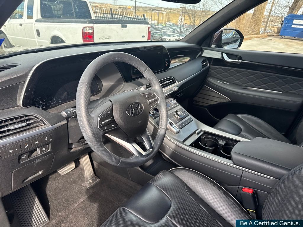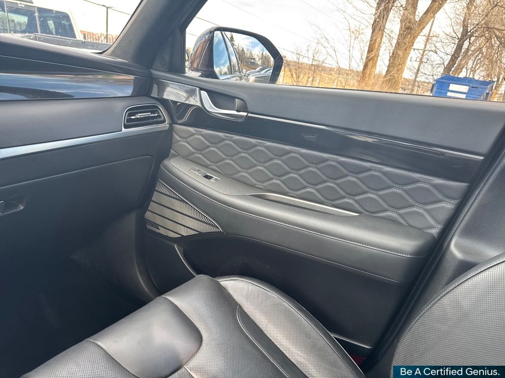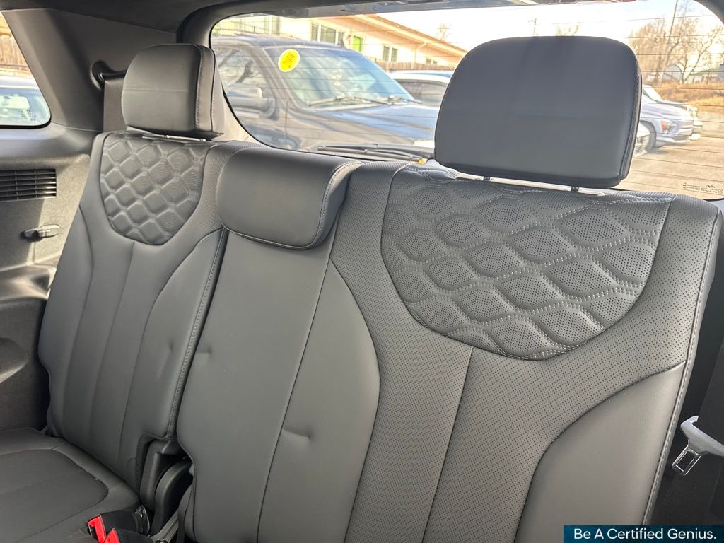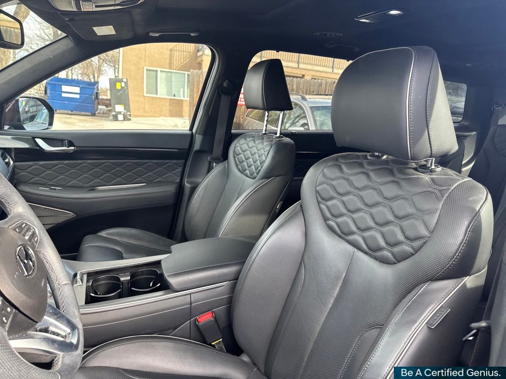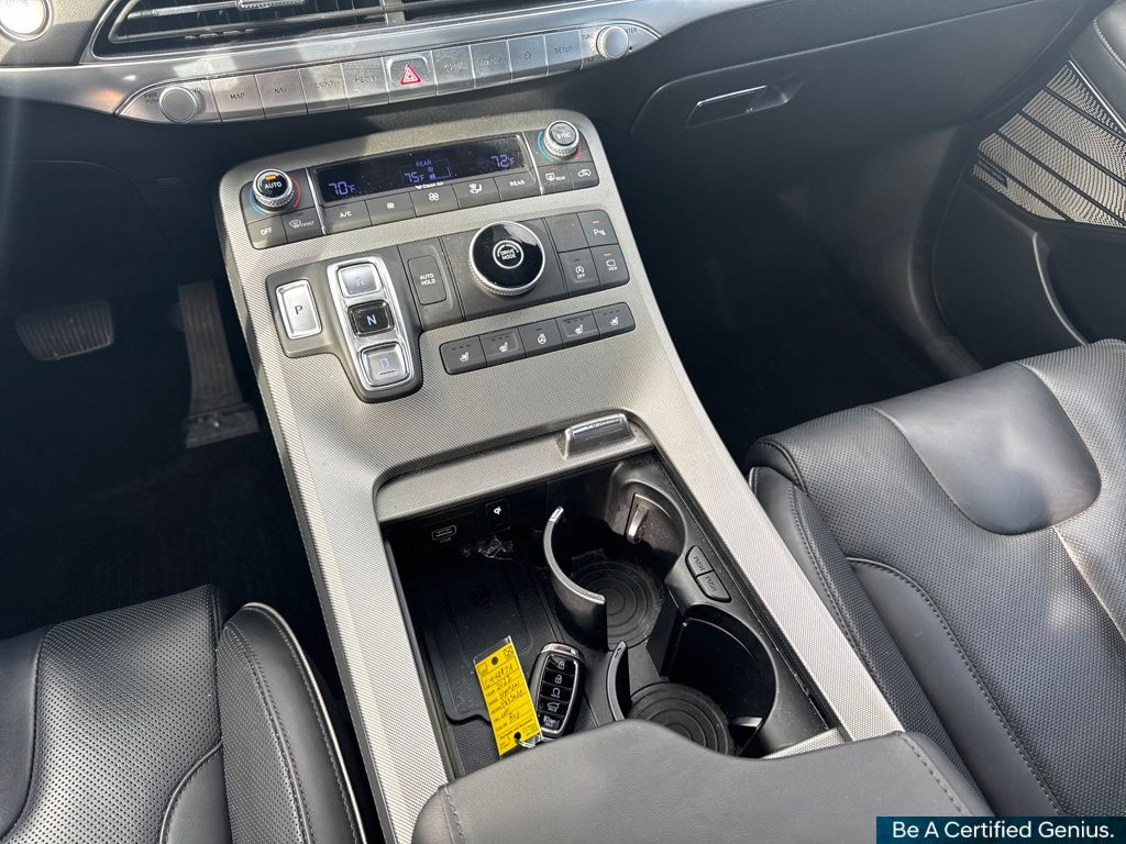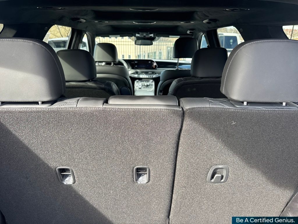 Option Group 01, Hyundai Certified Used Vehicles Certified, 12 Speakers, 3.648 Axle Ratio, 3rd row seats: split-bench, 4-Wheel Disc Brakes, ABS brakes, Air Conditioning, Alloy wheels, AM/FM radio: SiriusXM, Apple CarPlay & Android Auto, Auto High-beam Headlights, Auto-dimming Rear-View mirror, Auto-leveling suspension, Automatic temperature control, Brake assist, Bumpers: body-color, Cargo Net, Carpeted Floor Mats, Compass, Delay-off headlights, Driver door bin, Driver vanity mirror, Dual front impact airbags, Dual front side impact airbags, Electronic Stability Control, Emergency communication system: Blue Link Connected Car Service (3-year complimentary subscription), Four wheel independent suspension, Front anti-roll bar, Front Bucket Seats, Front Center Armrest, Front dual zone A/C, Front reading lights, Fully automatic headlights, Garage door transmitter: HomeLink, harman/kardon® Speakers, Heads-Up Display, Heated & Ventilated Front Bucket Seats, Heated door mirrors, Heated front seats, Heated rear seats, Heated steering wheel, Illuminated entry, Knee airbag, Low tire pressure warning, Memory seat, Navigation System, Occupant sensing airbag, Outside temperature display, Overhead airbag, Overhead console, Panic alarm, Passenger door bin, Passenger vanity mirror, Power door mirrors, Power driver seat, Power Liftgate, Power moonroof, Power passenger seat, Power steering, Power windows, Premium Nappa Leather Seat Trim, Radio data system, Radio: AM/FM/MP3 Premium Audio System, Rain sensing wipers, Rear air conditioning, Rear anti-roll bar, Rear audio controls, Rear reading lights, Rear window defroster, Rear window wiper, Reclining 3rd row seat, Remote keyless entry, Security system, Speed control, Speed-sensing steering, Split folding rear seat, Spoiler, Steering wheel mounted audio controls, Tachometer, Telescoping steering wheel, Tilt steering wheel, Traction control, Trip computer, Turn signal indicator mirrors, Variably intermittent wipers, Ventilated front seats, Ventilated rear seats, Wheel Locks, and Wheels: 20" x 7.5J Calligraphy Exclusive Alloy.