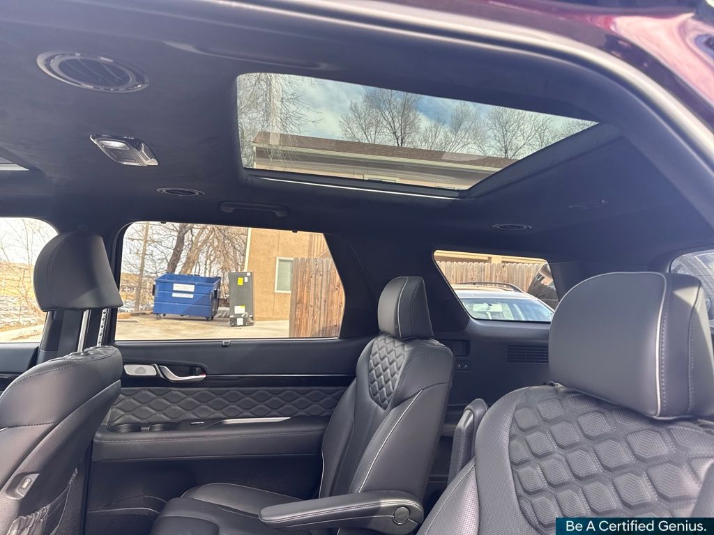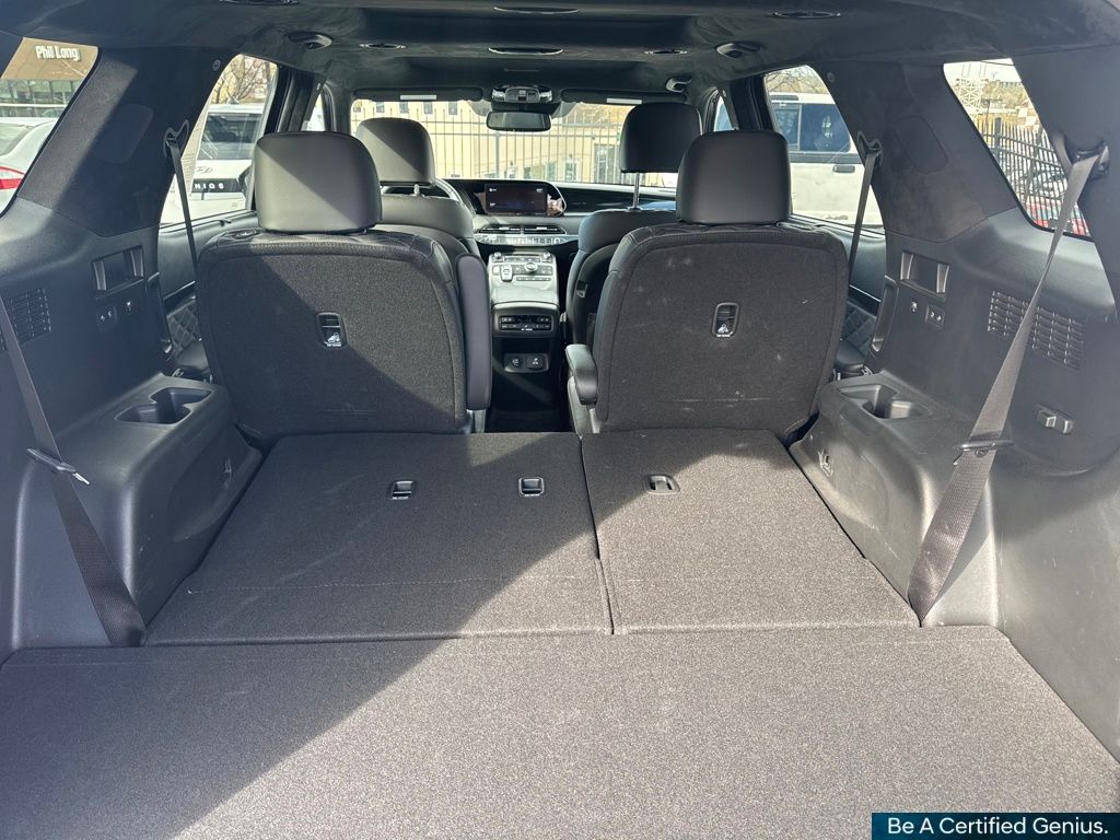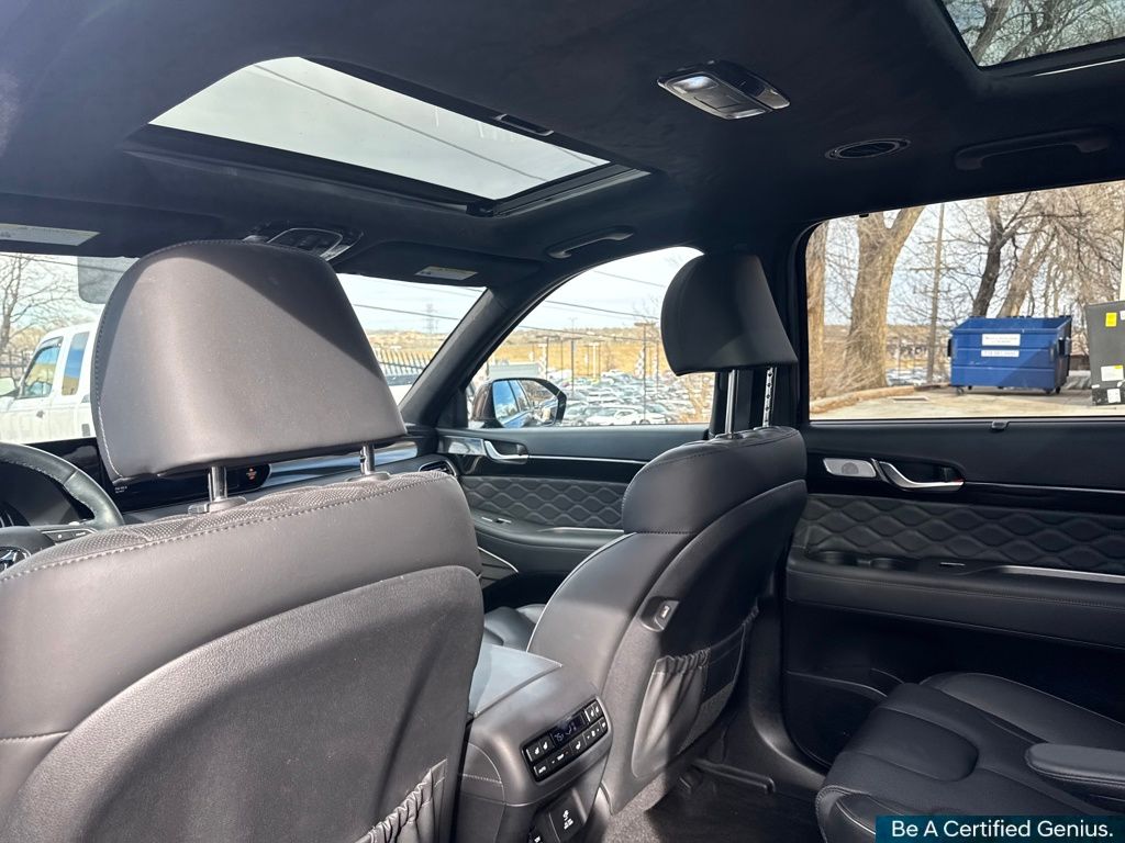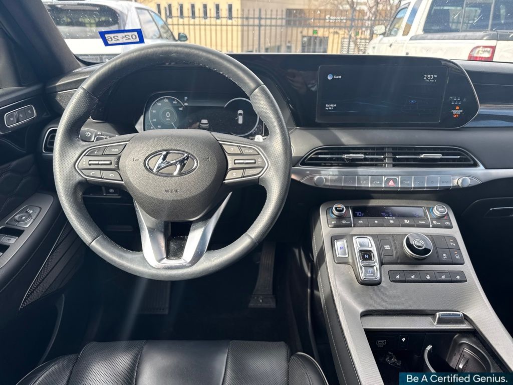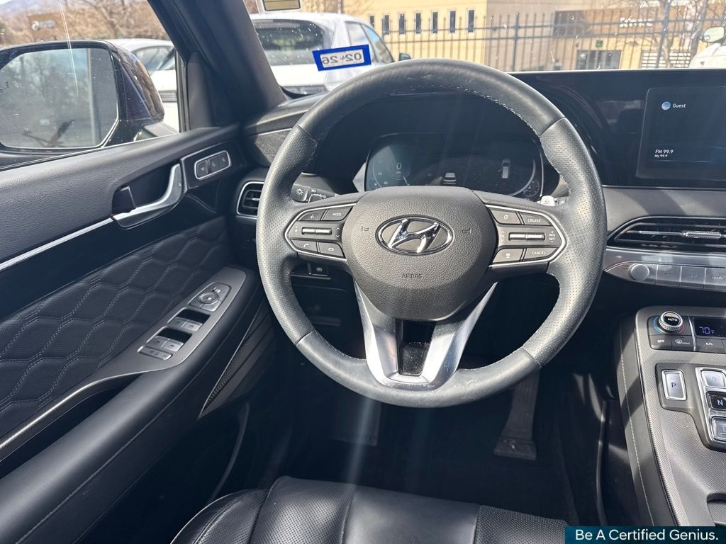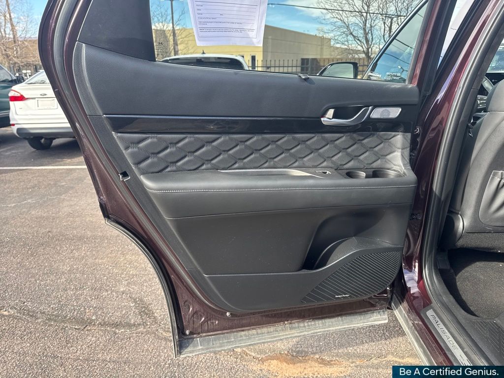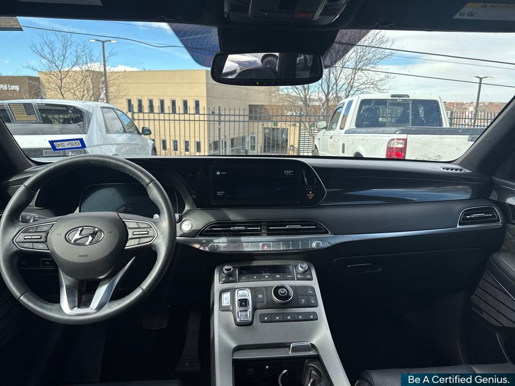 Option Group 01, Hyundai Certified Used Vehicles Certified, 12 Speakers, 3.648 Axle Ratio, 3rd row seats: split-bench, 4-Wheel Disc Brakes, ABS brakes, Air Conditioning, Alloy wheels, AM/FM radio: SiriusXM, Apple CarPlay & Android Auto, Auto High-beam Headlights, Auto-dimming Rear-View mirror, Auto-leveling suspension, Automatic temperature control, Brake assist, Bumpers: body-color, Cargo Net, Carpeted Floor Mats, Compass, Delay-off headlights, Driver door bin, Driver vanity mirror, Dual front impact airbags, Dual front side impact airbags, Electronic Stability Control, Emergency communication system: Blue Link Connected Car Service (3-year complimentary subscription), Four wheel independent suspension, Front anti-roll bar, Front Bucket Seats, Front Center Armrest, Front dual zone A/C, Front reading lights, Fully automatic headlights, Garage door transmitter: HomeLink, harman/kardon® Speakers, Heads-Up Display, Heated & Ventilated Front Bucket Seats, Heated door mirrors, Heated front seats, Heated rear seats, Heated steering wheel, Illuminated entry, Knee airbag, Low tire pressure warning, Memory seat, Navigation System, Occupant sensing airbag, Outside temperature display, Overhead airbag, Overhead console, Panic alarm, Passenger door bin, Passenger vanity mirror, Power door mirrors, Power driver seat, Power Liftgate, Power moonroof, Power passenger seat, Power steering, Power windows, Premium Nappa Leather Seat Trim, Radio data system, Radio: AM/FM/MP3 Premium Audio System, Rain sensing wipers, Rear air conditioning, Rear anti-roll bar, Rear audio controls, Rear reading lights, Rear window defroster, Rear window wiper, Reclining 3rd row seat, Remote keyless entry, Security system, Speed control, Speed-sensing steering, Split folding rear seat, Spoiler, Steering wheel mounted audio controls, Tachometer, Telescoping steering wheel, Tilt steering wheel, Traction control, Trip computer, Turn signal indicator mirrors, Variably intermittent wipers, Ventilated front seats, Ventilated rear seats, Wheel Locks, and Wheels: 20" x 7.5J Calligraphy Exclusive Alloy.