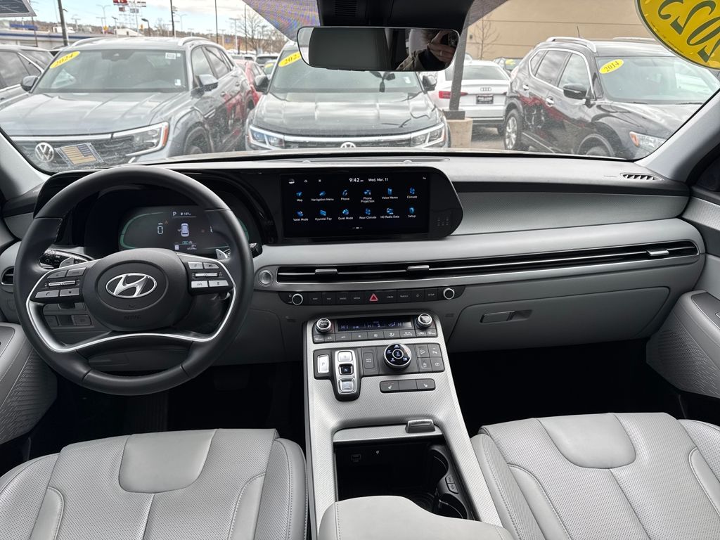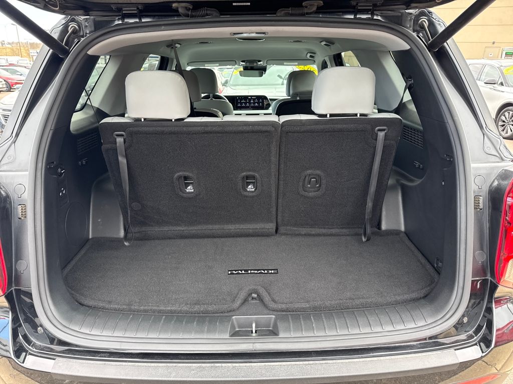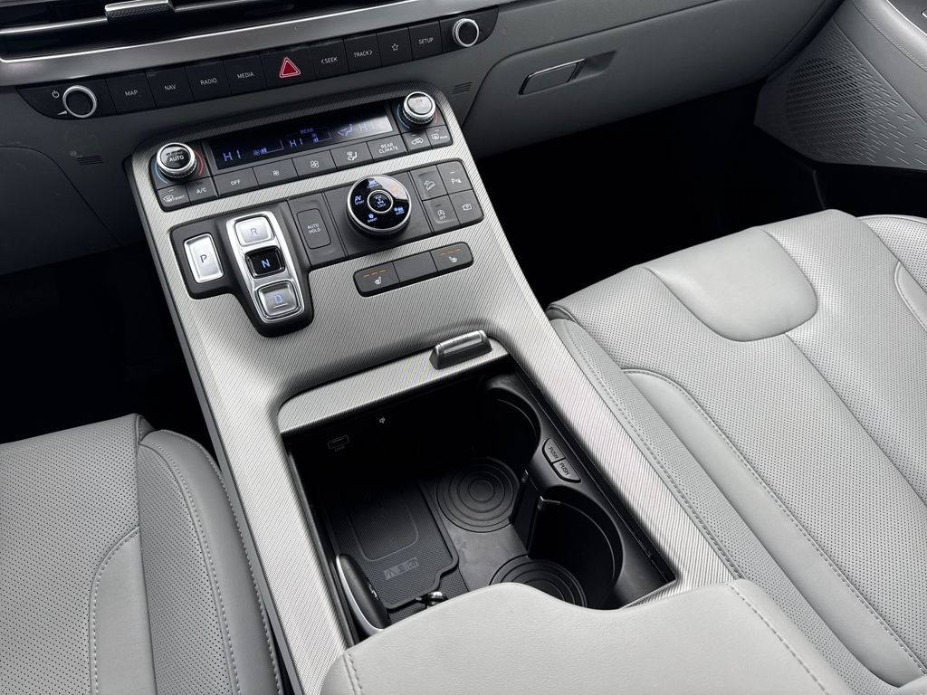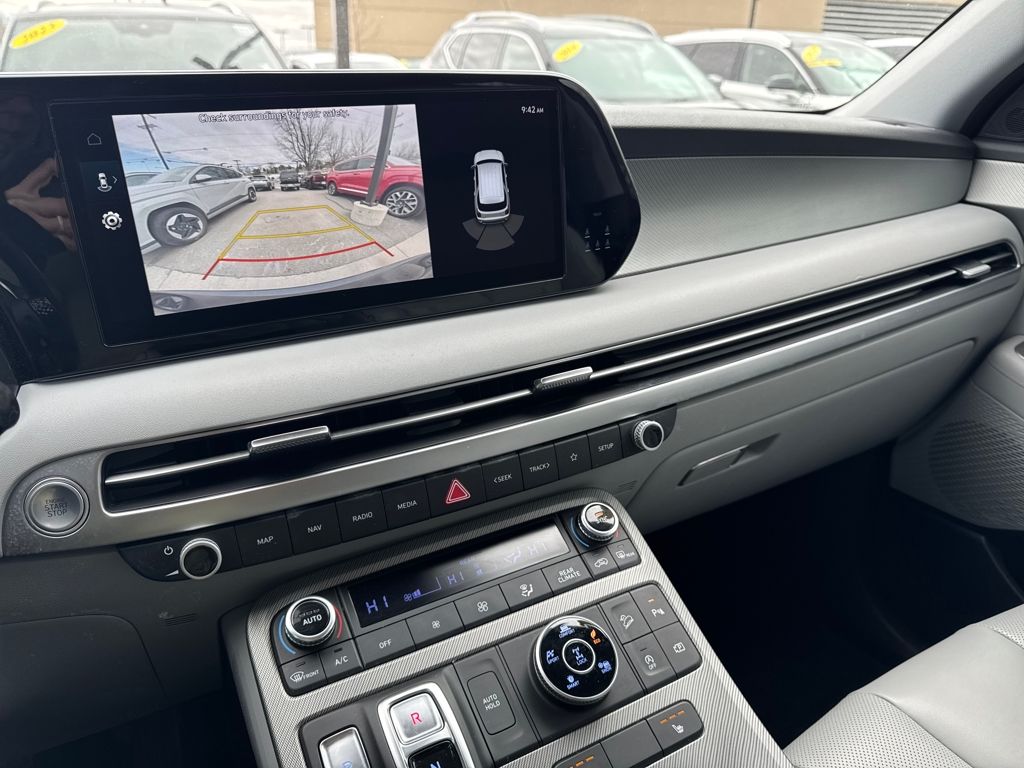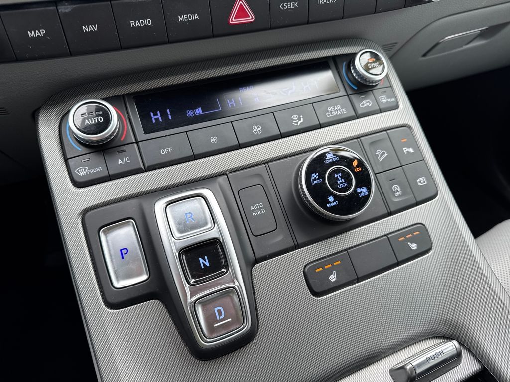 Option Group 01, Hyundai Certified Used Vehicles Certified, 3.648 Axle Ratio, 3rd row seats: split-bench, 4-Wheel Disc Brakes, 6 Speakers, ABS brakes, Air Conditioning, Alloy wheels, AM/FM radio: SiriusXM, Apple CarPlay & Android Auto, Auto High-beam Headlights, Auto-dimming door mirrors, Auto-dimming Rear-View mirror, Automatic temperature control, Brake assist, Bumpers: body-color, Cargo Cover/Screen, Cargo Net, Cargo Tray, Carpeted Floor Mats, Delay-off headlights, Driver door bin, Driver vanity mirror, Dual front impact airbags, Dual front side impact airbags, Electronic Stability Control, Emergency communication system: Blue Link Connected Car Service (3-year complimentary subscription), Exterior Parking Camera Rear, Four wheel independent suspension, Front anti-roll bar, Front Bucket Seats, Front Center Armrest, Front dual zone A/C, Front reading lights, Fully automatic headlights, Garage door transmitter: HomeLink, H-Tex Leatherette Seat Trim, Heated door mirrors, Heated Front Bucket Seats, Heated front seats, Illuminated entry, Knee airbag, Low tire pressure warning, Navigation System, Occupant sensing airbag, Outside temperature display, Overhead airbag, Overhead console, Panic alarm, Passenger door bin, Passenger vanity mirror, Power door mirrors, Power driver seat, Power Liftgate, Power passenger seat, Power steering, Power windows, Radio data system, Radio: AM/FM/MP3 Audio System, Rear air conditioning, Rear anti-roll bar, Rear audio controls, Rear Bumper Applique, Rear reading lights, Rear side impact airbag, Rear window defroster, Rear window wiper, Reclining 3rd row seat, Remote keyless entry, Security system, Speed control, Speed-sensing steering, Splash Trim, Split folding rear seat, Spoiler, Steering wheel mounted audio controls, Tachometer, Telescoping steering wheel, Tilt steering wheel, Traction control, Trip computer, Turn signal indicator mirrors, Variably intermittent wipers, Wheel Locks, and Wheels: 18" x 7.5J Machine-Faced Alloy.