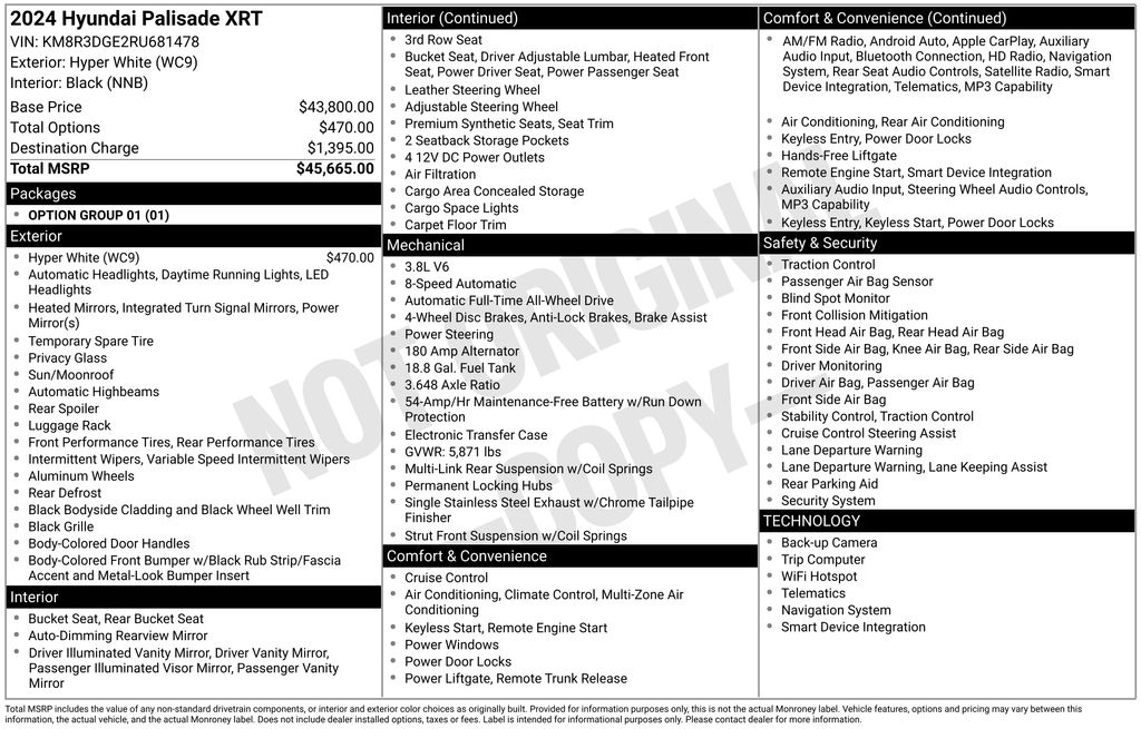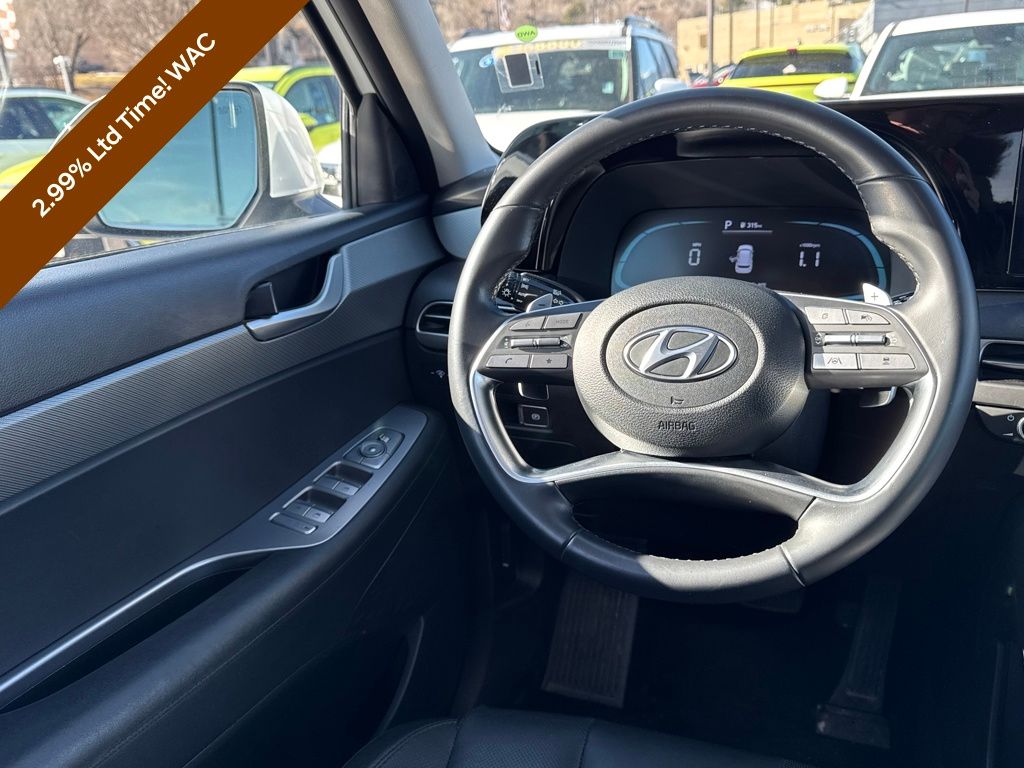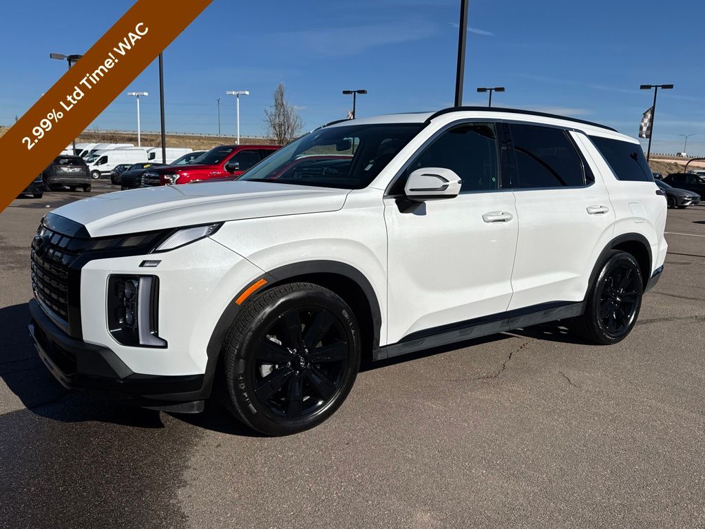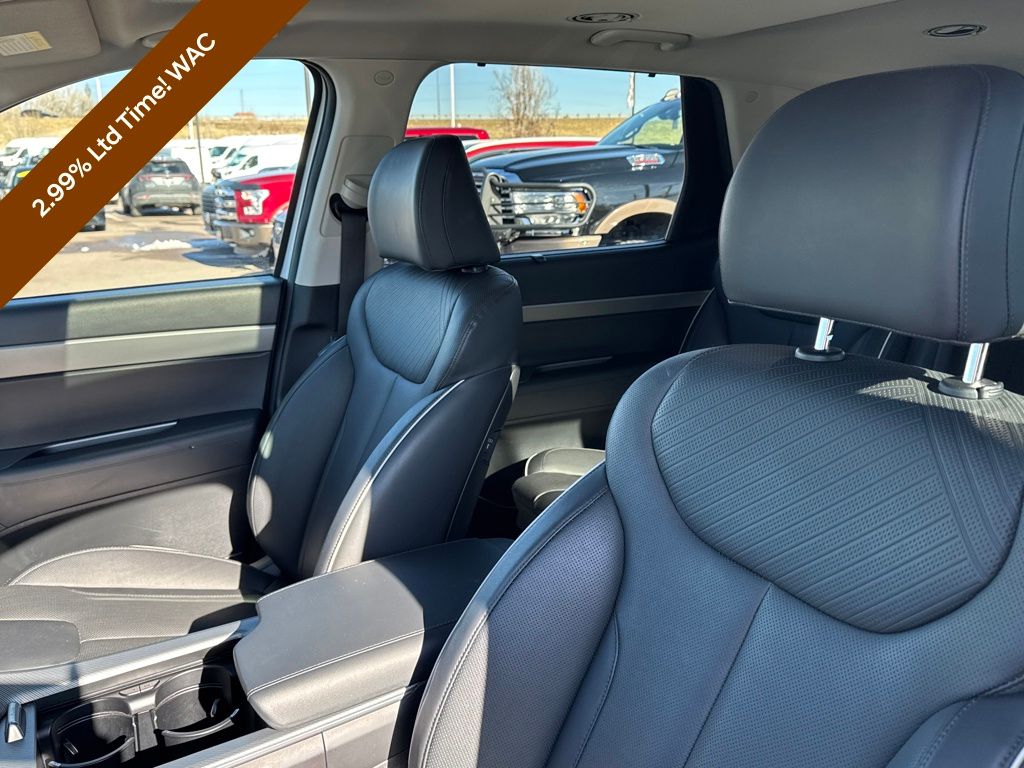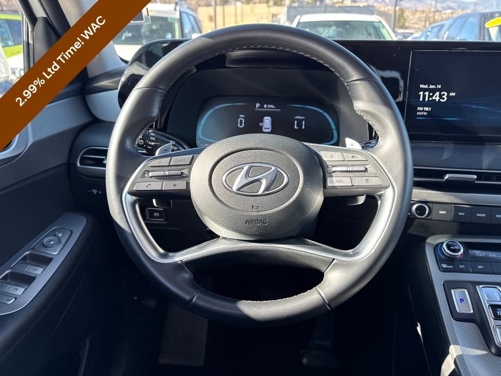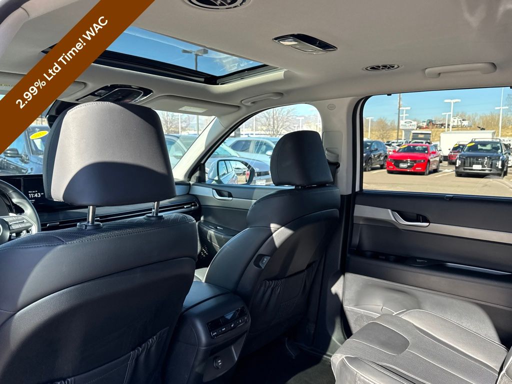 Option Group 01, Hyundai Certified Used Vehicles Certified, 3.648 Axle Ratio, 3rd row seats: split-bench, 4-Wheel Disc Brakes, 6 Speakers, ABS brakes, Air Conditioning, Alloy wheels, AM/FM radio: SiriusXM, Apple CarPlay & Android Auto, Auto High-beam Headlights, Auto-dimming door mirrors, Auto-dimming Rear-View mirror, Auto-leveling suspension, Automatic temperature control, Brake assist, Bumpers: body-color, Delay-off headlights, Driver door bin, Driver vanity mirror, Dual front impact airbags, Dual front side impact airbags, Electronic Stability Control, Emergency communication system, Exterior Parking Camera Rear, Four wheel independent suspension, Front anti-roll bar, Front Bucket Seats, Front Center Armrest, Front dual zone A/C, Front reading lights, Fully automatic headlights, H-Tex Leatherette Seat Trim, Heated door mirrors, Heated Front Bucket Seats, Heated front seats, Illuminated entry, Knee airbag, Low tire pressure warning, Navigation System, Occupant sensing airbag, Outside temperature display, Overhead airbag, Overhead console, Panic alarm, Passenger door bin, Passenger vanity mirror, Power door mirrors, Power driver seat, Power Liftgate, Power moonroof, Power passenger seat, Power steering, Power windows, Radio data system, Radio: AM/FM/MP3 Audio System, Rear air conditioning, Rear anti-roll bar, Rear audio controls, Rear reading lights, Rear side impact airbag, Rear window defroster, Rear window wiper, Reclining 3rd row seat, Remote keyless entry, Roof rack, Security system, Speed control, Speed-sensing steering, Split folding rear seat, Spoiler, Steering wheel mounted audio controls, Tachometer, Telescoping steering wheel, Tilt steering wheel, Traction control, Trip computer, Turn signal indicator mirrors, Variably intermittent wipers, and Wheels: 20" x 7.5J Dark Alloy w/Rugged Styling.