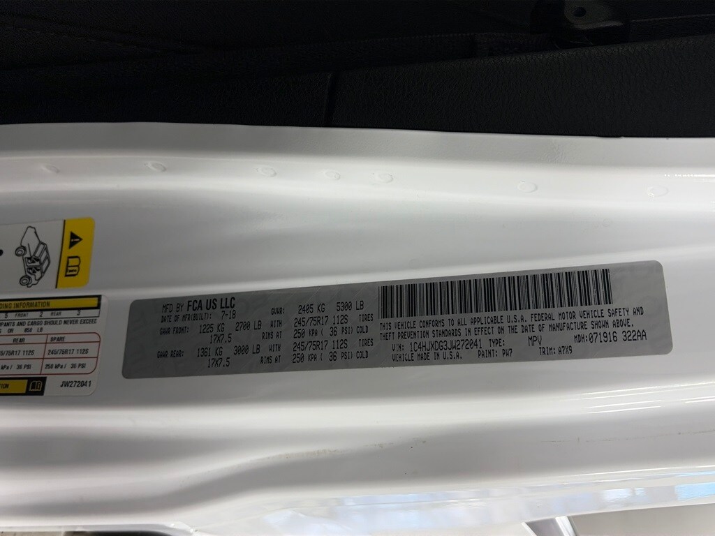 QUICK ORDER PACKAGE 24S SPORT S Engine: 3.6L V6 24V VVT UPG I w/ESS, Transmission: 8-Speed Automatic (850RE), Front 1-Touch Down Power Windows, Speed Sensitive Power Locks, Power Heated Mirrors, Automatic Headlamps, Leather Wrapped Steering Wheel, Security Alarm, Remote Keyless Entry, Sun Visors w/Illuminated Vanity Mirrors, TRANSMISSION: 8-SPEED AUTOMATIC (850RE) Tip Start, Dana M200 Rear Axle, Hill Descent Control, BLACK 3-PIECE HARD TOP Freedom Panel Storage Bag, Rear Window Defroster, Rear Window Wiper/Washer, TECHNOLOGY GROUP Google Android Auto®, Cluster 7.0 TFT Color Display, SiriusXM Satellite Radio, For More Info, Call 800-643-2112, USB Host Flip, Integrated Center Stack Radio, 7.0 Touchscreen Display, Air Conditioning w/Auto Temp Control, Radio: Uconnect 4 w/7 Display, Apple CarPlay®, Air Filtering, GPS Antenna Input, SAFETY GROUP ParkSense Rear Park Assist System, Blind Spot & Cross Path Detection, LED Taillamps, Injection Molded Black Rear Bumper, ENGINE: 3.6L V6 24V VVT UPG I W/ESS (STD). Jeep Sport S with Bright White Clearcoat exterior and Black interior features a V6 Cylinder Engine with 285 HP at 6400 RPM*.