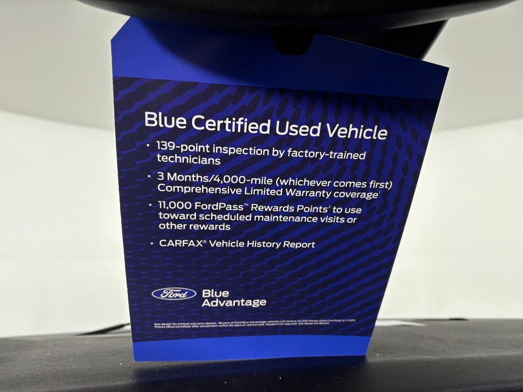 139 point vehicle inspection performed by an ASE Certified technician 3-month/4,000-mile Comprehensive Limited Warranty coverage that is fully competitive with other online retailers Blue Certification includes 11,000 FordPass Rewards Points For other manufacturers not listed above, Comprehensive Coverage is provided for 3 months or 4,000 miles, whichever comes first, from the signature date of the Ford Blue Advantage â" Blue Certified purchase. Comprehensive Limited Warranty covering 1,000+ components Travel expense reimbursement Rental car reimbursement SiriusXM 3 month tria. Recent Arrival! Odometer is 17679 miles below market average!