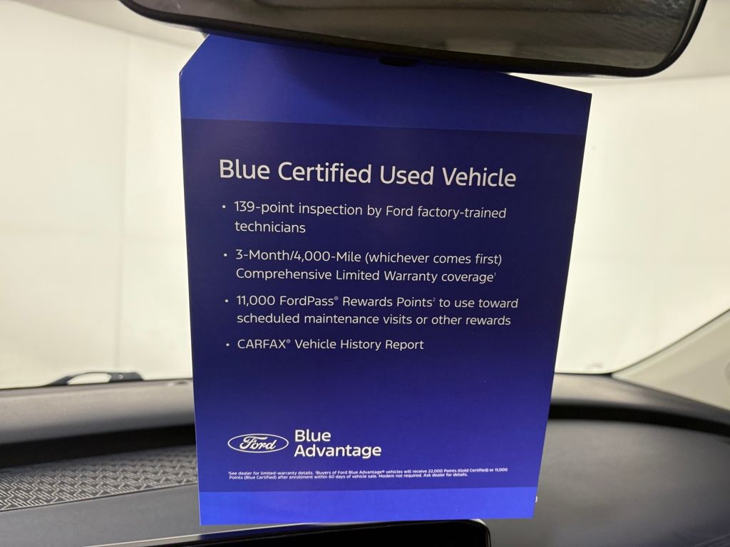 Ford Blue Certified includes:139 point vehicle inspection performed by an ASE Certified technician 3-month/4,000-mile Comprehensive Limited Warranty coverage that is fully competitive with other online retailers Blue Certification includes 11,000 FordPass Rewards Points For other manufacturers not listed above, Comprehensive Coverage is provided for 3 months or 4,000 miles, whichever comes first, from the signature date of the Ford Blue Advantage â" Blue Certified purchase. Comprehensive Limited Warranty covering 1,000+ components Travel expe