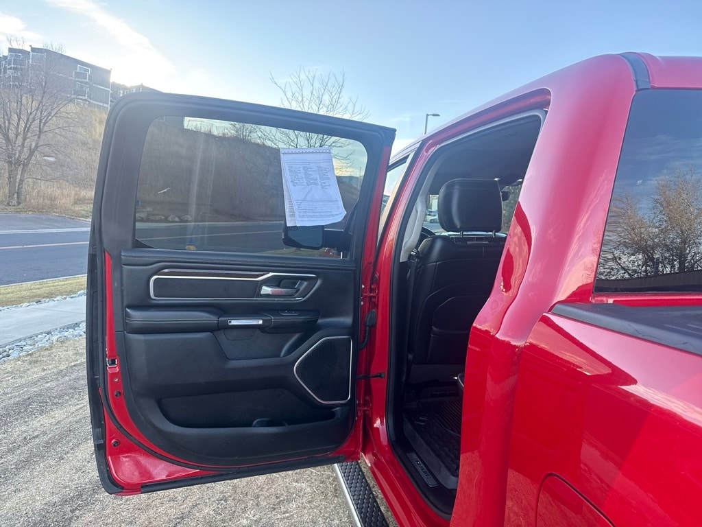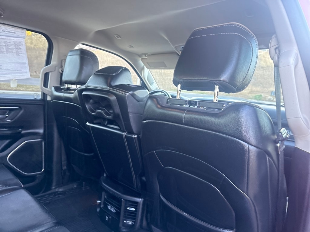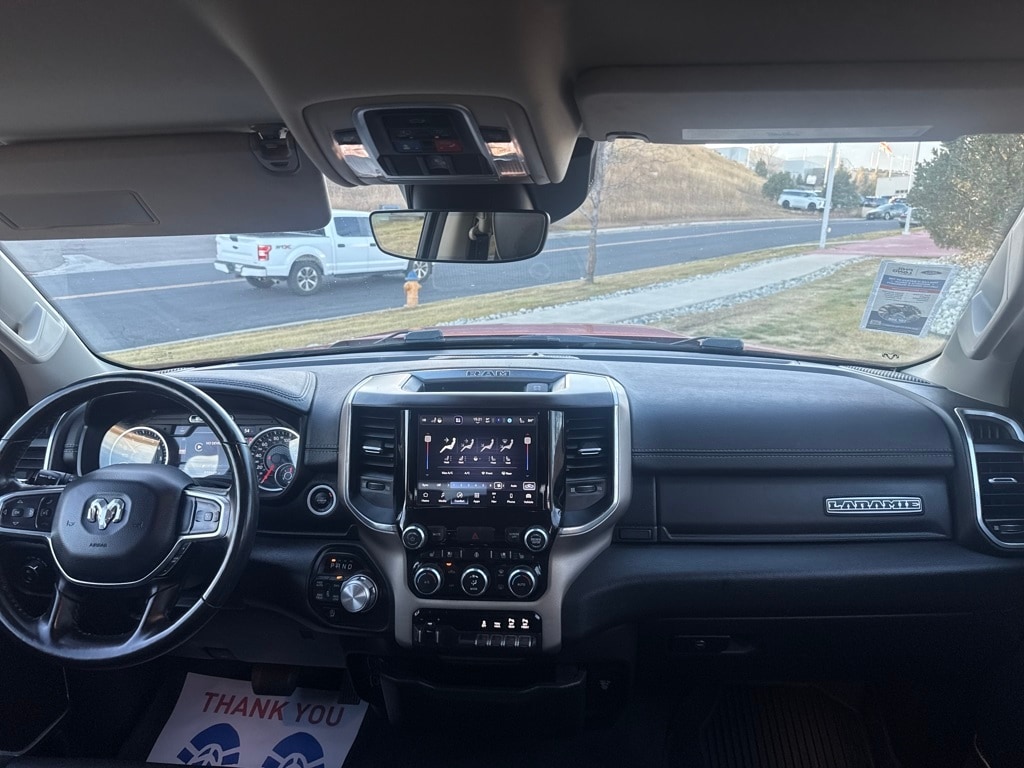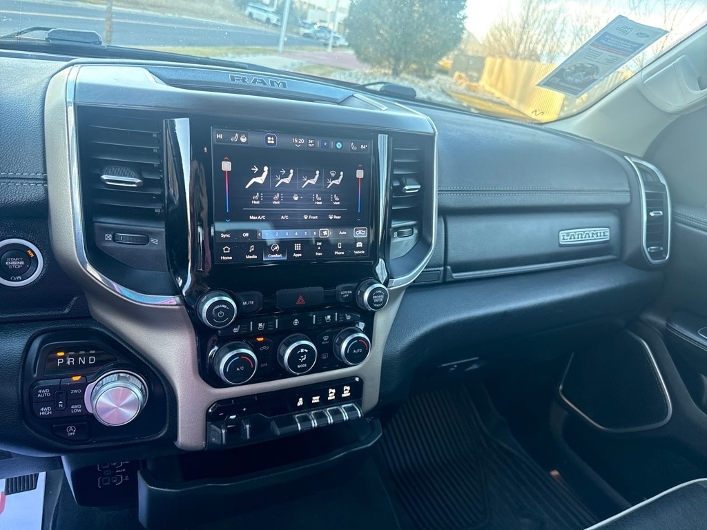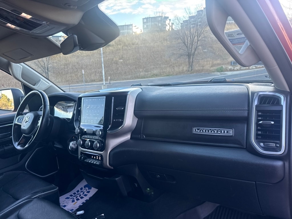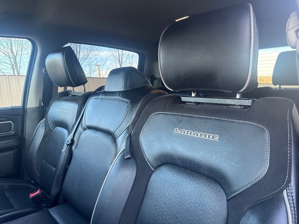 Bed Utility Group (MOPAR 4 Adjustable Cargo Tie-Down Hooks and Pick-Up Box Lighting), Laramie Level An Equipment Group (DISC) (Auto High Beam Headlamp Control, Foam Bottle Insert (Door Trim Panel), ParkSense Front/Rear Park Assist w/Stop, Rain Sensitive Windshield Wipers, Rear 60/40 Folding Split Recline Seat, and Remote Tailgate Release), Quick Order Package 27H Laramie, Ram Certified, #1 Seat Foam Cushion, 10 Speakers, 2nd Row In Floor Storage Bins, 3 Rear Seat Head Restraints, 4 Way Front Headrests, 4-Wheel Disc Brakes, 48V Belt Starter Generator, 4G LTE Wi-Fi Hot Spot, 8.4" Touchscreen Display, ABS brakes, Adjustable pedals, Air Conditioning, All R1 High Radios, All Radio Equipped Vehicles, Alloy wheels, AM/FM radio: SiriusXM, Apple CarPlay, Apple CarPlay/Android Auto, Audio memory, Auto-dimming door mirrors, Auto-Dimming Exterior Driver Mirror, Auto-dimming Rear-View mirror, Automatic temperature control, Brake assist, Bumpers: chrome, Chrome Exterior Mirrors, Chrome Power-Fold Trailer Tow Mirrors, Compass, Connected Travel & Traffic Services, Connectivity - US/Canada, Convex Wide-Angle Mirror Insert, Delay-off headlights, Disassociated Touchscreen Display, Driver door bin, Driver Seat Memory, Driver vanity mirror, Dual front impact airbags, Dual front side impact airbags, Electronic Stability Control, Exterior Mirrors Courtesy Lamps, Exterior Mirrors w/Heating Element, Exterior Mirrors w/Memory, Exterior Mirrors w/Supplemental Signals, For Details, Visit DriveUconnect.com, For More Info, Call 800-643-2112, Front anti-roll bar, Front Center Armrest w/Storage, Front dual zone A/C, Front fog lights, Front License Plate Bracket, Front reading lights, Front Seat Back Map Pockets, Front wheel independent suspension, Fully automatic headlights, Garage door transmitter, Global Telematics Box Module (TBM), Google Android Auto, GPS Antenna Input, GPS Navigation, HD Radio, Heated door mirrors, Heated Front Seats, Heated front seats, Heated Steering Wheel, Heated steering wheel, Heavy-Duty Engine Cooling, Illuminated entry, Integrated Center Stack Radio, Integrated Voice Command w/Bluetooth, Leather steering wheel, Leather Trim 40/20/40 Bench Seat, Low tire pressure warning, Memory seat, Mirror Clearance/Running Lights, Mirror-Mounted Aux Reverse Lamps, MOPAR Front & Rear Rubber Floor Mats, Occupant sensing airbag, Outside temperature display, Overhead airbag, Overhead console, Panic alarm, ParkView Rear Back-Up Camera, Passenger door bin, Passenger vanity mirror, Pedal memory, Power 2-Way Driver Lumbar Adjust, Power 2-Way Passenger Lumbar Adjust, Power 8-Way Driver & Passenger Seats, Power door mirrors, Power driver seat, Power passenger seat, Power steering, Power windows, Power-Folding Mirrors, Radio data system, Radio: Uconnect 5 Nav w/8.4" Display, Radio: Uconnect 5 W w/8.4" Display, Rear 60/40 Folding Seat, Rear anti-roll bar, Rear seat center armrest, Rear step bumper, Rear window defroster, Remote keyless entry, Security system, SiriusXM Radio Service, SiriusXM w/360L, Speed control, Split folding rear seat, Steering wheel mounted audio controls, Tachometer, Telescoping steering wheel, Tilt steering wheel, Traction control, Trailer Brake Control, Trailer Tow Mirrors, Trip computer, Turn signal indicator mirrors, USB