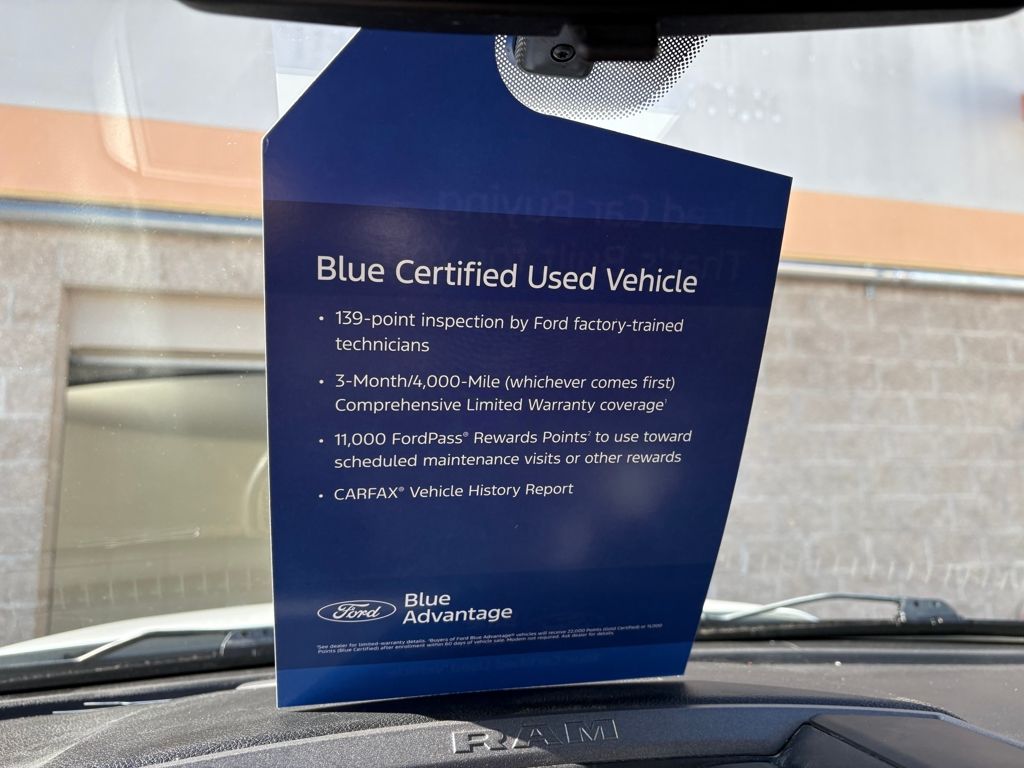 139 point vehicle inspection performed by an ASE Certified technician 3-month/4,000-mile Comprehensive Limited Warranty coverage that is fully competitive with other online retailers Blue Certification includes 11,000 FordPass Rewards Points For other manufacturers not listed above, Comprehensive Coverage is provided for 3 months or 4,000 miles, whichever comes first, from the signature date of the Ford Blue Advantage â" Blue Certified purchase. Comprehensive Limited Warranty covering 1,000+ components Travel expense reimbursement Rental car reimbursement SiriusXM 3 month tria. Recent Arrival! Odometer is 10077 miles below market average!