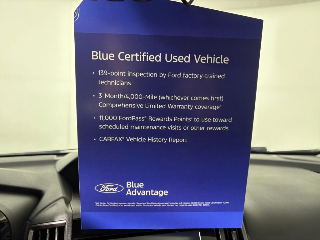 139 point vehicle inspection performed by an ASE Certified technician 3-month/4,000-mile Comprehensive Limited Warranty coverage that is fully competitive with other online retailers Blue Certification includes 11,000 FordPass Rewards Points For other manufacturers not listed above, Comprehensive Coverage is provided for 3 months or 4,000 miles, whichever comes first, from the signature date of the Ford Blue Advantage â" Blue Certified purchase. Comprehensive Limited Warranty covering 1,000+ components Travel expense reimbursement Rental car reimbursement SiriusXM 3 month tria. Recent Arrival! 28/36 City/Highway MPG