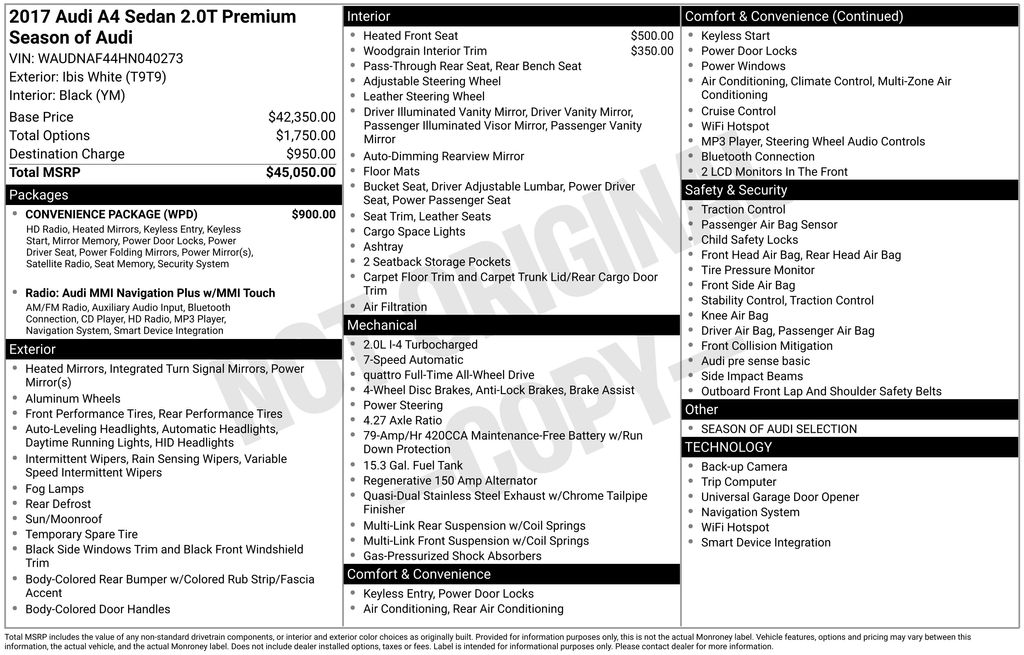 Convenience Package (SiriusXM Satellite Radio), Season of Audi Selection (Audi Connect PRIME & PLUS and Audi Virtual Cockpit), 7-Speed Automatic S tronic, quattro, Black Leather, 10 Speakers, 4-Wheel Disc Brakes, ABS brakes, Air Conditioning, Alloy wheels, AM/FM radio, Anti-whiplash front head restraints, Auto-dimming Rear-View mirror, Automatic temperature control, Brake assist, Bumpers: body-color, CD player, Compass, Delay-off headlights, Driver door bin, Driver vanity mirror, Dual front impact airbags, Dual front side impact airbags, Electronic Stability Control, Exterior Parking Camera Rear, Four wheel independent suspension, Front anti-roll bar, Front Bucket Seats, Front Center Armrest, Front dual zone A/C, Front fog lights, Front reading lights, Garage door transmitter: HomeLink, Heated door mirrors, Heated Front Seats, High intensity discharge headlights: Xenon plus, Illuminated entry, Knee airbag, Leather Seating Surfaces, Leather Shift Knob, Leather steering wheel, Low tire pressure warning, Natural Gray Oak Inlays, Navigation System, Occupant sensing airbag, Outside temperature display, Overhead airbag, Overhead console, Panic alarm, Passenger door bin, Passenger vanity mirror, Power door mirrors, Power driver seat, Power Front Bucket Seats, Power moonroof, Power passenger seat, Power steering, Power windows, Radio data system, Radio: Audi MMI Navigation Plus w/MMI Touch, Rain sensing wipers, Rear air conditioning, Rear anti-roll bar, Rear fog lights, Rear reading lights, Rear seat center armrest, Rear window defroster, Remote keyless entry, Speed control, Speed-sensing steering, Speed-Sensitive Wipers, Split folding rear seat, Steering wheel mounted audio controls, Tachometer, Telescoping steering wheel, Tilt steering wheel, Traction control, Trip computer, Turn signal indicator mirrors, Variably intermittent wipers, and Wheels: 18" 5-Arm-Twin-Spoke Design.