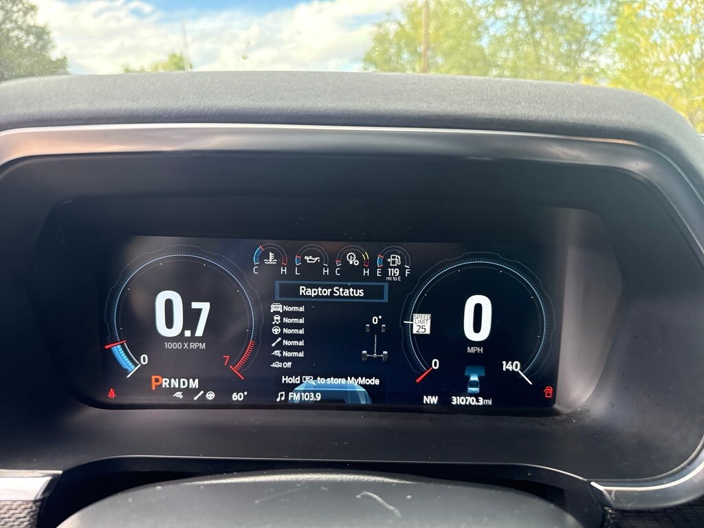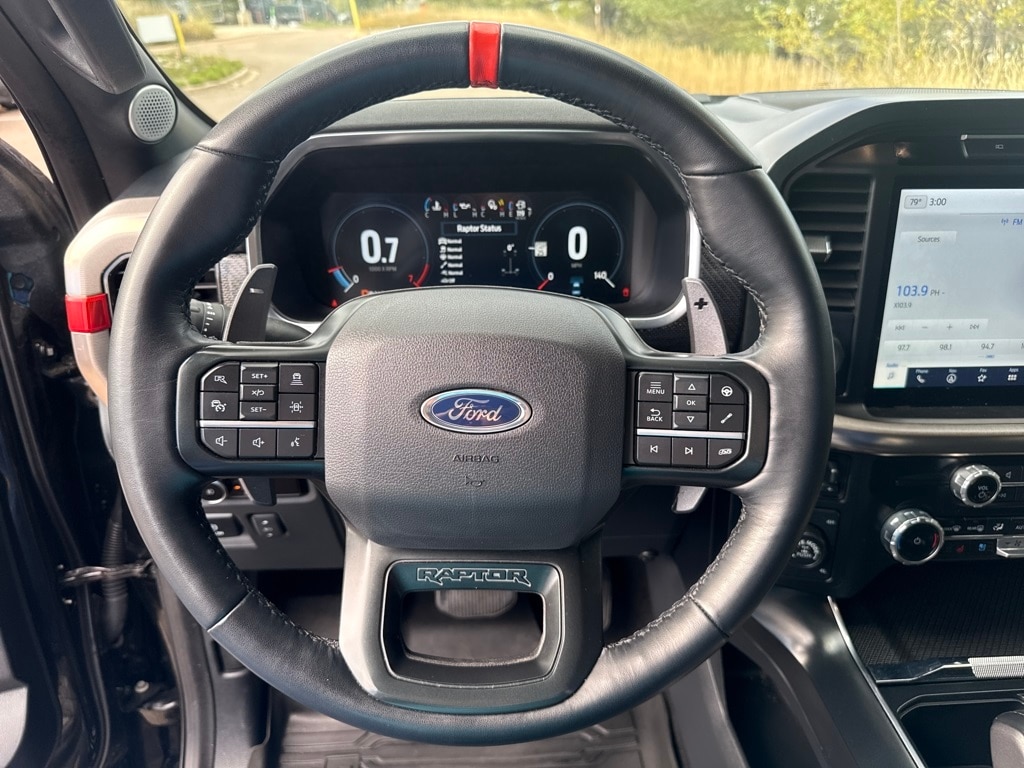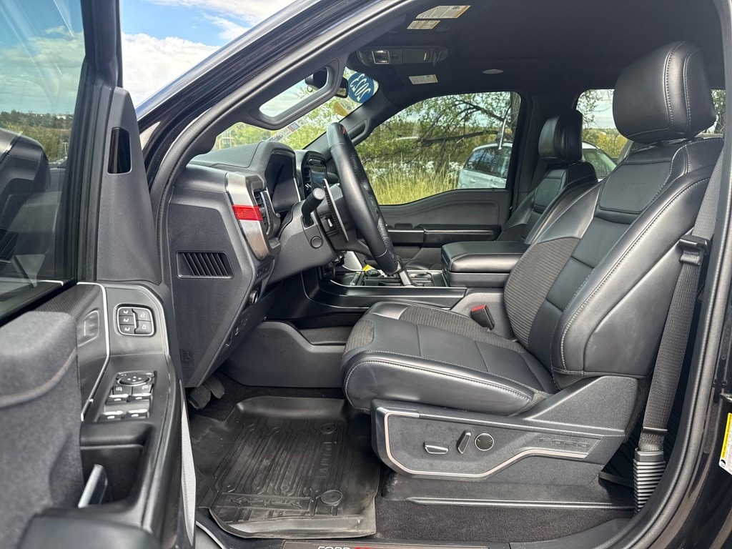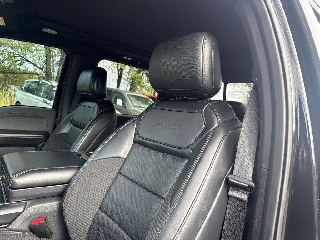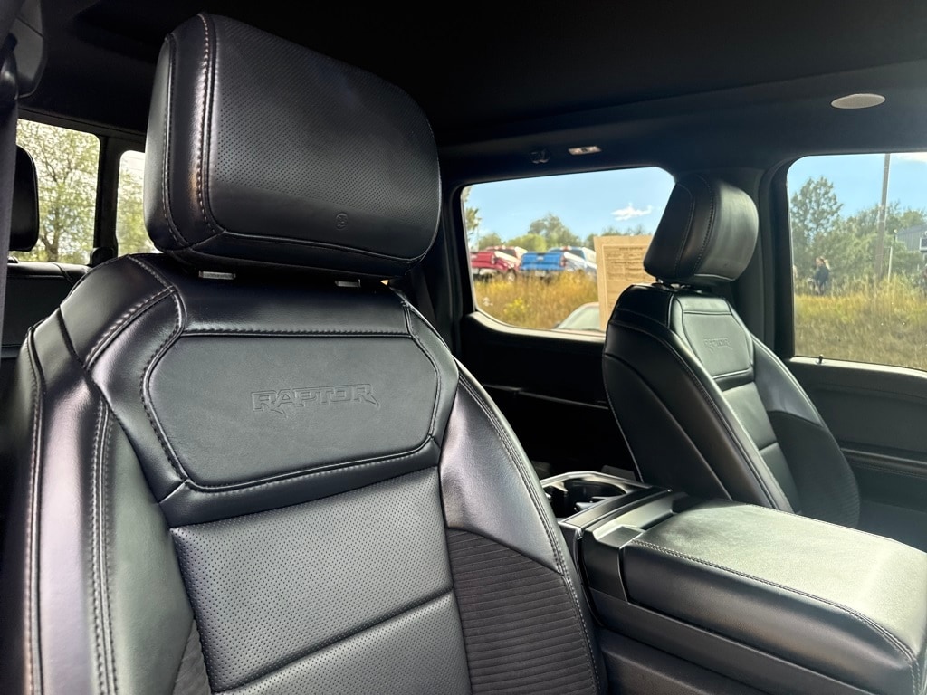 Equipment Group 801A Standard, GVWR: 7,300 lbs Payload Package, Moonroof & Tailgate (Power Tailgate and Twin Panel Moonroof), Raptor Carbon Fiber Package, 4WD, 17" Cast Aluminum Wheels, 17" Forged Aluminum Bead-Lock Capable Wheels, 18 Speakers, 4-Wheel Disc Brakes, ABS brakes, Adaptive suspension, Adjustable pedals, Air Conditioning, Alloy wheels, AM/FM radio: SiriusXM with 360L, Auto High-beam Headlights, Auto Start-Stop Removal (DISC), Auto tilt-away steering wheel, Auto-dimming door mirrors, Auto-dimming Rear-View mirror, Automatic temperature control, Brake assist, Bumpers: body-color, Compass, Delay-off headlights, Driver door bin, Driver vanity mirror, Dual front impact airbags, Dual front side impact airbags, Electronic Locking w/4.10 Axle Ratio, Electronic Stability Control, Emergency communication system, Exterior Parking Camera Rear, Front anti-roll bar, Front Bucket Seats, Front Center Armrest, Front dual zone A/C, Front fog lights, Front reading lights, Front wheel independent suspension, Fully automatic headlights, Garage door transmitter, Heated door mirrors, Heated front seats, Heated rear seats, Heated steering wheel, Illuminated entry, Inclination/Intrusion Sensor Removal, Lane Departure Warning System, Leather Trim Seats w/Heated 2nd Row, Low tire pressure warning, Memory seat, Navigation system: Connected Navigation, Occupant sensing airbag, Outside temperature display, Overhead airbag, Overhead console, Panic alarm, Passenger door bin, Passenger vanity mirror, Pedal memory, Power door mirrors, Power driver seat, Power passenger seat, Power steering, Power windows, Radio data system, Radio: B&O Unleashed Sound System by Bang & Olufsen, Rain sensing wipers, Rear reading lights, Rear step bumper, Rear window defroster, Remote keyless entry, Security system, Speed control, Speed-sensing steering, Split folding rear seat, Steering Wheel Heat Removal (DISC), Steering wheel memory, Steering wheel mounted audio controls, SYNC 4 w/Enhanced Voice Recognition, Tachometer, Telescoping steering wheel, Tilt steering wheel, Traction control, Trip computer, Turn signal indicator mirrors, Variably intermittent wipers, and Ventilated front seats.