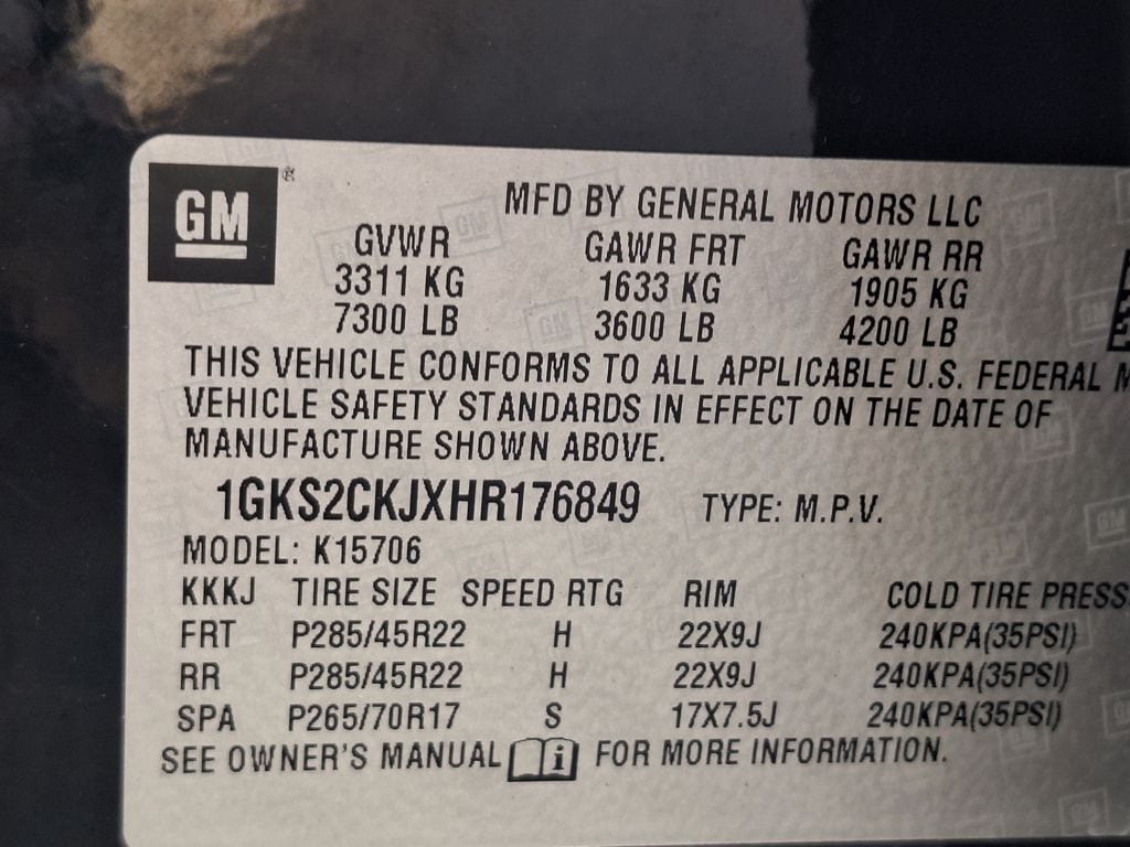 Adaptive Cruise Control w/Front Automatic Braking (4-Wheel Disc & 4-Wheel VAC Power Antilock Brakes and Automatic Collision Preparation), Enhanced Driver Alert Package (Forward Collision Alert Sensor Indicator, Intellibeam Automatic High Beam On/Off Headlamps, Lane Keep Assist, and Low Speed Forward Automatic Braking), License Plate Front Mounting Package, Magnetic Ride Control Suspension Package, Memory Package, Open Road Package (Power Tilt-Sliding Sunroof w/Express-Open/Close and Rear Seat Blu-Ray/DVD Entertainment System), Preferred Equipment Group 5SA (17" Disc/Disc VAC Power Brakes, 5 Auxiliary 12-volt Power Outlets, Black Assist Steps w/Chrome Strip, Hands Free Power Liftgate, Heated Leather-Wrapped Steering Wheel, Inside Rear-View Auto-Dimming Mirror, Integrated Trailer Brake Controller, OnStar Basic Plan For 5 Years, OnStar w/4G LTE, Passive Entry System, Power Release Second Row Bucket Seats, Power Tilt & Telescopic Steering Column, Power-Adjustable Pedals For Accelerator & Brake, Push Button Keyless Start, Rear Cross-Traffic Alert, Remote Keyless Entry, Side Blind Zone Alert w/Lane Change Alert, Universal Home Remote, and Wireless Charging), 4WD, 10 Speakers, 3.23 Axle Ratio, 3rd row seats: split-bench, 4-Wheel Disc Brakes, ABS brakes, Adaptive suspension, Adjustable pedals, Air Conditioning, All-Weather Floor Mats, Alloy wheels, AM/FM radio: SiriusXM, Apple CarPlay/Android Auto, Auto High-beam Headlights, Auto-dimming door mirrors, Auto-dimming Rear-View mirror, Automatic temperature control, Bodyside moldings, Bose Centerpoint Premium 10-Speaker Surround Sound, Brake assist, Bumpers: body-color, CD Player, CD player, Compass, Delay-off headlights, Driver door bin, Driver vanity mirror, Dual front impact airbags, Dual front side impact airbags, Electronic Stability Control, Emergency communication system: OnStar Guidance, Exterior Parking Camera Rear, Front anti-roll bar, Front Bucket Seats, Front Center Armrest, Front dual zone A/C, Front fog lights, Front reading lights, Front wheel independent suspension, Full-Feature Reclining Bucket Seats, Fully automatic headlights, Garage door transmitter, Genuine wood console insert, Genuine wood dashboard insert, Genuine wood door panel insert, Heads-Up Display, Heated & Ventilated Driver & Front Passenger Seats, Heated door mirrors, Heated front seats, Heated rear seats, Heated steering wheel, High-Intensity Discharge Headlights, Illuminated entry, Leather Shift Knob, Low tire pressure warning, Memory seat, Navigation System, NavTraffic, Occupant sensing airbag, Outside temperature display, Overhead airbag, Overhead console, Panic alarm, Passenger door bin, Passenger vanity mirror, Pedal memory, Perforated Leather-Appointed Seat Trim, Polished Exhaust Tip, Power door mirrors, Power driver seat, Power Liftgate, Power passenger seat, Power steering, Power windows, Premium audio system: IntelliLink, Radio: AM/FM/SiriusXM w/Navigation, Rain sensing wipers, Rear air conditioning, Rear anti-roll bar, Rear reading lights, Rear window defroster, Rear window wiper, Remote keyless entry, Roof rack: rails only, Security system, SiriusXM Satellite Radio, Speed control, Speed-sensing steering, Split folding rear seat, Spoiler, Steering wheel memory, Steering wheel mounted audio controls, Tachometer, Telescoping steering wheel, Tilt steering wheel, Traction control, Trip computer, Turn signal indicator mirrors, Variably intermittent w