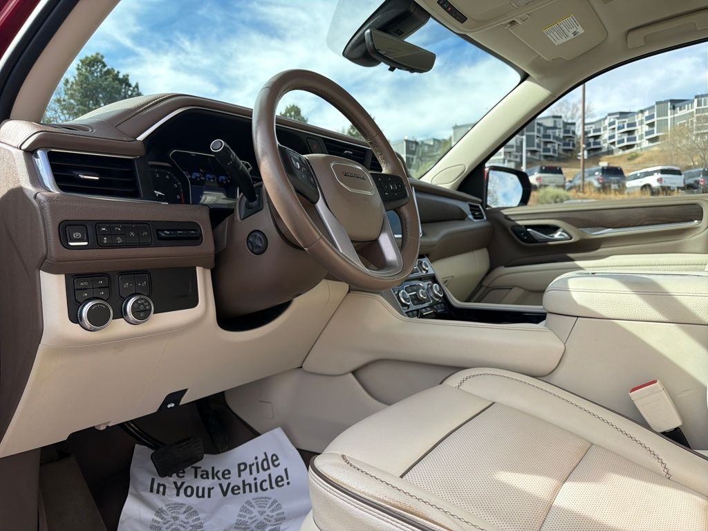 Advanced Security Package (Glass Breakage Sensor, Theft-Deterrent Alarm System, Vehicle Inclination Sensor, and Vehicle Interior Movement Sensor), Advanced Technology Package (Adaptive Cruise Control, Enhanced Automatic Emergency Braking, Inside Rearview Auto-Dimming Rear Camera Mirror, and Rear Camera Mirror Washer), License Plate Front Mounting Package, Preferred Equipment Group 5SA (15" Diagonal Multi-Color Head-Up Display, Bright Front & Rear Door Sill Plates, Dual Exhaust System, Galvano Bodyside Moldings, Hands-Free Power Programmable Rear Liftgate, HD Surround Vision, 12-Way Power Seat Adjusters, 2 Presets For Outside Rearview Mirrors, 3rd Row 60/40 Power-Folding Split-Bench Seat, Chrome Door Handles w/Body-Color Strip, Heated & Ventilated Driver & Front Passenger Seats, Heated 2nd Row Outboard Position Seats, Heated Automatic Steering Wheel, Heated Driver & Front Passenger Seats, Hill Descent Control, Inside Rear-View Auto-Dimming Mirror, Outside Heated Power-Adjustable Mirrors, Power Release 2nd Row Bucket Seats, Power Tilt & Telescopic Steering Column, Rear Pedestrian Alert, Safety Alert Seat, and Universal Home Remote), 4WD, 14 Speakers, Adaptive suspension, Bodyside moldings, Front Pedestrian Braking, Heads-Up Display, Lane Keep Assist w/Lane Departure Warning, Leather steering wheel, Memory seat, Navigation System, Steering wheel mounted audio controls, 3.23 Rear Axle Ratio, 3rd row seats: split-bench, 4-Wheel Disc Brakes, ABS brakes, Air Conditioning, Alloy wheels, AM/FM radio: SiriusXM with 360L, Apple CarPlay/Android Auto, Auto High-beam Headlights, Auto-dimming door mirrors, Auto-dimming Rear-View mirror, Auto-leveling suspension, Automatic Emergency Braking, Automatic temperature control, Bose 14-Speaker Surround w/CenterPoint, Brake assist, Bumpers: body-color, Compass, Console-Mounted Safe (LPO), Delay-off headlights, Driver door bin, Driver vanity mirror, Dual front impact airbags, Dual front side impact airbags, Electronic Stability Control, Emergency communication system: OnStar and GMC connected services capable, Following Distance Indicator, Forward Collision Alert, Four wheel independent suspension, Front & Rear Park Assist, Front anti-roll bar, Front Bucket Seats, Front Center Armrest, Front dual zone A/C, Front fog lights, Front reading lights, Fully automatic headlights, Garage door transmitter, HD Radio, Heated door mirrors, Heated front seats, Heated rear seats, Heated steering wheel, Illuminated entry, IntelliBeam Automatic High Beam On/Off, Lane