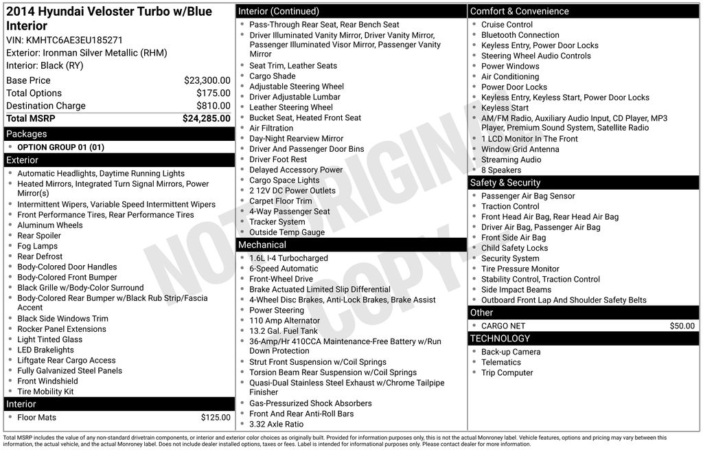 Option Group 01, 18" x 7.5J Alloy w/Chrome Accents Wheels, 4-Wheel Disc Brakes, 8 Speakers, ABS brakes, Air Conditioning, Alloy wheels, AM/FM radio: SiriusXM, Brake assist, Bumpers: body-color, Cargo Net, Carpet Floor Mats, CD player, Driver door bin, Driver vanity mirror, Dual front impact airbags, Dual front side impact airbags, Electronic Stability Control, Emergency communication system: Blue Link, Exterior Parking Camera Rear, Front anti-roll bar, Front Bucket Seats, Front Center Armrest w/Storage, Front fog lights, Front reading lights, Front wheel independent suspension, Heated door mirrors, Heated Front Bucket Seats, Heated front seats, Illuminated entry, Leather Seating Surfaces, Leather steering wheel, Low tire pressure warning, Occupant sensing airbag, Outside temperature display, Overhead airbag, Overhead console, Panic alarm, Passenger door bin, Passenger vanity mirror, Power door mirrors, Power steering, Power windows, Radio: AM/FM/SiriusXM/CD/MP3 Dimension Premium, Rear anti-roll bar, Rear window defroster, Rear window wiper, Remote keyless entry, Security system, Speed control, Speed-sensing steering, Split folding rear seat, Spoiler, Steering wheel mounted audio controls, Tachometer, Telescoping steering wheel, Tilt steering wheel, Traction control, Trip computer, Turn signal indicator mirrors, and Variably intermittent wipers.