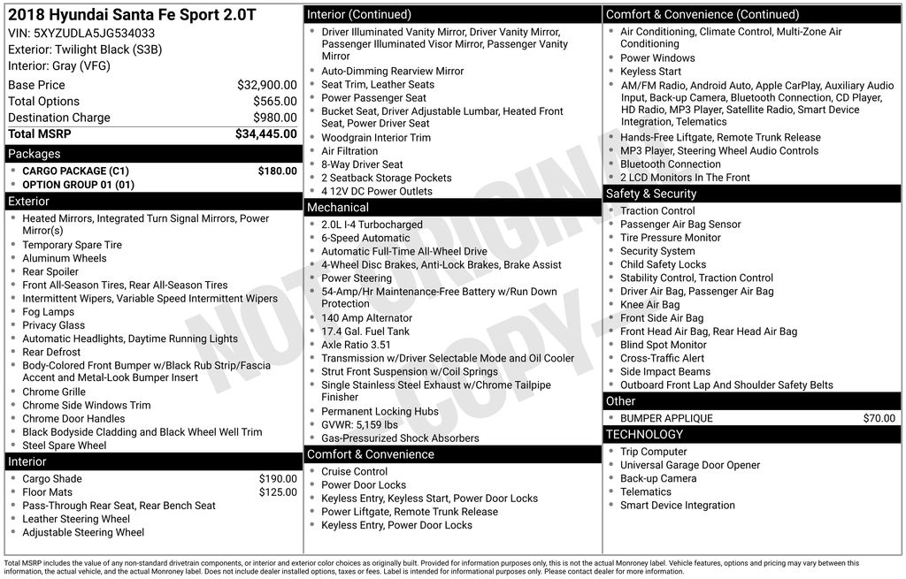 Cargo Package, Option Group 01, 18" x 7.5" Alloy Wheels, 4-Wheel Disc Brakes, 6 Speakers, ABS brakes, Air Conditioning, Alloy wheels, AM/FM radio: SiriusXM, Apple CarPlay & Android Auto, Auto-dimming Rear-View mirror, Automatic temperature control, Axle Ratio 3.51, Brake assist, Bumper Applique, Bumpers: body-color, Cargo Cover, Carpeted Floor Mats, CD player, Compass, Delay-off headlights, Driver door bin, Driver vanity mirror, Dual front impact airbags, Dual front side impact airbags, Electronic Stability Control, Emergency communication system: Blue Link, Exterior Parking Camera Rear, Four wheel independent suspension, Front anti-roll bar, Front Bucket Seats, Front Center Armrest, Front dual zone A/C, Front fog lights, Front reading lights, Fully automatic headlights, Garage door transmitter: HomeLink, Heated door mirrors, Heated Front Bucket Seats, Heated front seats, Illuminated entry, Knee airbag, Leather Seating Surface, Leather steering wheel, Low tire pressure warning, Occupant sensing airbag, Outside temperature display, Overhead airbag, Overhead console, Panic alarm, Passenger door bin, Passenger vanity mirror, Power door mirrors, Power driver seat, Power Liftgate, Power passenger seat, Power steering, Power windows, Radio: AM/FM/SiriusXM/CD/HD/MP3 Display Audio, Rear anti-roll bar, Rear seat center armrest, Rear window defroster, Rear window wiper, Remote keyless entry, Roof rack: rails only, Security system, Speed control, Speed-sensing steering, Split folding rear seat, Spoiler, Steering wheel mounted audio controls, Tachometer, Telescoping steering wheel, Tilt steering wheel, Traction control, Trip computer, Turn signal indicator mirrors, and Variably intermittent wipers.