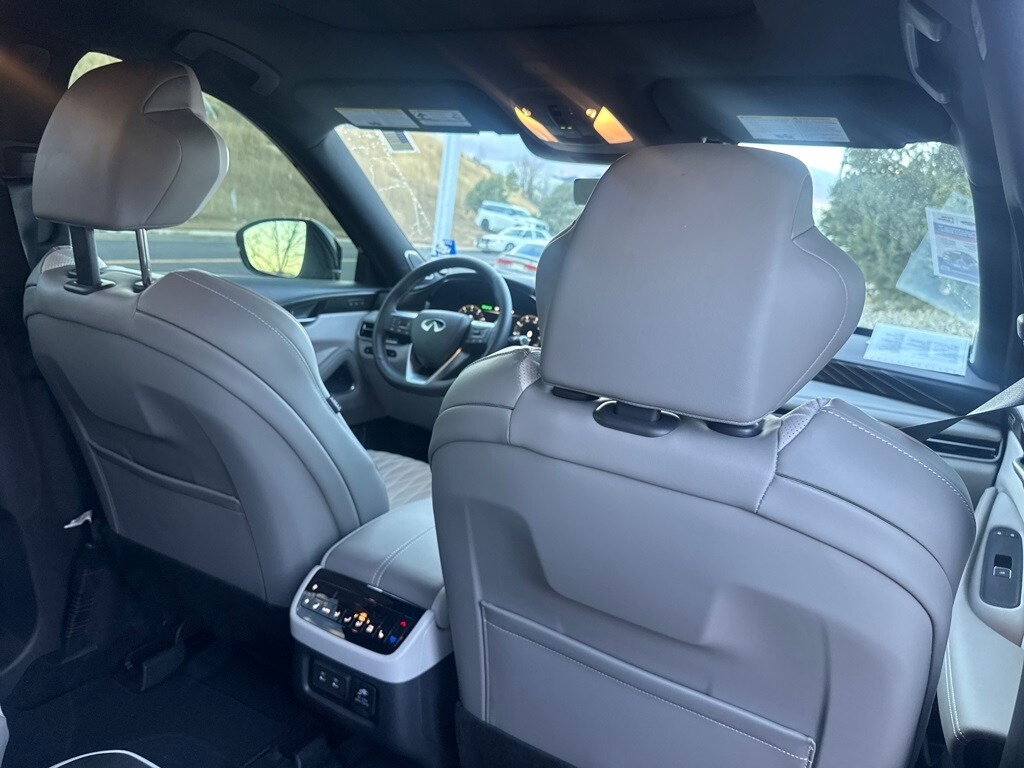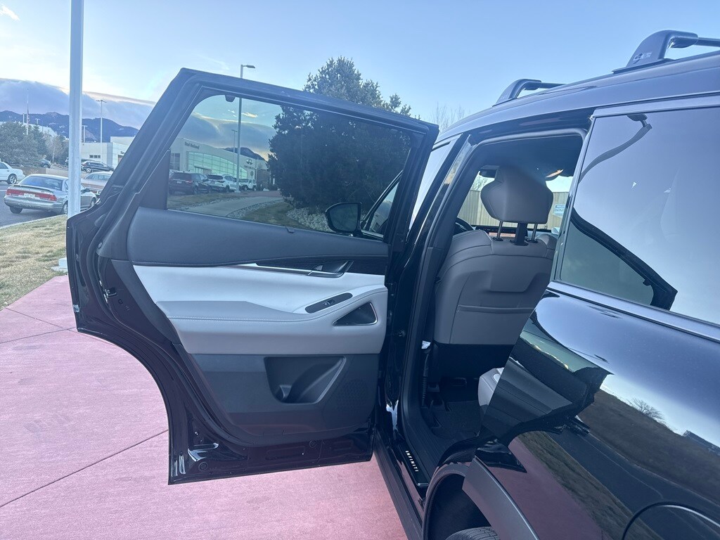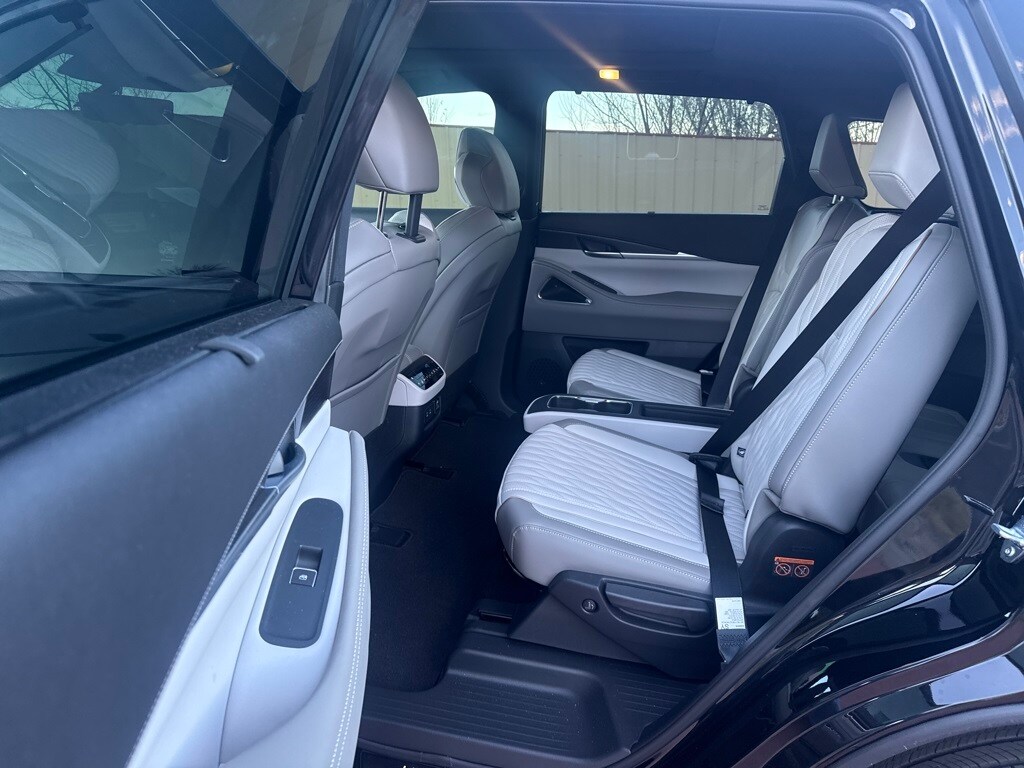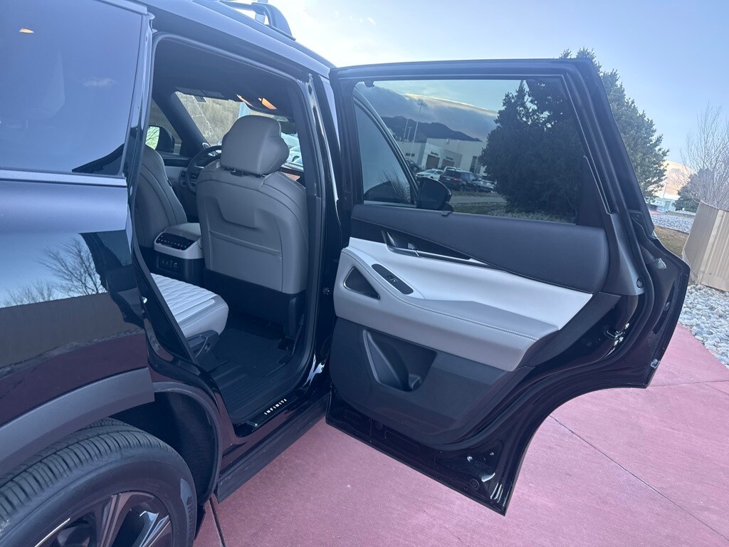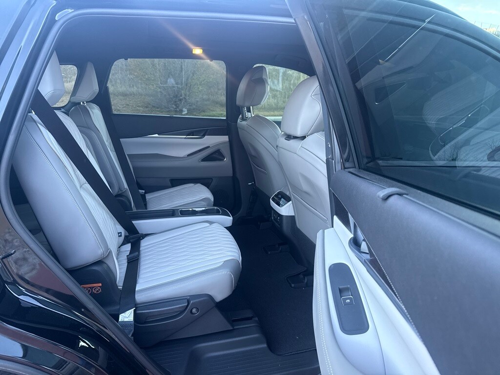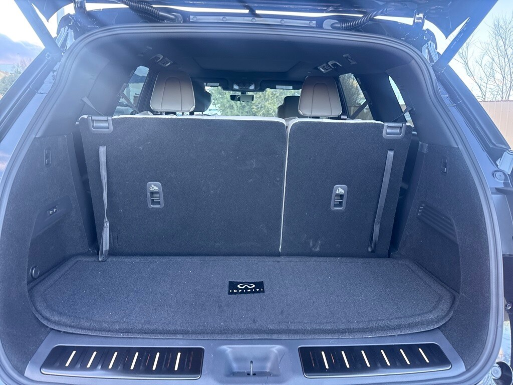 Dark Cargo Package (Black Rear Bumper Film, Cargo Blocks, Cargo Mat, Cargo Net, and Medic Kit), 20 Speakers, 3rd row seats: bench, 4-Wheel Disc Brakes, ABS brakes, Air Conditioning, Alloy wheels, AM/FM radio: SiriusXM with 360L, Anti-whiplash front head restraints, Apple CarPlay/Android Auto, Auto High-beam Headlights, Auto tilt-away steering wheel, Auto-dimming door mirrors, Auto-dimming Rear-View mirror, Automatic temperature control, Black Roof Rail Crossbars, Bose Performance Series 17-Speaker Sound System, Brake assist, Bumpers: body-color, Carpeted Floor Mats w/Captains Chairs on 3rd Row Tray, Climate Controlled Massaging Front Bucket Seats, Dark Illuminated Kick Plates, Delay-off headlights, Driver door bin, Driver vanity mirror, Dual front impact airbags, Dual front side impact airbags, Electronic Stability Control, Emergency communication system: INFINITI InTouch, Four wheel independent suspension, Front anti-roll bar, Front Bucket Seats, Front Center Armrest, Front dual zone A/C, Front reading lights, Fully automatic headlights, Garage door transmitter: HomeLink, Genuine wood door panel insert, Heads-Up Display, Heated door mirrors, Heated front seats, Heated rear seats, Heated steering wheel, Illuminated entry, INFINITI Radiant Dark Illum Cargo Scuff Plates, Knee airbag, Leather Shift Knob, Leather steering wheel, Literature Kit, Low tire pressure warning, Memory seat, Navigation system: Google Built-in, Occupant sensing airbag, Outside temperature display, Overhead airbag, Overhead console, Panic alarm, Passenger door bin, Passenger vanity mirror, Power door mirrors, Power driver seat, Power Liftgate, Power moonroof: Panoramic, Power passenger seat, Power steering, Power windows, Premium Paint, Radio data system, Radio: Klipsch Reference Premiere Audio System, Rain sensing wipers, Rear air conditioning, Rear anti-roll bar, Rear reading lights, Rear side impact airbag, Rear window defroster, Rear window wiper, Reclining 3rd row seat, Remote keyless entry, Security system, Semi Aniline Leather-Appointed Seating Surfaces, Speed control, Speed-sensing steering, Speed-Sensitive Wipers, Splash Guards, Split folding rear seat, Spoiler, Steering wheel memory, Steering wheel mounted audio controls, Tachometer, Telescoping steering wheel, Tilt steering wheel, Traction control, Trip computer, Turn signal indicator mirrors, Variably intermittent wipers, Ventilated front seats, and Wheels: 20" x 8J Luxury Machined Aluminum Alloy.
