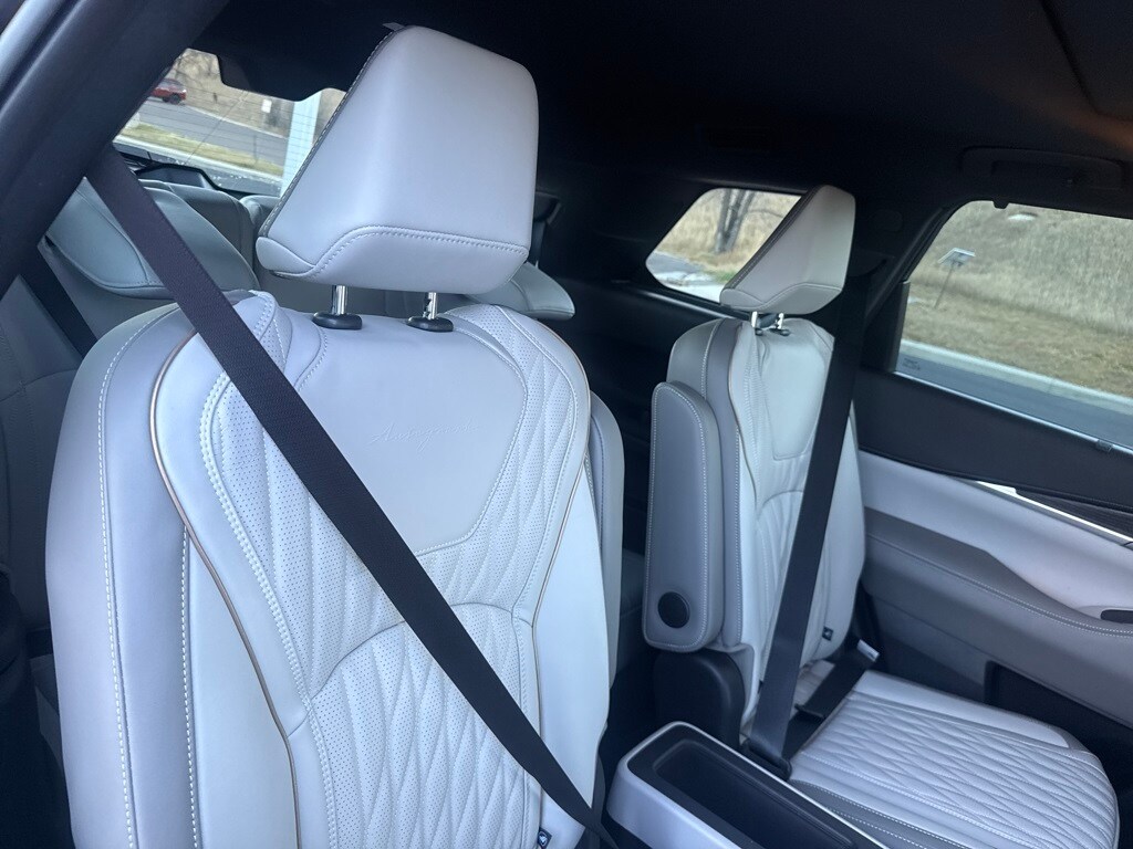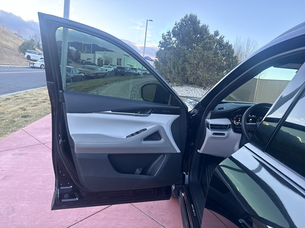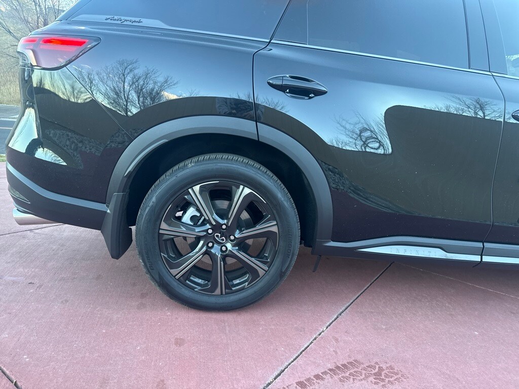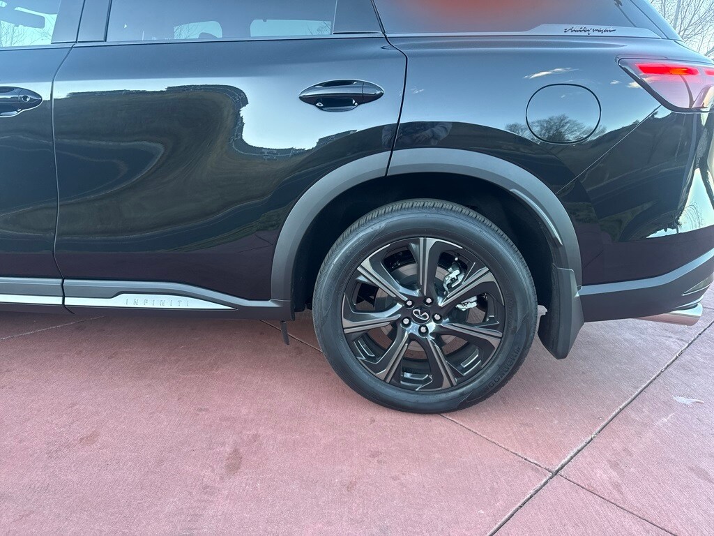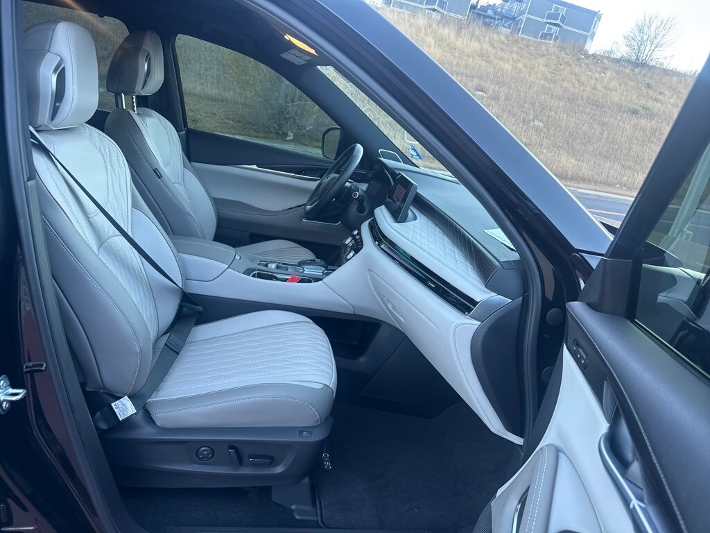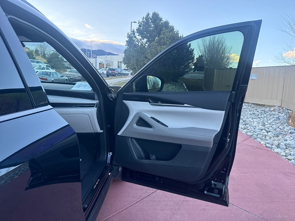 Dark Cargo Package (Black Rear Bumper Film, Cargo Blocks, Cargo Mat, Cargo Net, and Medic Kit), 20 Speakers, 3rd row seats: bench, 4-Wheel Disc Brakes, ABS brakes, Air Conditioning, Alloy wheels, AM/FM radio: SiriusXM with 360L, Anti-whiplash front head restraints, Apple CarPlay/Android Auto, Auto High-beam Headlights, Auto tilt-away steering wheel, Auto-dimming door mirrors, Auto-dimming Rear-View mirror, Automatic temperature control, Black Roof Rail Crossbars, Bose Performance Series 17-Speaker Sound System, Brake assist, Bumpers: body-color, Carpeted Floor Mats w/Captains Chairs on 3rd Row Tray, Climate Controlled Massaging Front Bucket Seats, Dark Illuminated Kick Plates, Delay-off headlights, Driver door bin, Driver vanity mirror, Dual front impact airbags, Dual front side impact airbags, Electronic Stability Control, Emergency communication system: INFINITI InTouch, Four wheel independent suspension, Front anti-roll bar, Front Bucket Seats, Front Center Armrest, Front dual zone A/C, Front reading lights, Fully automatic headlights, Garage door transmitter: HomeLink, Genuine wood door panel insert, Heads-Up Display, Heated door mirrors, Heated front seats, Heated rear seats, Heated steering wheel, Illuminated entry, INFINITI Radiant Dark Illum Cargo Scuff Plates, Knee airbag, Leather Shift Knob, Leather steering wheel, Literature Kit, Low tire pressure warning, Memory seat, Navigation system: Google Built-in, Occupant sensing airbag, Outside temperature display, Overhead airbag, Overhead console, Panic alarm, Passenger door bin, Passenger vanity mirror, Power door mirrors, Power driver seat, Power Liftgate, Power moonroof: Panoramic, Power passenger seat, Power steering, Power windows, Premium Paint, Radio data system, Radio: Klipsch Reference Premiere Audio System, Rain sensing wipers, Rear air conditioning, Rear anti-roll bar, Rear reading lights, Rear side impact airbag, Rear window defroster, Rear window wiper, Reclining 3rd row seat, Remote keyless entry, Security system, Semi Aniline Leather-Appointed Seating Surfaces, Speed control, Speed-sensing steering, Speed-Sensitive Wipers, Splash Guards, Split folding rear seat, Spoiler, Steering wheel memory, Steering wheel mounted audio controls, Tachometer, Telescoping steering wheel, Tilt steering wheel, Traction control, Trip computer, Turn signal indicator mirrors, Variably intermittent wipers, Ventilated front seats, and Wheels: 20" x 8J Luxury Machined Aluminum Alloy.