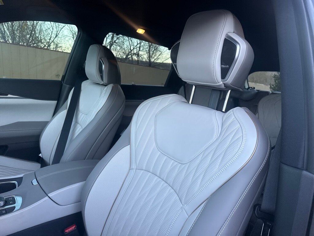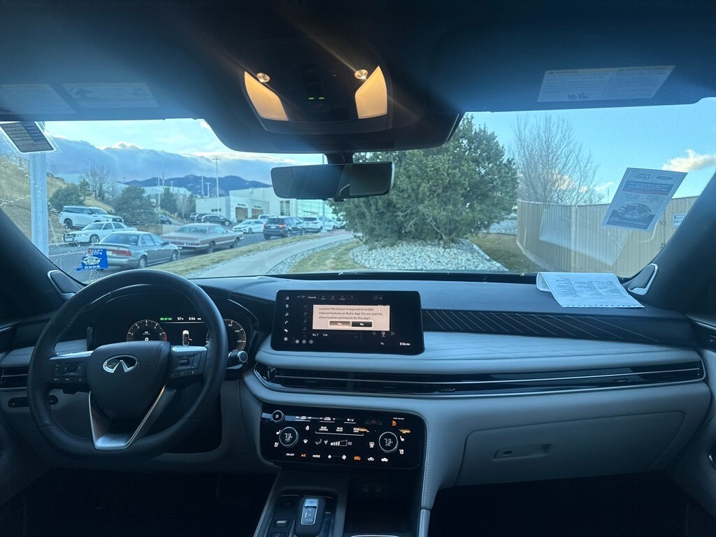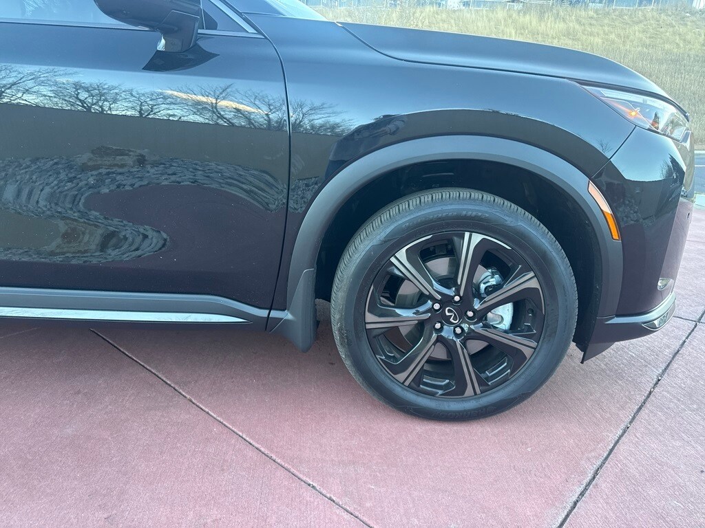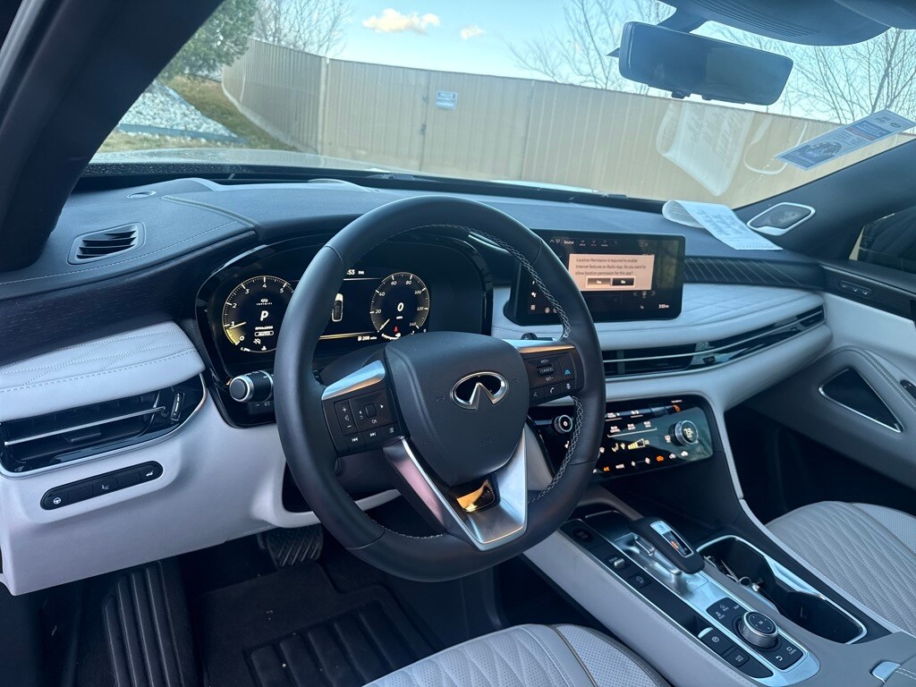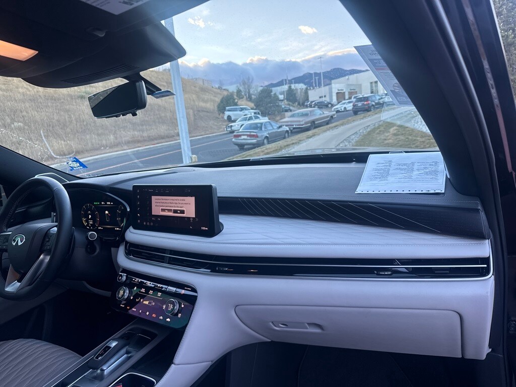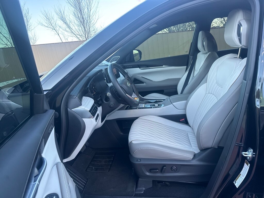 Dark Cargo Package (Black Rear Bumper Film, Cargo Blocks, Cargo Mat, Cargo Net, and Medic Kit), 20 Speakers, 3rd row seats: bench, 4-Wheel Disc Brakes, ABS brakes, Air Conditioning, Alloy wheels, AM/FM radio: SiriusXM with 360L, Anti-whiplash front head restraints, Apple CarPlay/Android Auto, Auto High-beam Headlights, Auto tilt-away steering wheel, Auto-dimming door mirrors, Auto-dimming Rear-View mirror, Automatic temperature control, Black Roof Rail Crossbars, Bose Performance Series 17-Speaker Sound System, Brake assist, Bumpers: body-color, Carpeted Floor Mats w/Captains Chairs on 3rd Row Tray, Climate Controlled Massaging Front Bucket Seats, Dark Illuminated Kick Plates, Delay-off headlights, Driver door bin, Driver vanity mirror, Dual front impact airbags, Dual front side impact airbags, Electronic Stability Control, Emergency communication system: INFINITI InTouch, Four wheel independent suspension, Front anti-roll bar, Front Bucket Seats, Front Center Armrest, Front dual zone A/C, Front reading lights, Fully automatic headlights, Garage door transmitter: HomeLink, Genuine wood door panel insert, Heads-Up Display, Heated door mirrors, Heated front seats, Heated rear seats, Heated steering wheel, Illuminated entry, INFINITI Radiant Dark Illum Cargo Scuff Plates, Knee airbag, Leather Shift Knob, Leather steering wheel, Literature Kit, Low tire pressure warning, Memory seat, Navigation system: Google Built-in, Occupant sensing airbag, Outside temperature display, Overhead airbag, Overhead console, Panic alarm, Passenger door bin, Passenger vanity mirror, Power door mirrors, Power driver seat, Power Liftgate, Power moonroof: Panoramic, Power passenger seat, Power steering, Power windows, Premium Paint, Radio data system, Radio: Klipsch Reference Premiere Audio System, Rain sensing wipers, Rear air conditioning, Rear anti-roll bar, Rear reading lights, Rear side impact airbag, Rear window defroster, Rear window wiper, Reclining 3rd row seat, Remote keyless entry, Security system, Semi Aniline Leather-Appointed Seating Surfaces, Speed control, Speed-sensing steering, Speed-Sensitive Wipers, Splash Guards, Split folding rear seat, Spoiler, Steering wheel memory, Steering wheel mounted audio controls, Tachometer, Telescoping steering wheel, Tilt steering wheel, Traction control, Trip computer, Turn signal indicator mirrors, Variably intermittent wipers, Ventilated front seats, and Wheels: 20" x 8J Luxury Machined Aluminum Alloy.