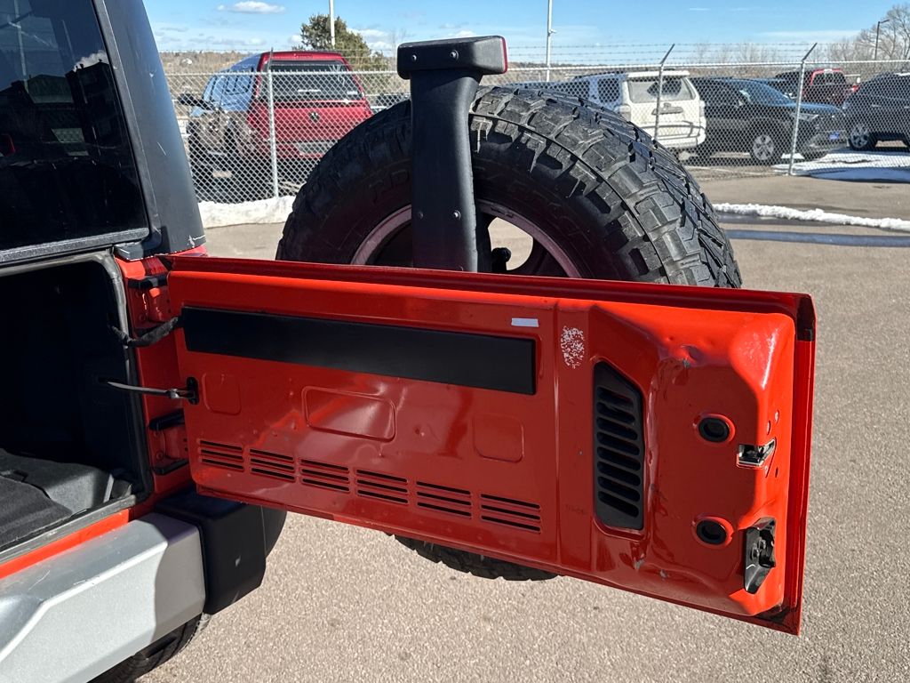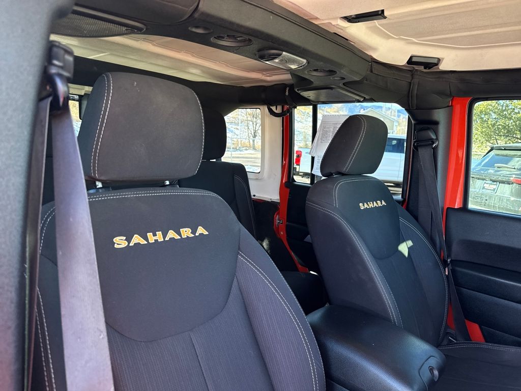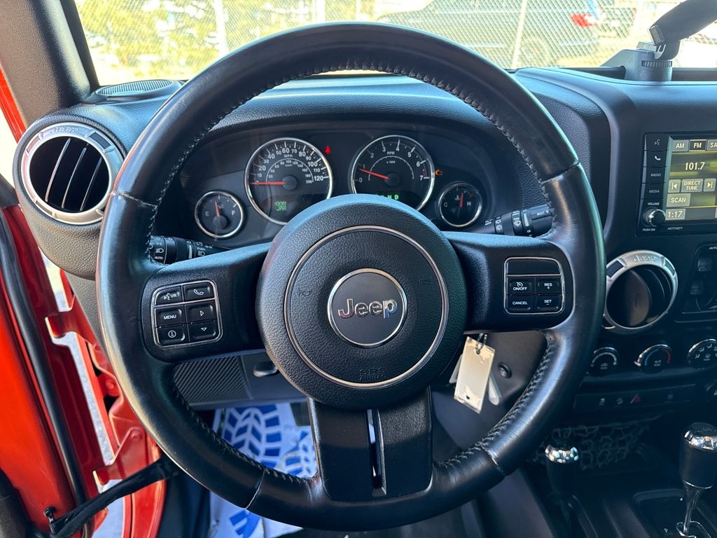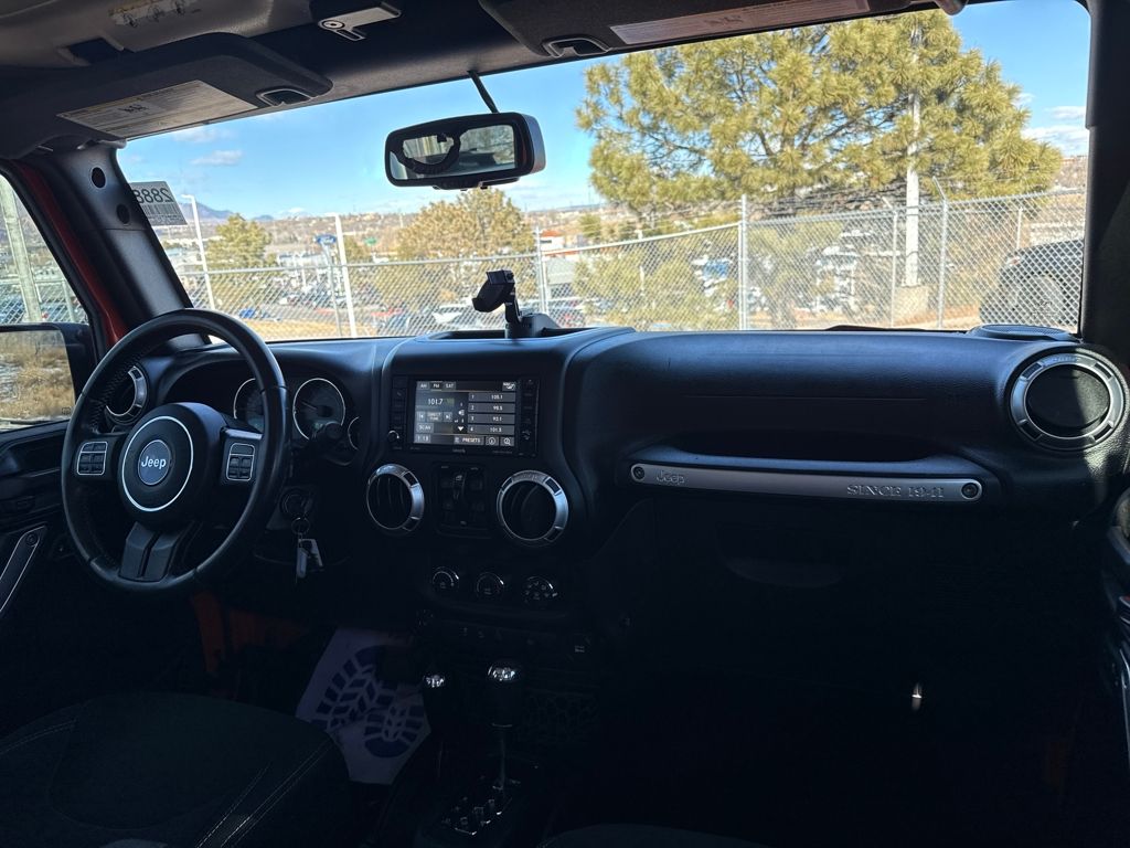 Connectivity Group (Tire Pressure Monitoring Display and Vehicle Information Center), Quick Order Package 24G, 18" x 7.5" Polished Satin Carbon Wheels, 3.21 Rear Axle Ratio, 4-Wheel Disc Brakes, 40GB Hard Drive w/28GB Available, 5-Year SIRIUSXM Travel Link Service, 6.5" Touch Screen Display, 8 Speakers, ABS brakes, Air Conditioning, Alloy wheels, Alpine 9-Speaker w/All Weather Subwoofer, AM/FM radio, Audio Jack Input for Mobile Devices, Auto-dimming Rear-View mirror, Brake assist, CD player, Cloth Bucket Seats, Compass, Driver door bin, Driver vanity mirror, Dual front impact airbags, Electronic Stability Control, Front anti-roll bar, Front Bucket Seats, Front Center Armrest w/Storage, Front fog lights, Front reading lights, Fully automatic headlights, GPS Navigation, Heated door mirrors, Heavy Duty Suspension w/Gas Shocks, Illuminated entry, Integrated roll-over protection, Leather steering wheel, Leather Wrapped Steering Wheel, Low tire pressure warning, Occupant sensing airbag, Outside temperature display, Panic alarm, Passenger door bin, Passenger vanity mirror, Power door mirrors, Power steering, Power windows, Radio data system, Radio: Uconnect 130 AM/FM/CD/MP3, Radio: Uconnect 430N CD/DVD/MP3/HDD/NAV, Rear anti-roll bar, Remote keyless entry, Remote Start System, Remote USB Port, Security system, SIRIUSXM Travel Link, Speed control, Split folding rear seat, Steering wheel mounted audio controls, Sunrider Soft Top, Tachometer, Tilt steering wheel, Traction control, Trip computer, and Variably intermittent wipers.