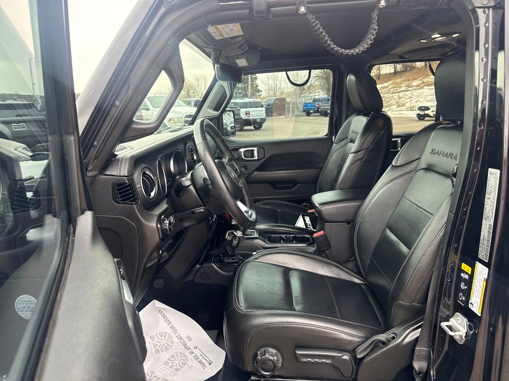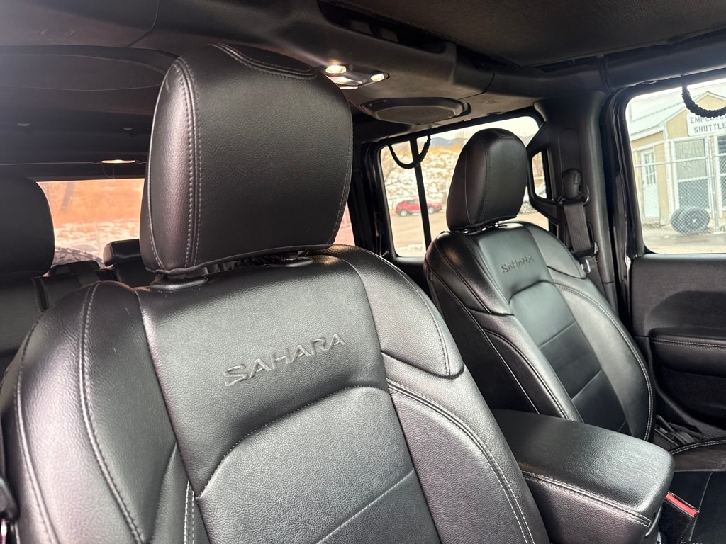 2.0L I4 DOHC, ABS brakes, Alloy wheels, Compass, Electronic Stability Control, Front dual zone A/C, Heated door mirrors, Illuminated entry, Low tire pressure warning, Navigation System, ParkView Rear Back-Up Camera, Passenger door bin, Remote keyless entry, Traction control, 3.73 Rear Axle Ratio, 4-Wheel Disc Brakes, 9 Speakers, Air Conditioning, AM/FM radio, Apple CarPlay/Android Auto, Auto-dimming Rear-View mirror, Automatic temperature control, Brake assist, Delay-off headlights, Driver door bin, Driver vanity mirror, Dual front impact airbags, Dual front side impact airbags, Emergency communication system: SiriusXM Guardian, Front anti-roll bar, Front Bucket Seats, Front Center Armrest w/Storage, Front fog lights, Front reading lights, Fully automatic headlights, Garage door transmitter, Integrated roll-over protection, Leather Shift Knob, Leather steering wheel, Leather Trimmed Seats w/Sahara Logo, Leather Wrapped Park Brake Handle, Occupant sensing airbag, Outside temperature display, Panic alarm, Passenger vanity mirror, Power door mirrors, Power steering, Power windows, Radio data system, Radio: Uconnect 4C Nav w/8.4" Display, Rear anti-roll bar, Rear reading lights, Rear seat center armrest, Security system, Speed control, Split folding rear seat, Sport Suspension, Steering wheel mounted audio controls, Tachometer, Telescoping steering wheel, Tilt steering wheel, Trip computer, Variably intermittent wipers, Voltmeter, and Wheels: 20" x 8" Fully Painted Aluminum.