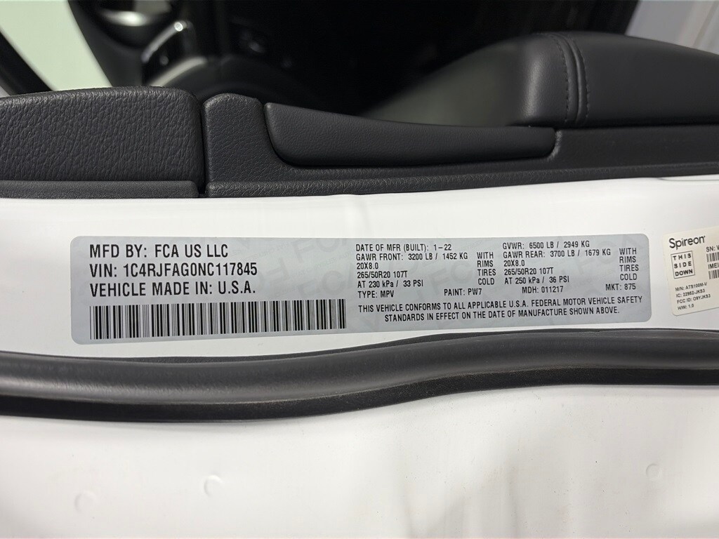 QUICK ORDER PACKAGE 2GM LAREDO X Engine: 3.6L V6 24V VVT UPG I w/ESS, Transmission: 8-Speed Automatic (8HP50), Remote Start System, 115V Auxiliary Power Outlet, Universal Garage Door Opener, Heated Front Seats, Heated Steering Wheel, Power Liftgate, Security Alarm, ALTITUDE APPEARANCE PACKAGE Body Color Fascia, Front Accent/Body Color Fascia, Rear Fascia Black Molded in Color Step Pad, Body Color Shark Fin Antenna, Rear Accent/Body Color Fascia, Single Exhaust w/Bright Tip, Dark Headlamp Bezel Finish, Body Color Claddings, Delete Laredo Badge, Altitude Grille, Dark Day Light Opening Moldings, Gloss Black Rear Fascia Applique, Wheels: 20 x 8.0 Gloss Black Aluminum, Dark Lens Taillamps, Selec-Terrain System, Tires: 265/50R20 BSW A/S LRR, Quadra-Trac II 4WD System, Hill Descent Control, Gloss Black Jeep Badging, POWER SUNROOF, TRANSMISSION: 8-SPEED AUTOMATIC (8HP50), ENGINE: 3.6L V6 24V VVT UPG I W/ESS (STD). Jeep Laredo X with Bright White Clearcoat exterior and Black interior features a V6 Cylinder Engine with 293 HP at 6400 RPM*.
