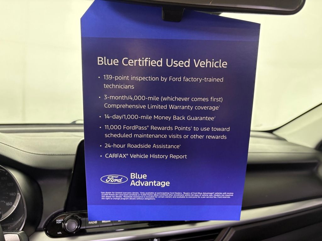 Ford Blue Certified includes:139 point vehicle inspection performed by an ASE Certified technician 3-month/4,000-mile Comprehensive Limited Warranty coverage that is fully competitive with other online retailers Blue Certification includes 11,000 FordPass Rewards Points For other manufacturers not listed above, Comprehensive Coverage is provided for 3 months or 4,000 miles, whichever comes first, from the signature date of the Ford Blue Advantage â" Blue Certified purchase. Comprehensive Limit