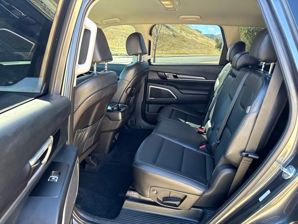 3rd row seats: split-bench, Driver door bin, Driver vanity mirror, Heated door mirrors, Navigation System, Panic alarm, Passenger door bin, Power steering, Power windows, Rear audio controls, Reclining 3rd row seat, Remote keyless entry, Security system, Spoiler, 3.510 Axle Ratio, 4-Wheel Disc Brakes, 6 Speakers, ABS brakes, Air Conditioning, Alloy wheels, AM/FM radio: SiriusXM, Apple CarPlay & Android Auto, Auto High-beam Headlights, Automatic temperature control, Brake assist, Bumpers: body-color, Delay-off headlights, Dual front impact airbags, Dual front side impact airbags, Electronic Stability Control, Emergency communication system: 911 Connect, Exterior Parking Camera Rear, Four wheel independent suspension, Front anti-roll bar, Front Bucket Seats, Front Center Armrest, Front dual zone A/C, Front reading lights, Fully automatic headlights, Illuminated entry, Knee airbag, Leather steering wheel, Low tire pressure warning, Occupant sensing airbag, Outside temperature display, Overhead airbag, Overhead console, Passenger vanity mirror, Power door mirrors, Radio data system, Radio: AM/FM Display Audio System, Rear air conditioning, Rear anti-roll bar, Rear reading lights, Rear seat center armrest, Rear side impact airbag, Rear window defroster, Rear window wiper, Smart Key w/ Push Button and Remote Start, Speed control, Speed-sensing steering, Split folding rear seat, Steering wheel mounted audio controls, SynTex Synthetic Leather Seat Trim, Tachometer, Telescoping steering wheel, Tilt steering wheel, Traction control, Trip computer, Turn signal indicator mirrors, Variably intermittent wipers, and Wheels: 18" x 7.5" Silver Finish Alloy.