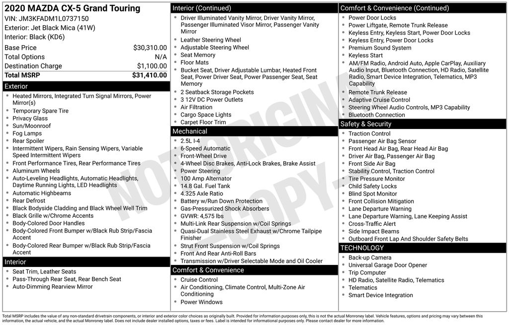 Jet Black Mica 2020 Mazda CX-5 Grand Touring FWD 6-Speed Automatic SKYACTIV® 2.5L 4-Cylinder DOHC 16V 25/31 City/Highway MPG