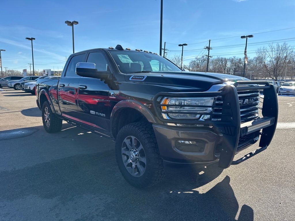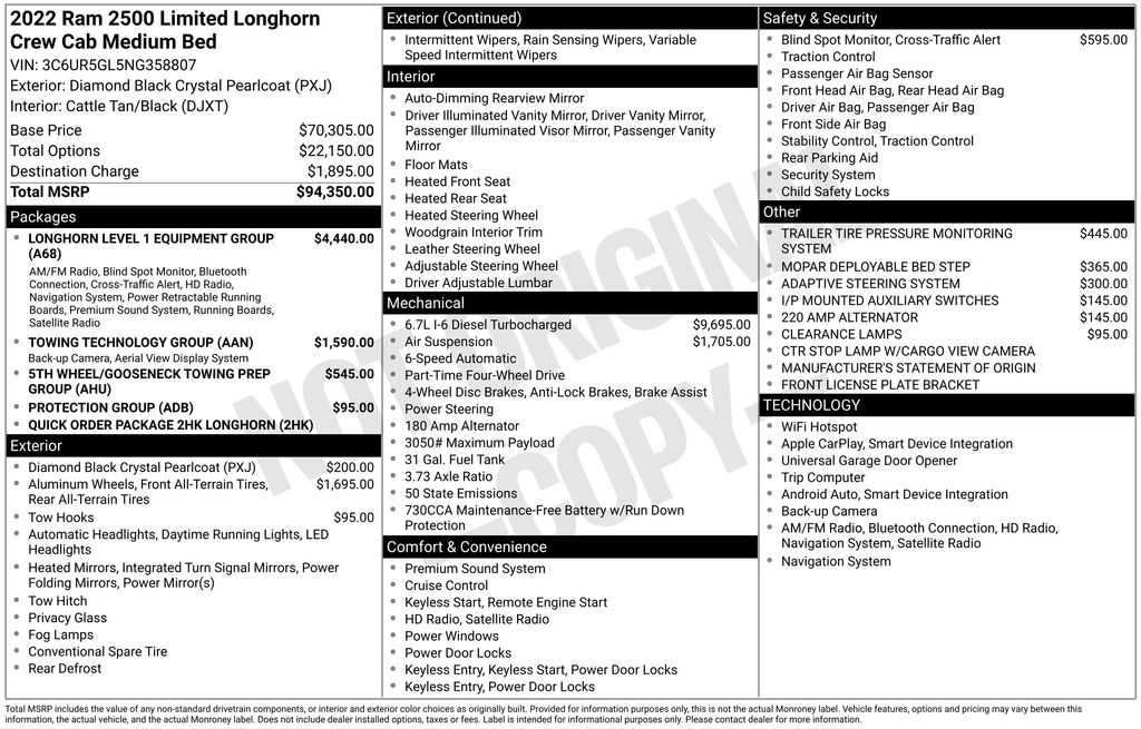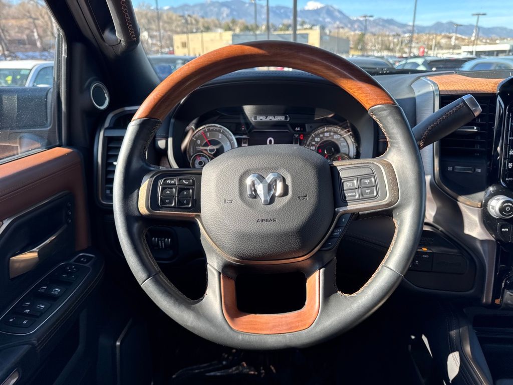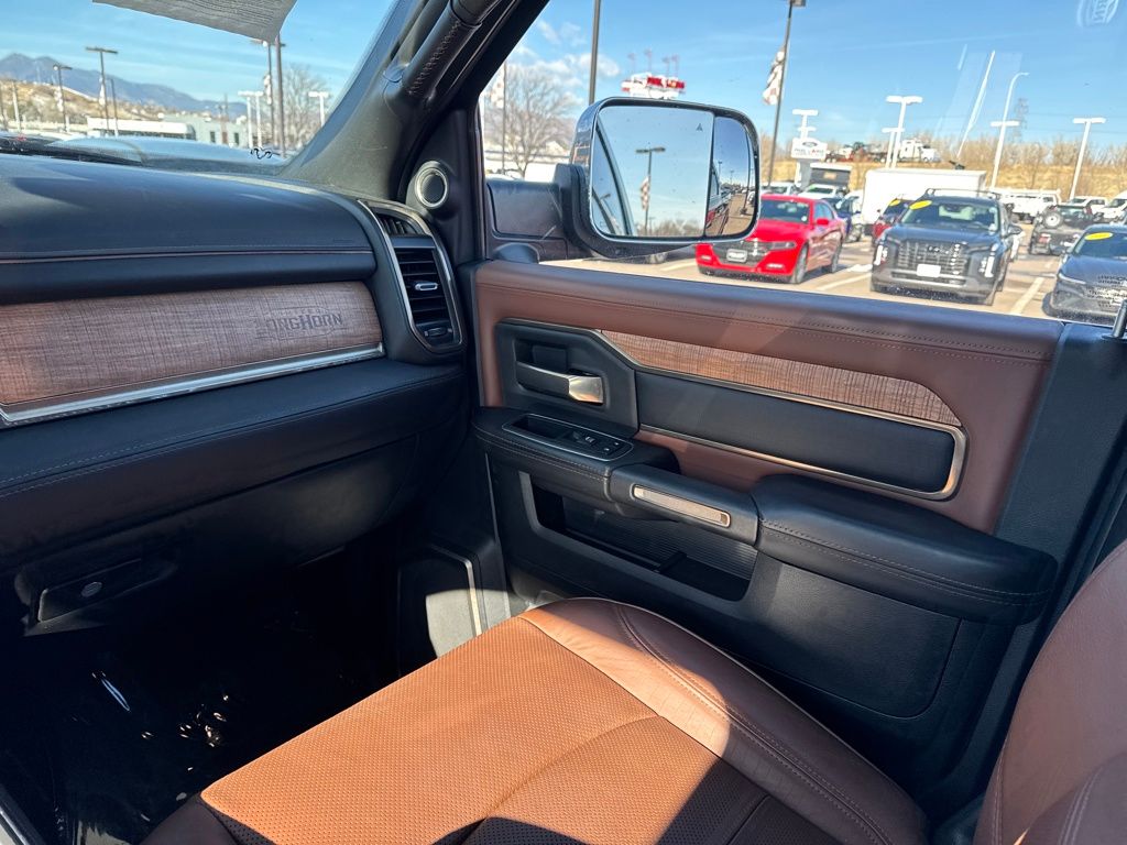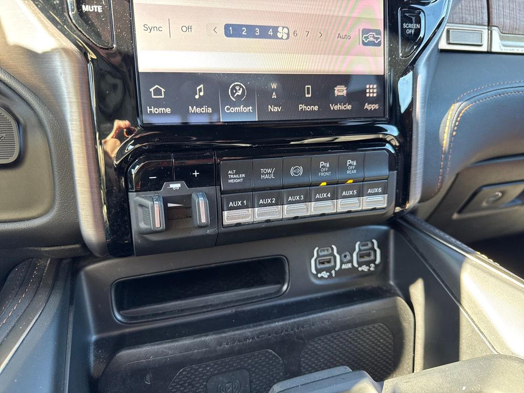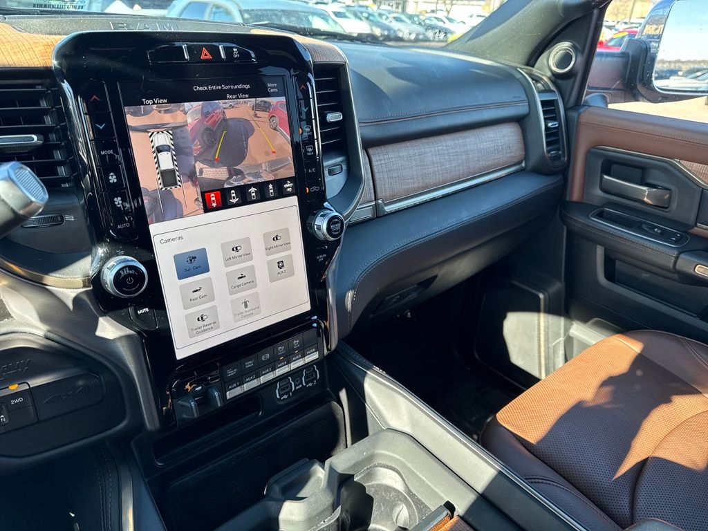 Longhorn Level 1 Equipment Group (12" Touchscreen Display, 17 Speaker harman kardon Premium Sound, 4G LTE Wi-Fi Hot Spot, Alexa Built-In, All R1 High Radios, All Radio Equipped Vehicles, Apple CarPlay, Connected Travel & Traffic Services, Connectivity - US/Canada, Disassociated Touchscreen Display, For Details, Visit DriveUconnect.com, For More Info, Call 800-643-2112, Global Telematics Box Module (TBM), Google Android Auto, GPS Antenna Input, GPS Navigation, HD Radio, Integrated Voice Command w/Bluetooth, Off-Road Information Pages, Power Deployable Running Boards, Radio: Uconnect 5 Nav w/12.0" Display, Ramcharger Wireless Charging Pad, Selectable Tire Fill Alert, SiriusXM Radio Service, and SiriusXM w/360L), Protection Group, Quick Order Package 2HK Longhorn, Towing Technology Group (CTR Stop Lamp w/Cargo View Camera, Surround View Camera System, and Trailer Reverse Guidance), 10 Speakers, 115V Auxiliary Rear Power Outlet, 2 Way Rear Headrest Seat, 220 Amp Alternator, 3.73 Axle Ratio, 4 Way Front Headrests, 4-Wheel Disc Brakes, 5th Wheel/Gooseneck Towing Prep Group, 8.4" Touchscreen Display, ABS brakes, Active Noise Control System, Adaptive Steering System, Adjustable pedals, Air Conditioning, Air Suspension Decal, Alloy wheels, AM/FM radio: SiriusXM with 360L, Apple CarPlay/Android Auto, Audio memory, Auto High-beam Headlights, Auto Level Rear Air Suspension, Auto-dimming Rear-View mirror, Automatic temperature control, Blind Spot & Cross Path Detection (DISC), Brake assist, Bucket Seats, Bumpers: chrome, Center Hub, Chrome Tow Hooks, Clearance Lamps, Compass, Dash Pass Thru Wire Circuits, Delay-off headlights, Driver door bin, Driver vanity mirror, Dual front impact airbags, Dual front side impact airbags, Electronic Stability Control, Electronically Controlled Throttle, Folding Flat Load Floor Storage, Front anti-roll bar, Front Bucket Seats, Front Center Armrest w/Storage, Front dual zone A/C, Front fog lights, Front License Plate Bracket, Front reading lights, Front Seat Back Map Pockets, Full Length Premium Upgraded Floor Console, Fully automatic headlights, Garage door transmitter, Genuine wood console insert, Genuine wood dashboard insert, Genuine wood door panel insert, Heated door mirrors, Heated Front Seats, Heated front seats, Heated rear seats, Heated Second Row Seats, Heated Steering Wheel, Heated steering wheel, High Back Seats, I/P Mounted Auxiliary Switches, Illuminated entry, Integrated Center Stack Radio, Leather steering wheel, Low tire pressure warning, Manufacturer's Statement of Origin, Memory seat, MOPAR Deployable Bed Step, Navigation System, Occupant sensing airbag, Outside temperature display, Overhead airbag, Overhead console, Panic alarm, ParkView Rear Back-Up Camera, Passenger door bin, Passenger vanity mirror, Pedal memory, Power 2-Way Driver Lumbar Adjust, Power 2-Way Passenger Lumbar Adjust, Power Adjust 8-Way Driver Seat, Power Adjust 8-Way Front Passenger Seat, Power door mirrors, Power driver seat, Power passenger seat, Power steering, Power windows, Premium Filigree Leather Seats, Radio data system, Radio: Uconnect 5 Nav w/8.4" Display, Radio/Driver Seat/Mirrors/Pedals Memory, Rain sensing wipers, Rear 60/40 Folding Seat, Rear anti-roll bar, Rear reading lights, Rear seat center armrest, Rear step bumper, Rear window defroster, Remote keyless entry, Security system, Speed control, Split folding rear seat, Steering wheel mounted audio controls, Tachometer, Tilt steering wheel, Tip Start, Traction control, Trailer Tire Pressure Monitoring System, Trip computer, Turn signal indicator mirrors, Variably intermittent wipers, Vendor Painted Cargo Box, Vendor Painted Cargo Box Tracking, Ventilated Front Seats, Ventilated front seats,