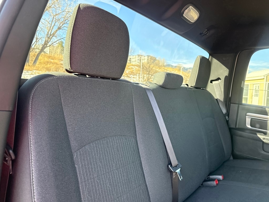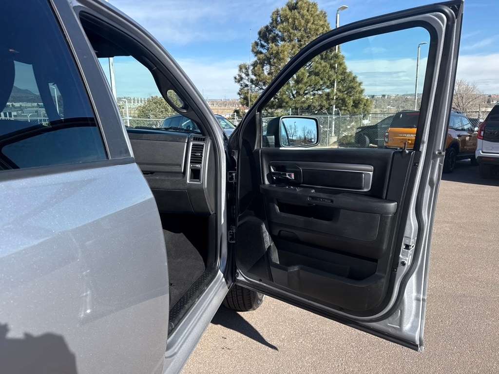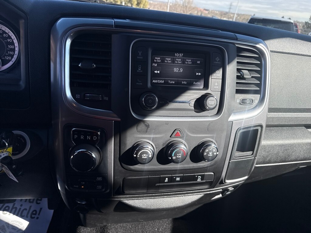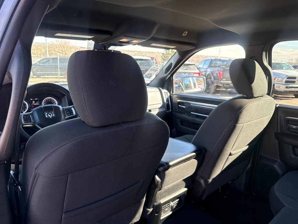 Quick Order Package 29F Warlock (4x4 Flat Black Badge, B-Pillar Black Out, Bi-Function Halogen Projector Headlamps, Black Exterior Truck Badging, Black Grille w/RAM Lettering, Black Headlamp Filler Panel, Black Powder Coated Front Bumper, Black Powder Coated Rear Bumper, Black RAM Head Tailgate Badge, Black Wheel Flares, Front Wheel Well Liners, ParkSense Rear Park Assist System, Raised Ride Height, Rear Extra HD Shock Absorbers, Semi-Gloss Black Hub, Sport Tail Lamps, Warlock, Warlock Interior Accents, and Wheels: 20" x 9" High Gloss Black Aluminum), 17" x 7" Aluminum Wheels, 3.21 Rear Axle Ratio, 4-Wheel Disc Brakes, 40/20/40 Split Bench Seat, 6 Speakers, ABS brakes, Active Grille Shutters, Air Conditioning, Alloy wheels, AM/FM radio: SiriusXM, Audio Input Jack for Mobile Devices, Black Exterior Mirrors, Brake assist, Bumpers: chrome, Center Hub, Cloth 40/20/40 Bench Seat, Compass, Delay-off headlights, Driver door bin, Dual front impact airbags, Dual front side impact airbags, Electronic Shift, Electronic Stability Control, Exterior Mirrors w/Heating Element, Front anti-roll bar, Front Armrest w/3 Cupholders, Front Center Armrest w/Storage, Front License Plate Bracket, Front reading lights, Front wheel independent suspension, Fully automatic headlights, GPS Antenna Input, Heated door mirrors, Illuminated entry, Integrated Voice Command w/Bluetooth, Low tire pressure warning, Manufacturer's Statement of Origin, Occupant sensing airbag, Outside temperature display, Overhead airbag, Overhead console, Panic alarm, ParkView Rear Back-Up Camera, Passenger door bin, Passenger vanity mirror, Power door mirrors, Power steering, Power windows, Radio data system, Radio: Uconnect 3 w/5" Display, Rear anti-roll bar, Rear seat center armrest, Rear step bumper, Remote keyless entry, Remote USB Port, Remote USB Port - Charge Only, Speed control, Storage Tray, Tachometer, Tilt steering wheel, Tip Start, Traction control, Trip computer, Variably intermittent wipers, and Voltmeter.