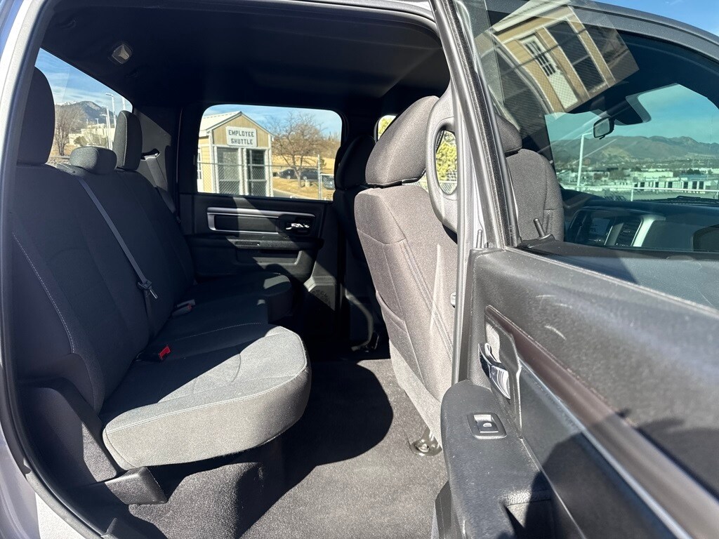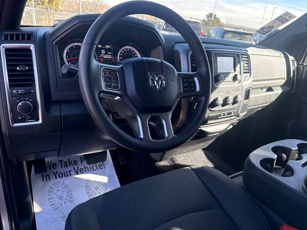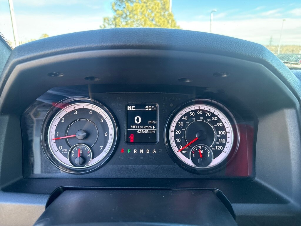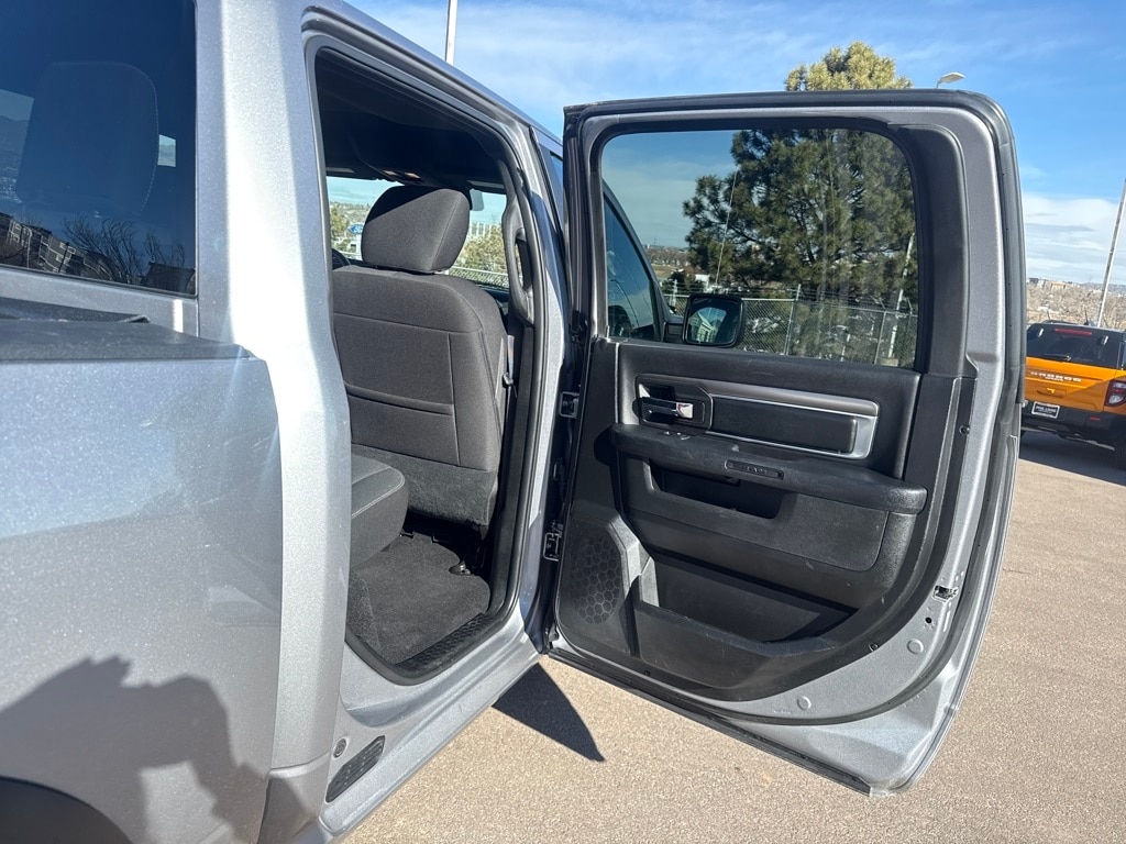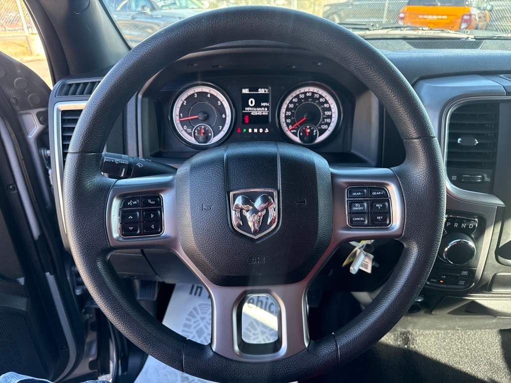 Quick Order Package 29F Warlock (4x4 Flat Black Badge, B-Pillar Black Out, Bi-Function Halogen Projector Headlamps, Black Exterior Truck Badging, Black Grille w/RAM Lettering, Black Headlamp Filler Panel, Black Powder Coated Front Bumper, Black Powder Coated Rear Bumper, Black RAM Head Tailgate Badge, Black Wheel Flares, Front Wheel Well Liners, ParkSense Rear Park Assist System, Raised Ride Height, Rear Extra HD Shock Absorbers, Semi-Gloss Black Hub, Sport Tail Lamps, Warlock, Warlock Interior Accents, and Wheels: 20" x 9" High Gloss Black Aluminum), 17" x 7" Aluminum Wheels, 3.21 Rear Axle Ratio, 4-Wheel Disc Brakes, 40/20/40 Split Bench Seat, 6 Speakers, ABS brakes, Active Grille Shutters, Air Conditioning, Alloy wheels, AM/FM radio: SiriusXM, Audio Input Jack for Mobile Devices, Black Exterior Mirrors, Brake assist, Bumpers: chrome, Center Hub, Cloth 40/20/40 Bench Seat, Compass, Delay-off headlights, Driver door bin, Dual front impact airbags, Dual front side impact airbags, Electronic Shift, Electronic Stability Control, Exterior Mirrors w/Heating Element, Front anti-roll bar, Front Armrest w/3 Cupholders, Front Center Armrest w/Storage, Front License Plate Bracket, Front reading lights, Front wheel independent suspension, Fully automatic headlights, GPS Antenna Input, Heated door mirrors, Illuminated entry, Integrated Voice Command w/Bluetooth, Low tire pressure warning, Manufacturer's Statement of Origin, Occupant sensing airbag, Outside temperature display, Overhead airbag, Overhead console, Panic alarm, ParkView Rear Back-Up Camera, Passenger door bin, Passenger vanity mirror, Power door mirrors, Power steering, Power windows, Radio data system, Radio: Uconnect 3 w/5" Display, Rear anti-roll bar, Rear seat center armrest, Rear step bumper, Remote keyless entry, Remote USB Port, Remote USB Port - Charge Only, Speed control, Storage Tray, Tachometer, Tilt steering wheel, Tip Start, Traction control, Trip computer, Variably intermittent wipers, and Voltmeter.