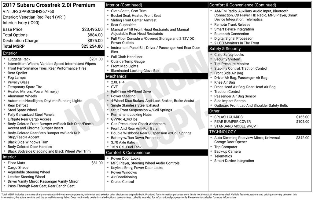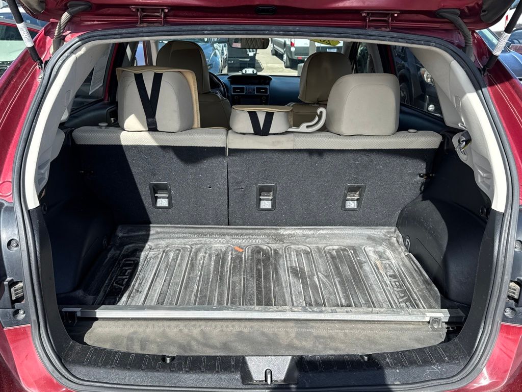 Standard Model w/CVT, 17" x 7.0J Aluminum Alloy Wheels, 3.70 Axle Ratio, 4-Wheel Disc Brakes, 6 Speakers, ABS brakes, Aero Cross Bar Set, Air Conditioning, All Weather Floor Mats, Alloy wheels, AM/FM radio, Auto-Dimming Mirror w/Compass & HomeLink, Brake assist, Bumpers: body-color, CD player, Cloth Upholstery, Driver door bin, Driver vanity mirror, Dual front impact airbags, Dual front side impact airbags, Electronic Stability Control, Emergency communication system, Exterior Parking Camera Rear, Four wheel independent suspension, Front anti-roll bar, Front Bucket Seats, Front Center Armrest, Front fog lights, Front reading lights, Heated door mirrors, Heated Front Bucket Seats, Heated front seats, Illuminated entry, Knee airbag, Leather Shift Knob, Low tire pressure warning, Occupant sensing airbag, Outside temperature display, Overhead airbag, Panic alarm, Passenger door bin, Passenger vanity mirror, Power door mirrors, Power steering, Power windows, Radio data system, Radio: Subaru Starlink 6.2" Multimedia System, Rear anti-roll bar, Rear Bumper Cover, Rear Vision Camera, Rear window defroster, Rear window wiper, Remote keyless entry, Roof rack: rails only, Security system, Speed control, Speed-sensing steering, Splash Guards, Split folding rear seat, Spoiler, Steering wheel mounted audio controls, Tachometer, Telescoping steering wheel, Tilt steering wheel, Traction control, Trip computer, and Variably intermittent wipers.