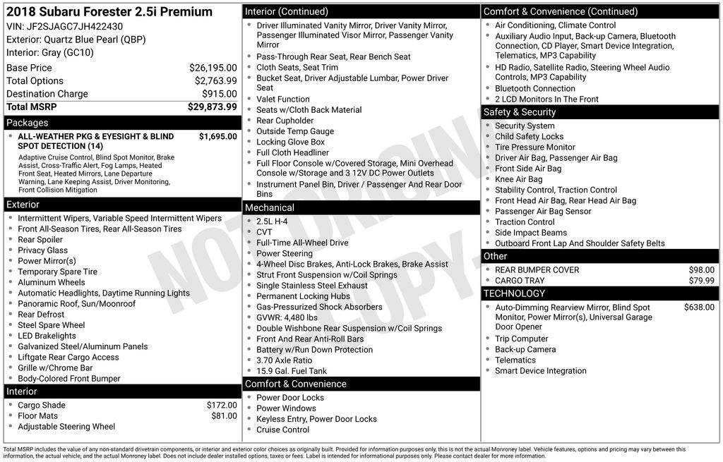Odometer is 13128 miles below market average! Quartz Blue Pearl 2018 Subaru Forester 2.5i Premium AWD Lineartronic CVT 2.5L 4-Cylinder DOHC 16V VVT 26/32 City/Highway MPG